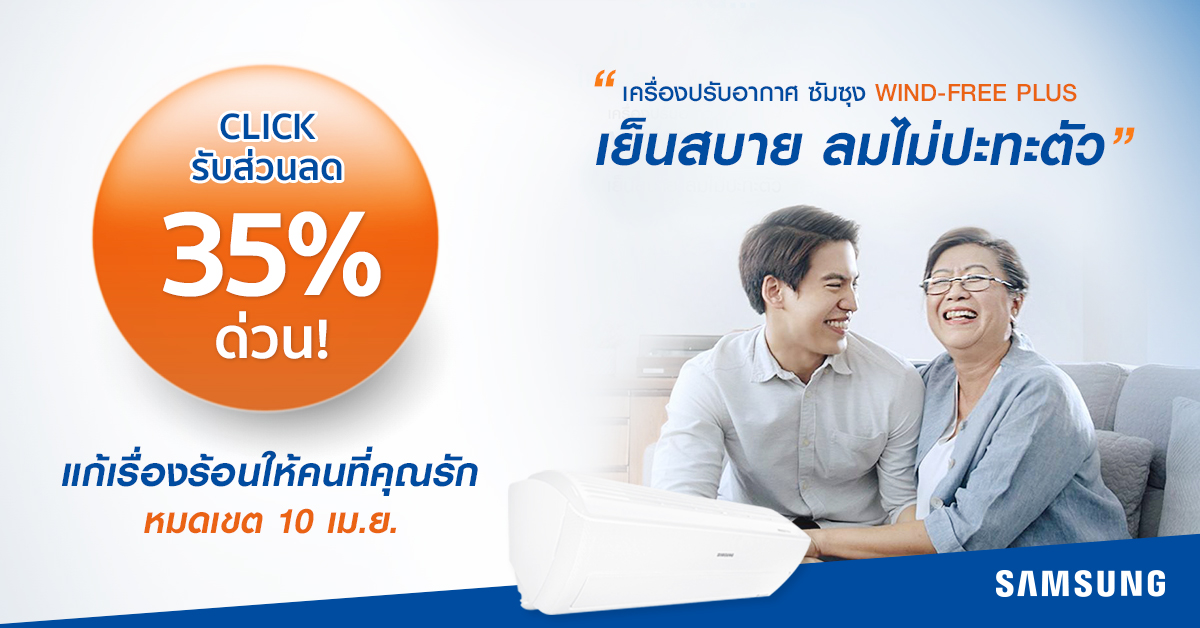 เพราะเราเชื่อว่าสุขภาพที่ดีนั้นส่งผลโดยตรงต่ออารมณ์ Samsung จึงไม่หยุดนิ่งในการพัฒนานวัตกรรมความเย็นที่ครอบคลุมทุกการใช้งานไปจนถึงงานดีไซน์เพื่อดูแลคุณที่คุณรักตลอดไป และสิทธิพิเศษสำหรับคนพิเศษเช่นคุณ เมื่อคุณซื้อแอร์วันนี้เพื่อสุขภาพคนที่คุณรัก รับทันทีส่วนลดแอร์ 35% เมื่อ Click Banner เพื่อรับโค้ดส่วนลดแอร์! อย่าช้า! เพราะสุขภาพดีๆ รอนานไม่ได้