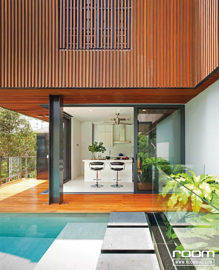 สถาปนิกออกแบบฟังก์ชันส่วนต่างๆในบ้านเย็นหลังนี้ให้ตอบสนองความต้องการของสมาชิกในครอบครัวที่มีไลฟ์สไตล์ต่างกัน กลายเป็นบ้านแฝดสองหลัง เว้นคอร์ตตรงกลางสําหรับทําเป็นสวนหย่อมเล็ก ๆ แล้วสร้างทางเชื่อมระหว่างตึกในแต่ละชั้น ความเป็นบล็อกสี่เหลี่ยมของอาคารอาจทําให้เกิดปัญหาความร้อน แต่สถาปนิกจัดการได้ด้วยการออกแบบให้มีหน้าต่างอยู่รอบบ้าน ช่วยระบายอากาศให้เย็นสบายตลอดทั้งวันแทบไม่ต้องเปิดเครื่องปรับอากาศเลย