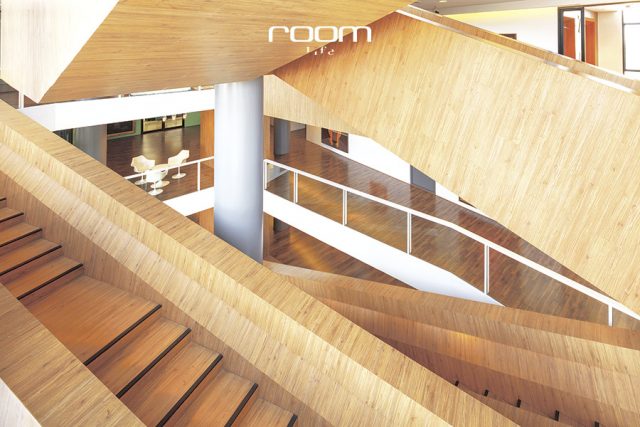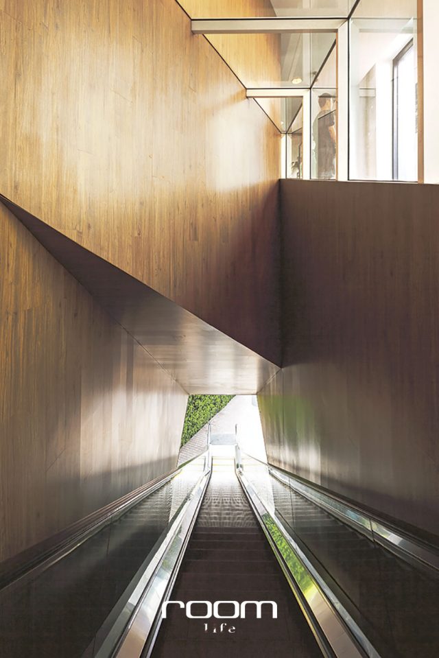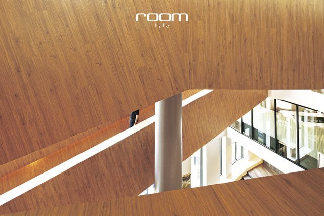 “ปกติแล้ววัสดุนี้จะใช้กรุบนพื้น ตอนอยู่บนพื้นเราอาจจะรู้สึกธรรมดา ๆ แต่พอนำมากรุยาวขึ้นไปจนถึงผนังและเพดานกลับช่วยสร้างความรู้สึกแปลกตาดูพิเศษขึ้น เหมือนตรงนี้เป็น “Material Hall” โชว์ผิววัสดุของบริษัทไปเลย”