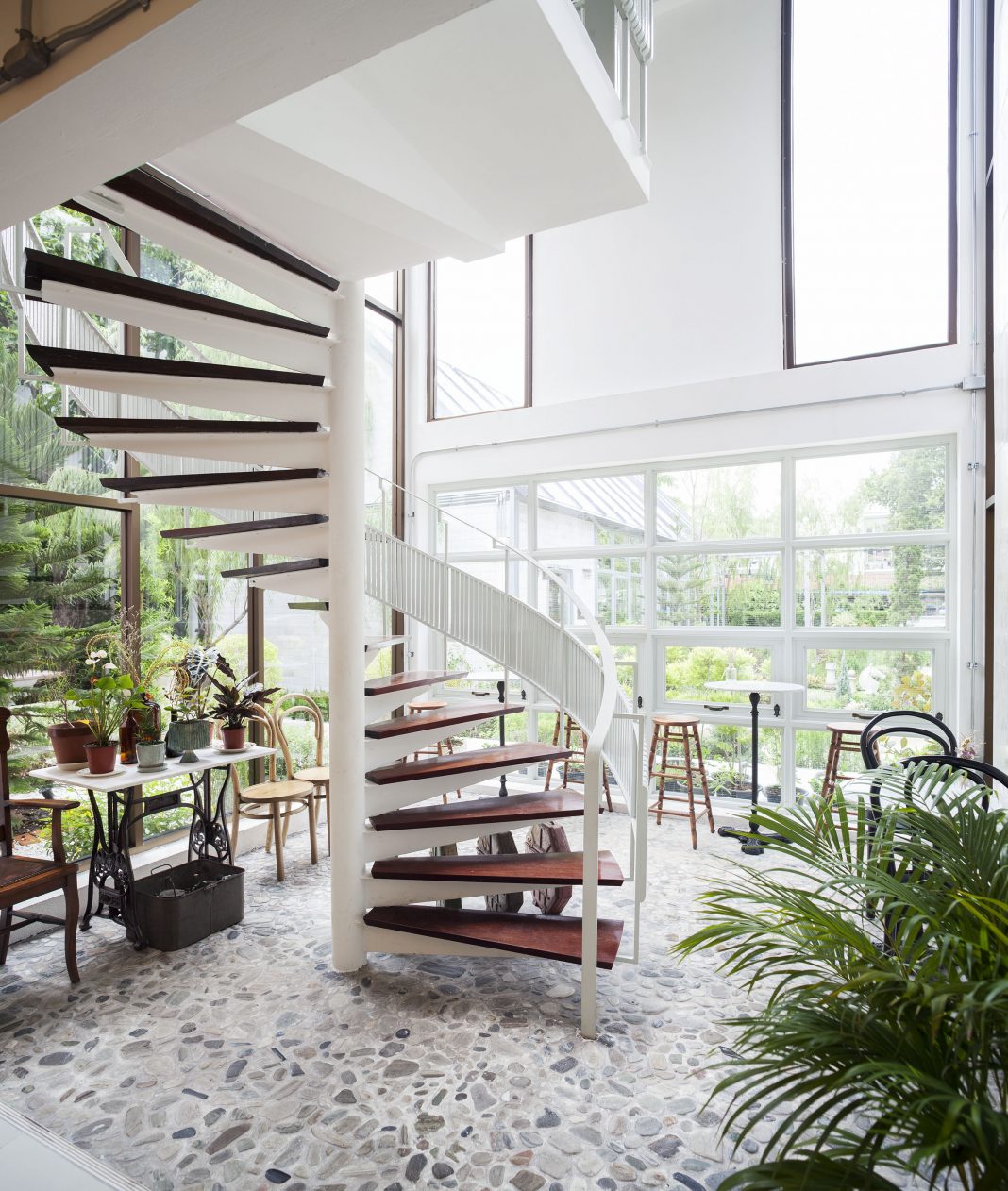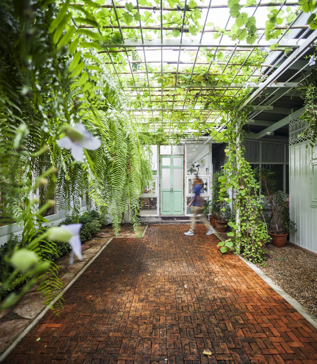 ภายในแบ่งพื้นที่ออกเป็นส่วนต่างๆ 2 ส่วนหลักคือ ส่วนตัวบ้านเก่า ที่ปรับเปลี่ยนให้กลายเป็นพื้นที่คาเฟ่ในบ้านเล็กๆท่ามกลางบรรยากาศอบอุ่น เป็นกันเอง ด้วยการเลือกใช้วัสดุอย่างไม้ผสมผสานกับการเล่นสีโทนสว่างอย่างขาว ทำให้ดูสะอาดตาเหมาะแก่การพักผ่อน และส่วนพื้นที่เอ๊าต์ดอร์บริเวณบ้าน ถูกเนรมิตให้กลายเป็นสวนแห่งความฝัน โดยมีแรงบันดาลใจจากนิยายในจินตนาการวัยเด็ก เพิ่มลูกเล่นของตกแต่งสวนอย่าง หมากรุกและกระดานบริเวณพื้นทางเดิน เกิดเป็นความลงตัวระหว่างพื้นที่สีเขียวกับอาคารเรือนกระจกหลังใหญ่สีขาวสไตล์โมเดิร์นวินเทจ ผสมผสานระหว่างโครงสร้างอินดัสเทรียลกับการตกแต่งแบบวินเทจ อย่างการเลือกใช้เฟอร์นิเจอร์และของตกแต่งเก่า และแทรกเอาธรรมชาติเข้ามาเป็นส่วนหนึ่งของอาคาร ประดับไม้แขวนและไม้ต้นเล็กสร้างบรรยากาศในเรือนกระจกให้กลายเป็นโรงเรือนหลังเล็ก