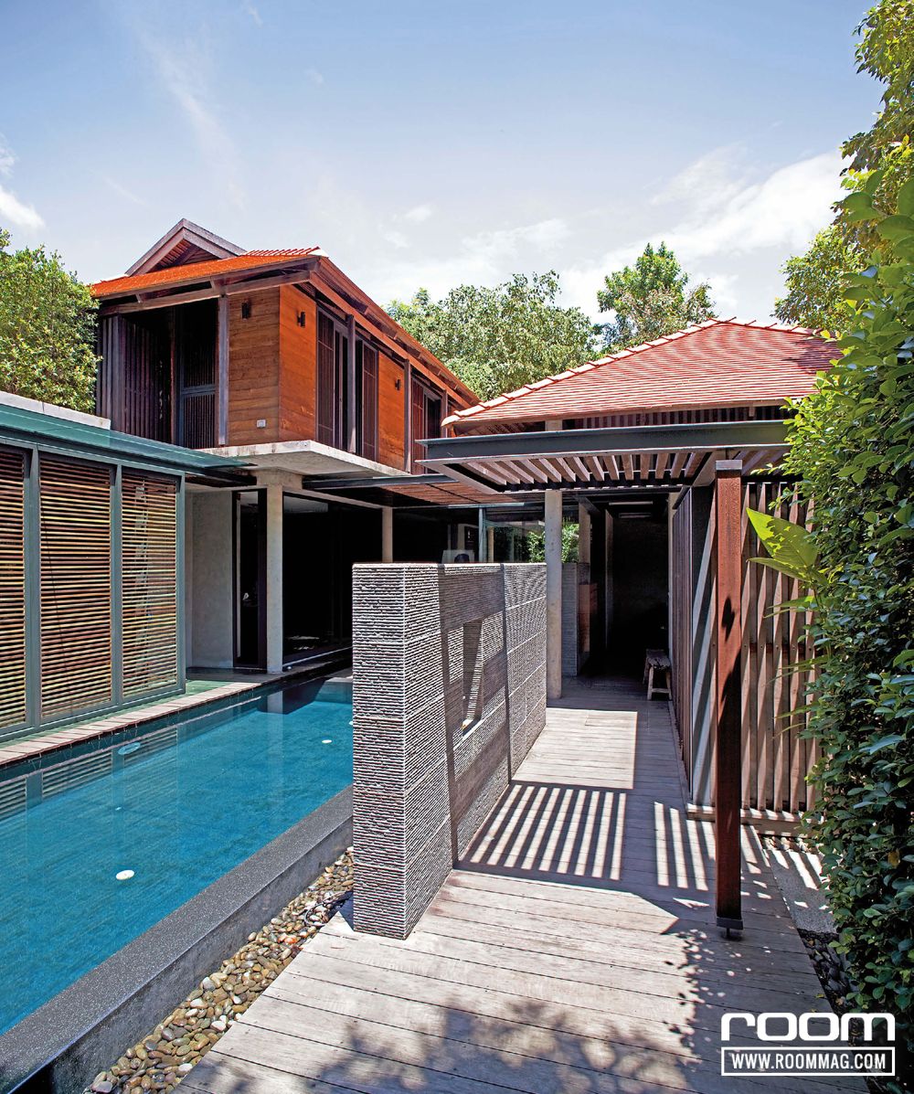 จากหน้าบ้านอาจยังไม่สามารถสัมผัสความร่มรื่นอะไรได้มากนัก แต่เมื่อเราเดินผ่านซุ้มประตูเข้าไปเรื่อย ๆ ก็เริ่มสัมผัสได้ถึงธรรมชาติจากไม้ระแนง ผนังดินอัด รวมถึงพื้นทางเดินปูแผ่นหิน และก้อนหินเล็ก ๆ ที่เป็นเหมือนด่านแรกช่วยปรับอารมณ์ และความรู้สึกให้ผ่อนคลายก่อนก้าวเข้าสู่ภายในที่มีสระว่ายน้ำยาวขนานไปกับตัวบ้านสไตล์โมเดิร์นทรอปิคัล ล้อมรอบด้วยสนามหญ้า และต้นไม้สีเขียวน้อยใหญ่ ให้บรรยากาศเย็นสบาย เงียบสงบ แตกต่างจากความวุ่นวายภายนอก