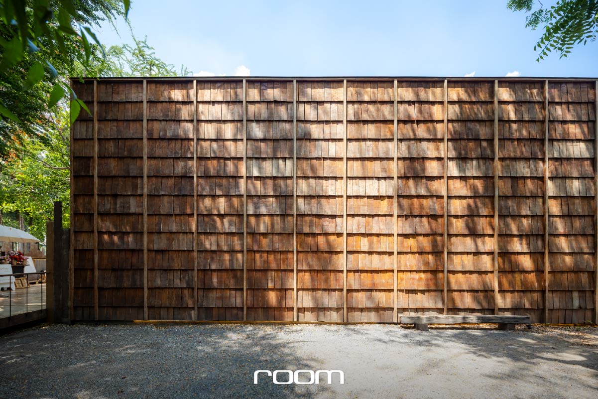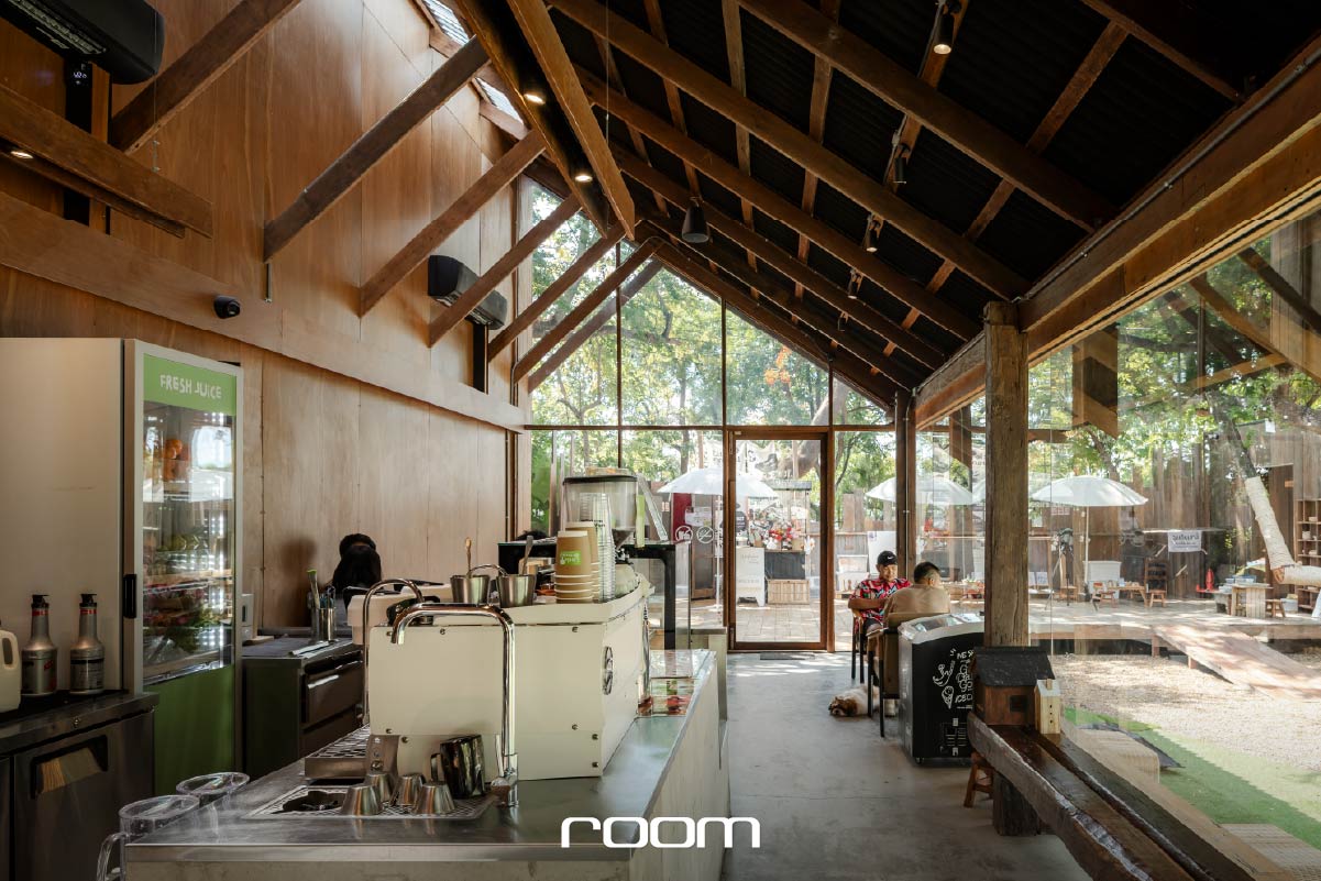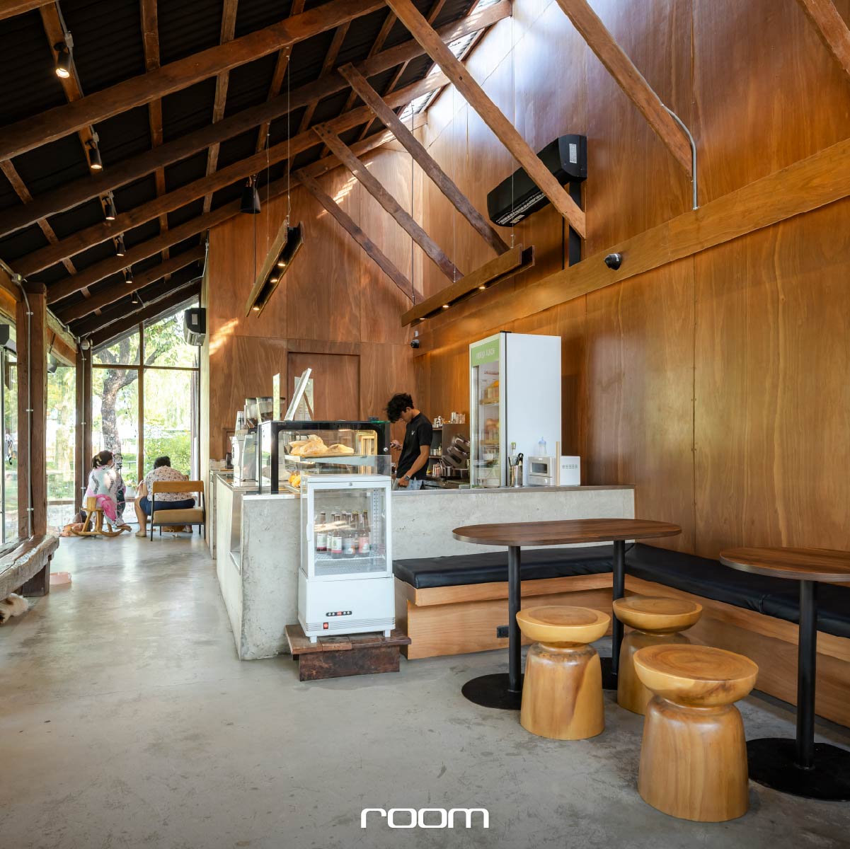 ส่วนของผนังฝั่งติดกับสวนกรุกระจกใสเต็มบานทั้งสามด้าน เพื่อเชื่อมต่อมุมมองออกไปยังชานด้านนอกและพื้นที่กลางแจ้ง ให้พ่อแม่สามารถเข้ามาสั่งเครื่องดื่มด้านในคาเฟ่ โดยยังคงมองเห็นลูก ๆ และสัตว์เลี้ยงของตนได้อย่างไม่ต้องกังวล พื้นที่ด้านในโปร่งโล่งด้วยความสูงของหลังคาที่ลาดเอียง ซึ่งมีระยะกว้างถึง 4.20 เมตร โดยเป็นโครงสร้างที่ไม่มีเสากลาง สถาปนิกจึงต้องมีค้ำยันไม้มารับโครงสร้างหลังคาอีกทีหนึ่ง จนกลายเป็นการสร้างคาแรกเตอร์ให้กับพื้นที่ภายในให้ดูพิเศษมากขึ้น