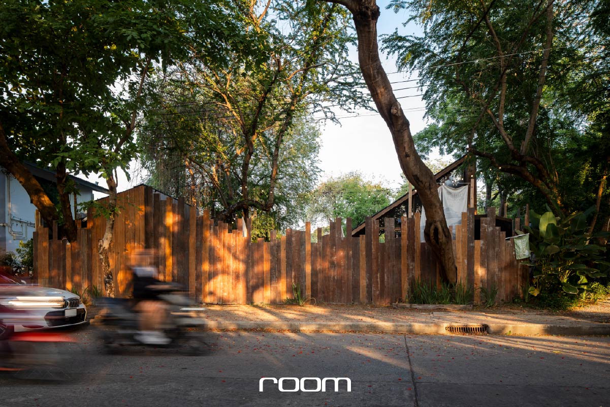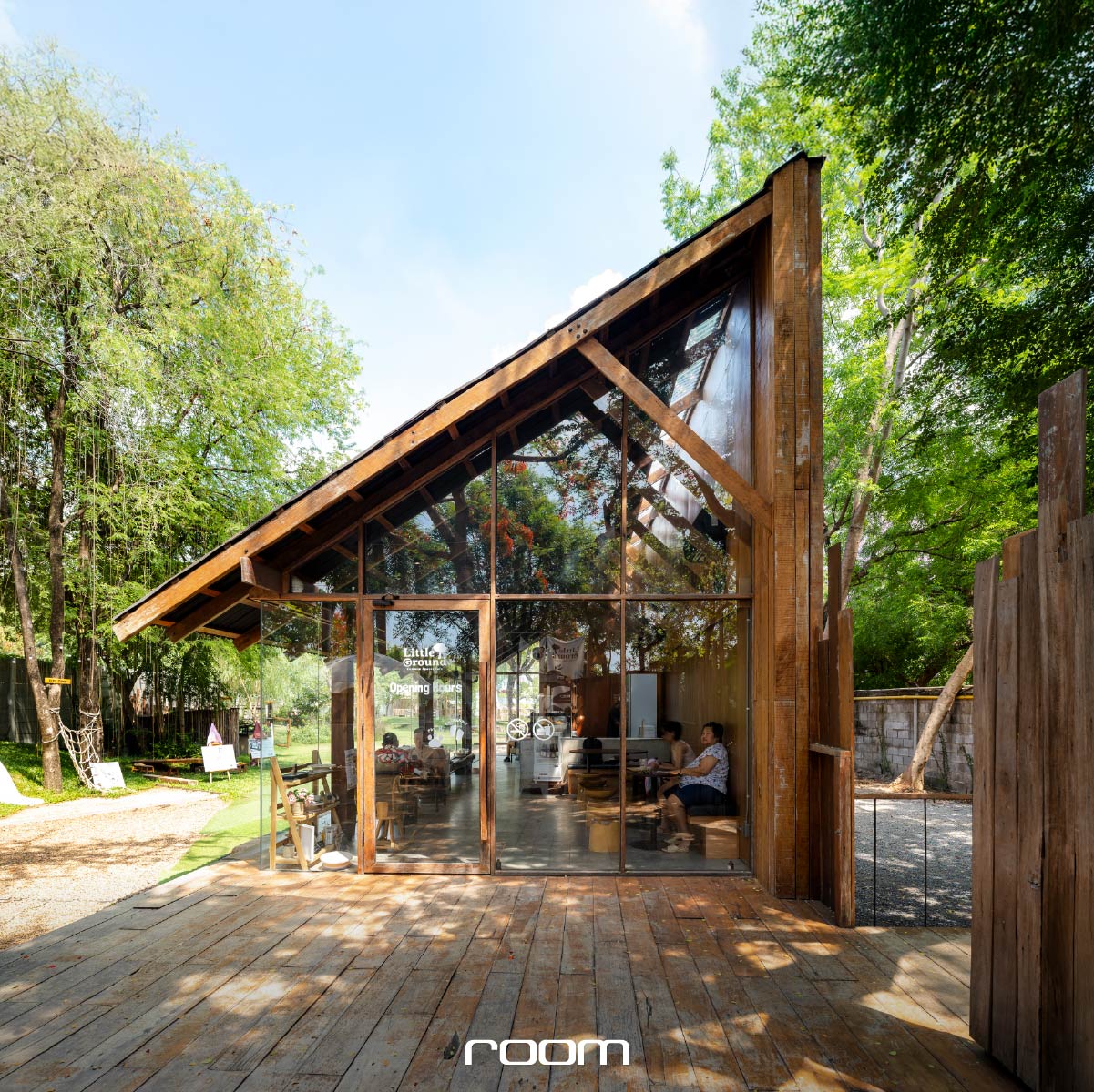 เมื่อเดินผ่านซุ้มต้นไม้เข้ามาจะพบกับอาคารไม้รูปทรงสามเหลี่ยมที่วางตัวบิดจากแนวที่ดินเล็กน้อย เพื่อให้เกิดเงาอาคารทอดลงไปในพื้นที่สวน เอื้อให้ช่วงบ่ายแดดไม่ร้อนเกินไปเด็ก ๆ สามารถวิ่งเล่นได้แบบไม่ร้อน ตัวอาคารคลุมโทนด้วยวัสดุไม้ให้ความรู้สึกธรรมชาติ ทั้งในส่วนของงานโครงสร้างและผนังด้านนอก รวมไปถึงกำแพงด้านหน้าถนน