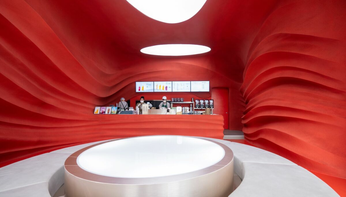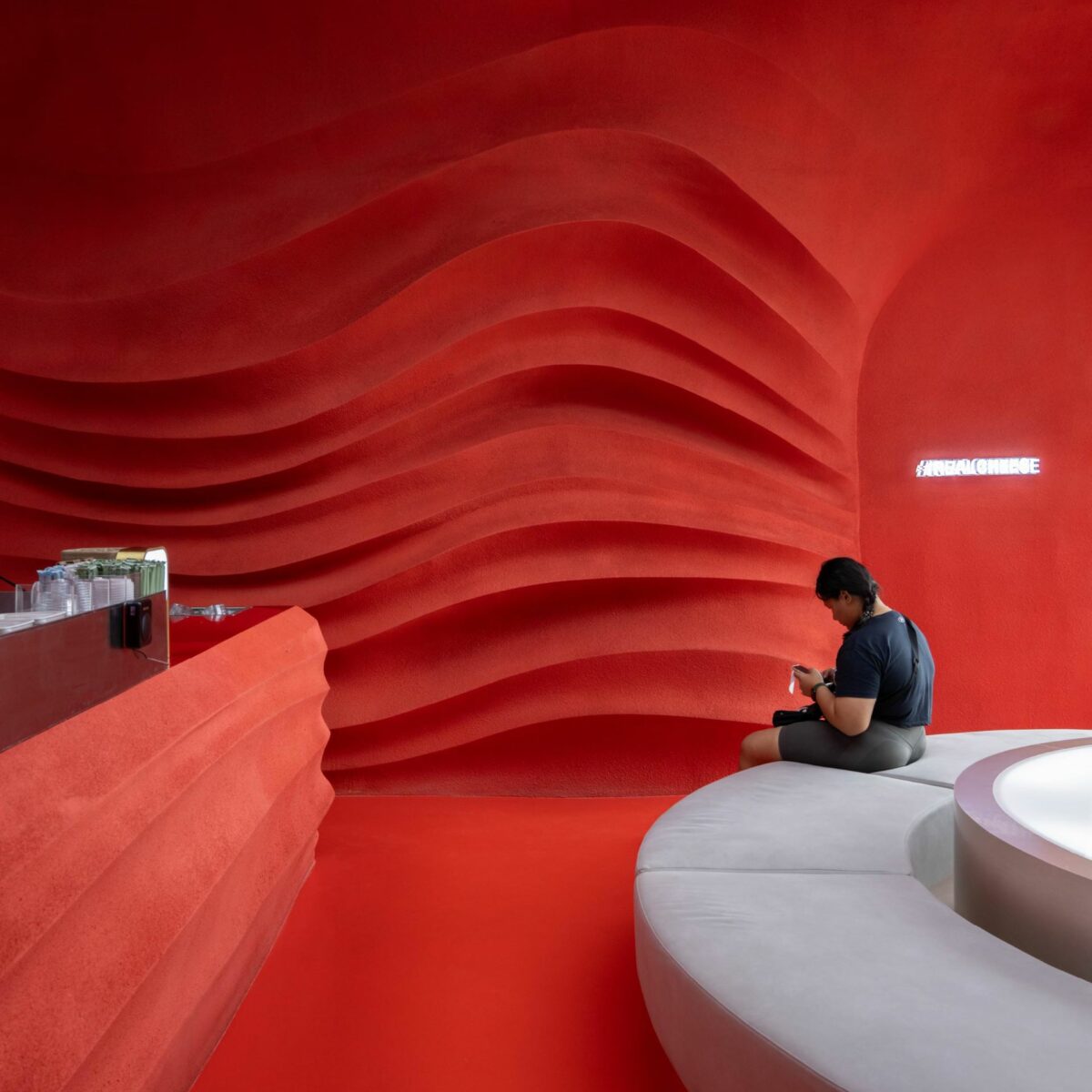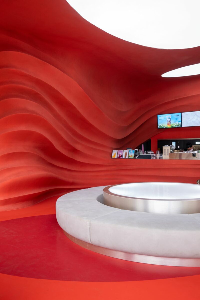 โดยที่เป้าหมายของผู้ออกแบบจาก Unknown Surface Studio ไม่ได้ต้องการแค่ให้ที่นี่เป็นแค่ร้านขายชา แต่คือการสร้างพื้นที่ทดลองของประสาทสัมผัส ที่แปลความละมุนของชาให้กลายเป็นรูปทรงที่จับต้องได้จริง ผสานแรงบันดาลใจมาจากเส้นสายของครีมชีสที่ไหลอย่างนุ่มนวล โดยได้ให้ความสนใจกับการเคลื่อนไหวอันอ่อนโยนนั้น ก่อนจะแปลออกมาเป็นภาษาทางสถาปัตยกรรมด้วยการสร้าง “Handcrafted Space” ที่ทุกเส้นโค้ง ทุกพื้นผิว ล้วนให้ความรู้สึกราวกับการรังสรรค์งานประติมากรรมทำขึ้นด้วยมืออย่างพิถีพิถัน เพื่อถ่ายทอดจิตวิญญาณแห่งการชงชาที่ต้องอาศัยทั้งความแม่นยำและความใส่ใจ