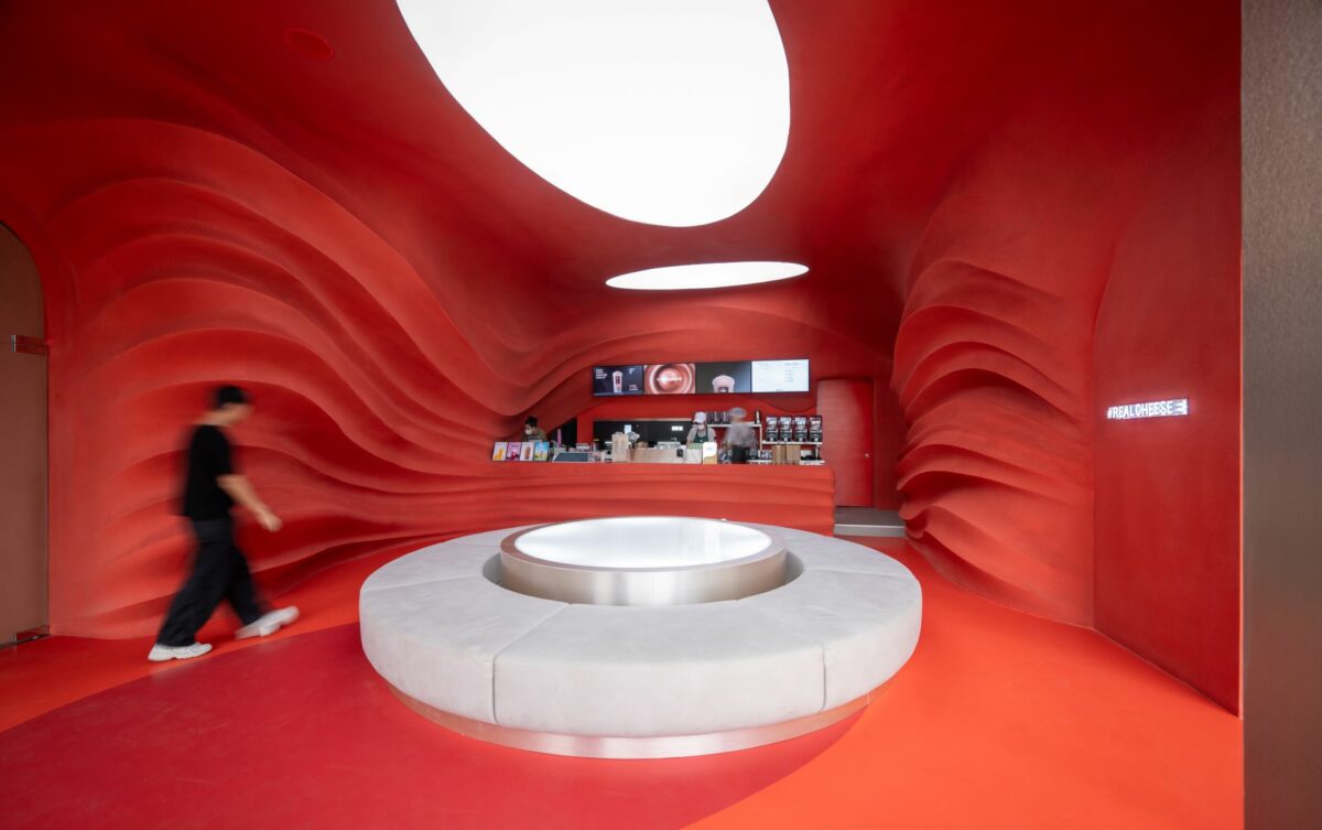 ใช้ผนังโค้งที่ต่อเนื่องเป็นตัวนำทางสายตาให้ลูกค้ารู้สึกเหมือนกำลังเดินตามรอยครีมชีสที่ไหลเอื่อยไปทั่วทั้งร้าน และเลือกใช้เทคนิคการทำสีบนพื้นผิวซึ่งมีเท็กซ์เจอร์หยาบแต่ละเอียดเนียนไร้รอยต่อ