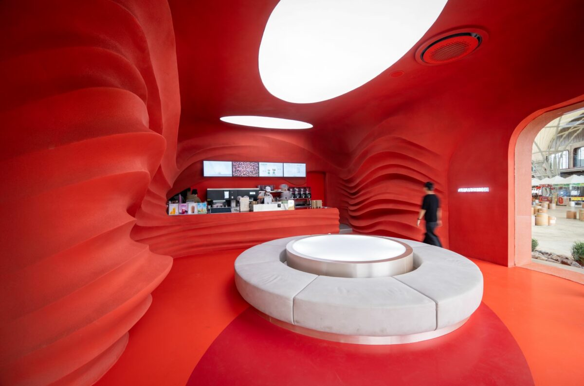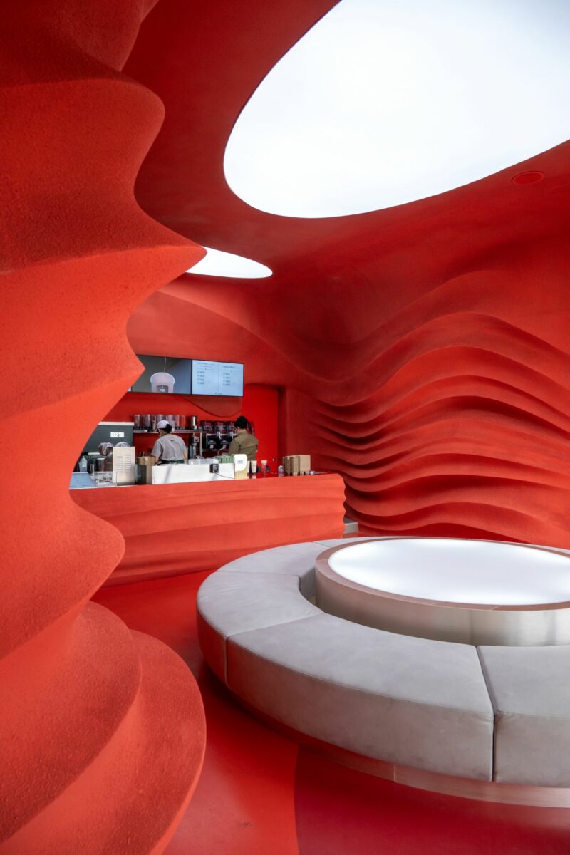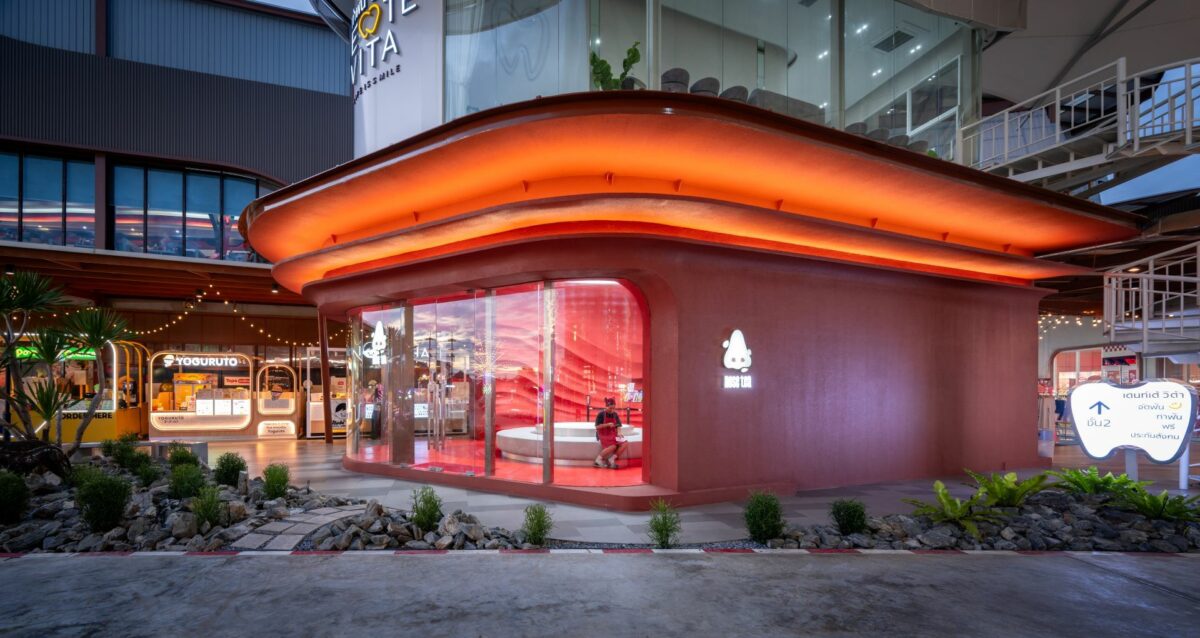 ตัวร้านมีพื้นที่ 100 ตารางเมตร ตั้งอยู่บนทำเลที่อยู่บริเวณหัวมุม ช่วยให้การออกแบบทำได้อย่างโดดเด่น ต่างจากร้านอื่น ๆ ด้วยสีแดงส้มสดใสสังเกตเห็นได้ง่าย