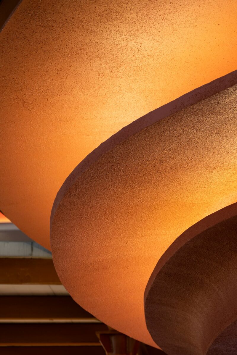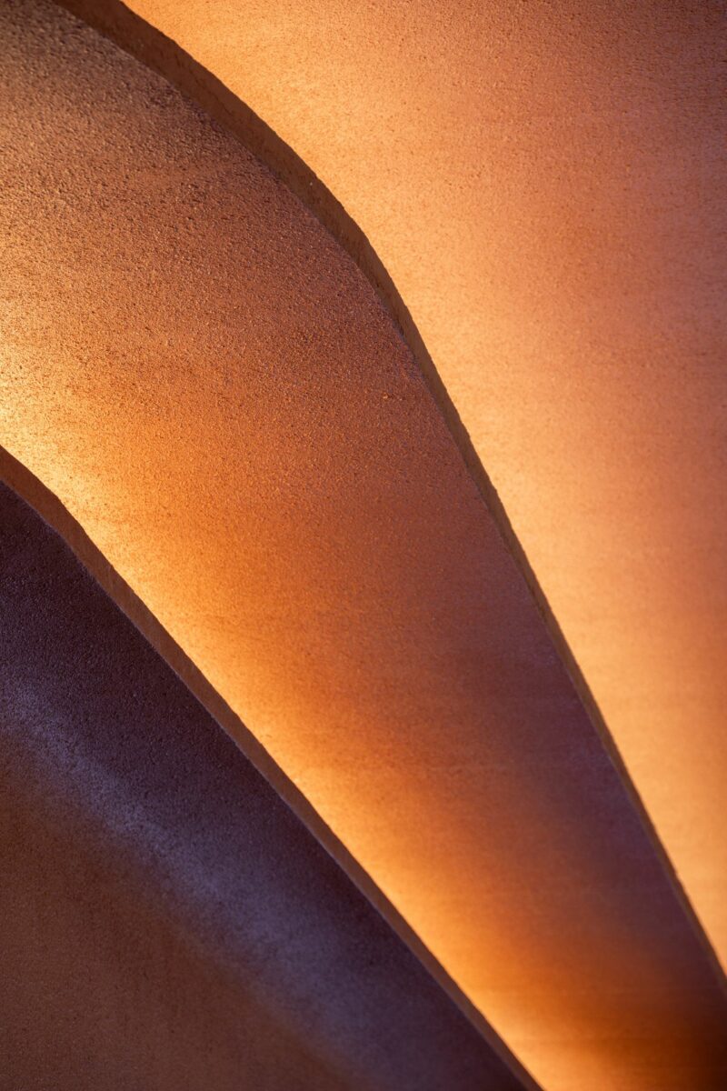 สิ่งที่ผู้ออกแบบให้ความสำคัญไม่แพ้รูปทรง คือเรื่องของ “แสงและเงา” โดยมองว่าแสงคือรายละเอียดที่จะทำให้สถาปัตยกรรมมีชีวิต จึงออกแบบผนังและช่องเปิดให้ทำปฏิสัมพันธ์กับแสงธรรมชาติที่เปลี่ยนแปลงตลอดวัน เมื่อแสงแดดสาดส่องเข้ามา สีส้มจะดูนุ่มนวลและสดใส แต่เมื่อถึงยามเย็นแสงที่ทอดลงบนผนังโค้งจะสร้างเงาที่ลุ่มลึก ทำให้พื้นที่ดูสงบนิ่งและอบอุ่นขึ้น เป็นภาพที่เกิดจากการจินตนาการถึงการละลายของครีมชีสที่เปลี่ยนแปลงไปในแต่ละขณะ