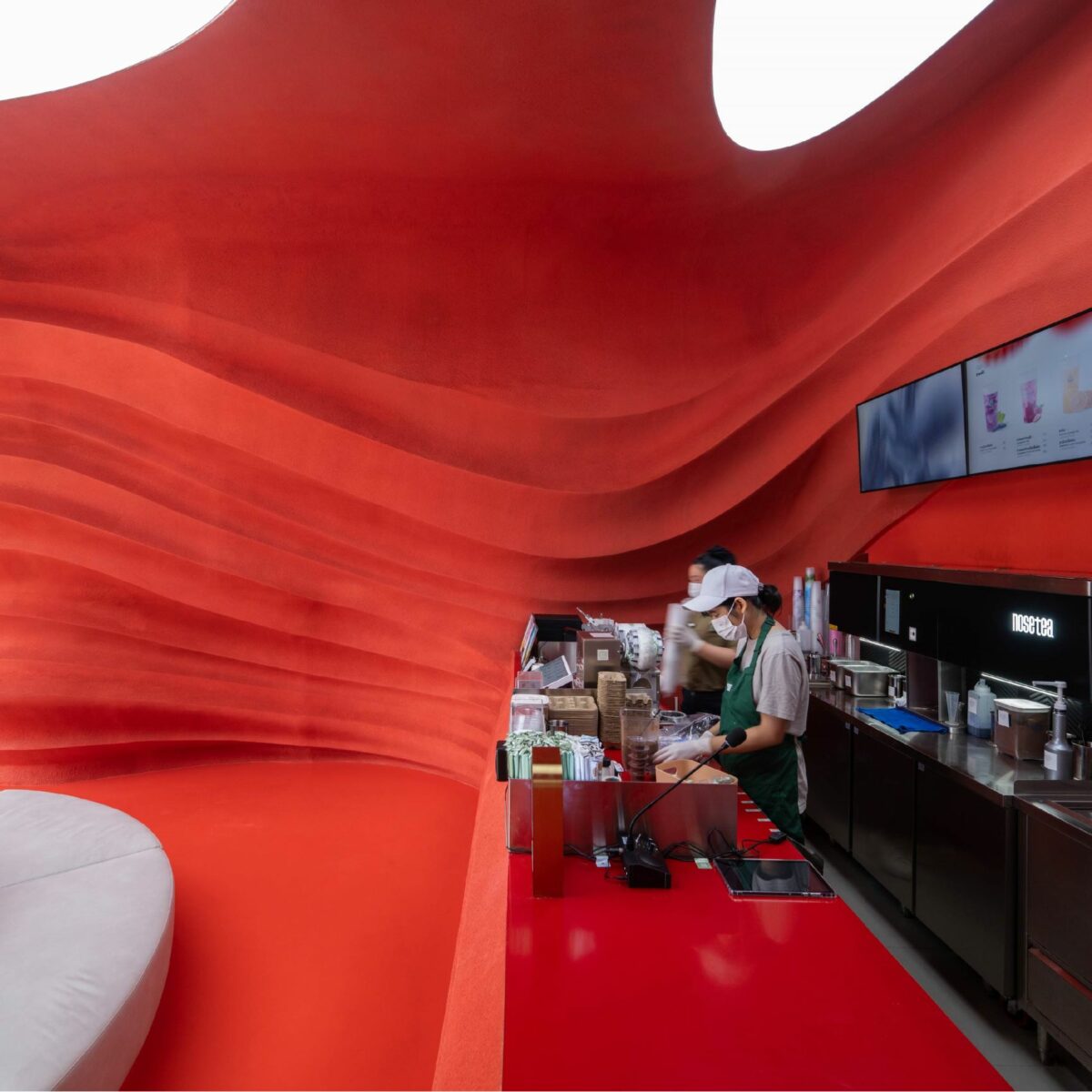 การออกแบบ Nose Tea สาขานี้ จึงเปรียบเสมือนการ “ตีความ” เอกลักษณ์ของแบรนด์ขึ้นมาใหม่ โดยเชื่อว่าสถาปัตยกรรมที่ดีควรจะสามารถ “ขยายขอบเขต” ของแบรนด์ให้ไปไกลกว่าเดิมได้ ที่นี่จึงไม่ใช่เพียงการสร้างพื้นที่ที่สะท้อนตัวตนของ Nose Tea แต่ยังนำเสนอความเป็นไปได้ใหม่ ๆ ให้กับแบรนด์ในมิติทางกายภาพ ซึ่งได้ทั้งการสัมผัสและความรู้สึกผ่าน “บทสนทนาระหว่างรสชาติและสถาปัตยกรรม” พื้นที่เล็ก ๆ แห่งนี้ จึงทำให้ผู้คนได้ลิ้มรสมากกว่าชาในถ้วย แต่คือการรับ รู้ถึงความเคลื่อนไหว ความละเอียด และความตั้งใจที่หลอมรวมอยู่ในทุกเส้นสายของงานออกแบบ