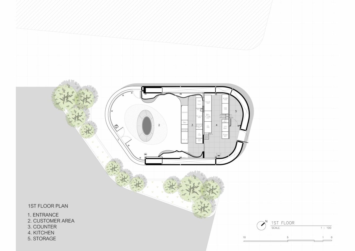 มีเพียงเฟอร์นิเจอร์วงกลมสำหรับนั่งกลางร้านสอดคล้องกับความเป็นร้านขนาดเล็ก สัมพันธ์กับไลท์ติ้งด้านบนที่ซ่อนไม่ให้มีหลอดไฟรกตา