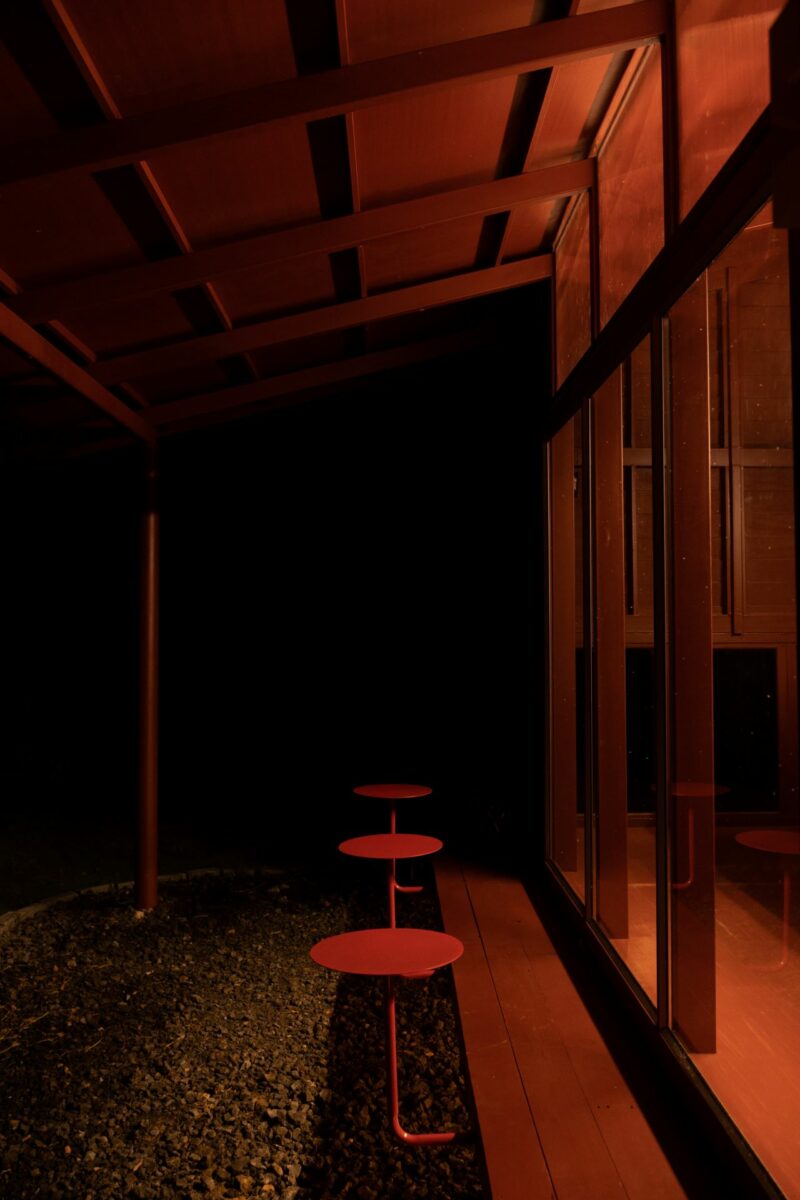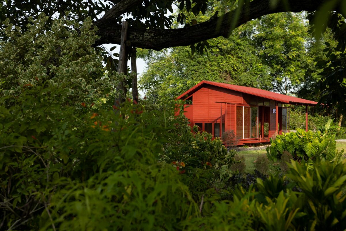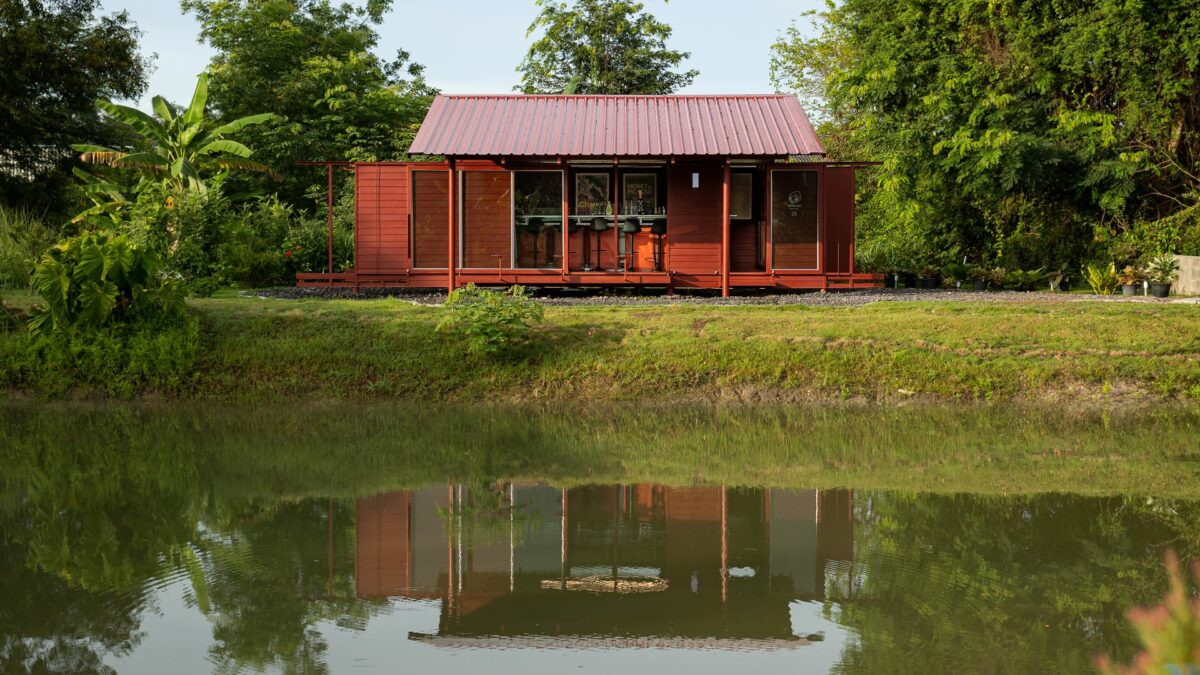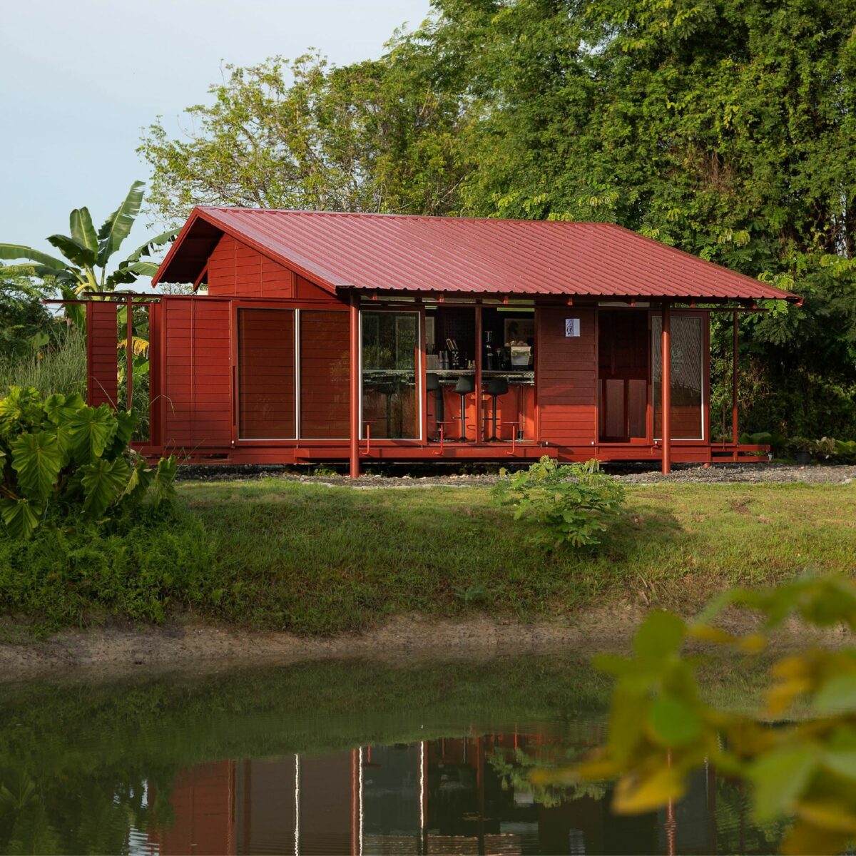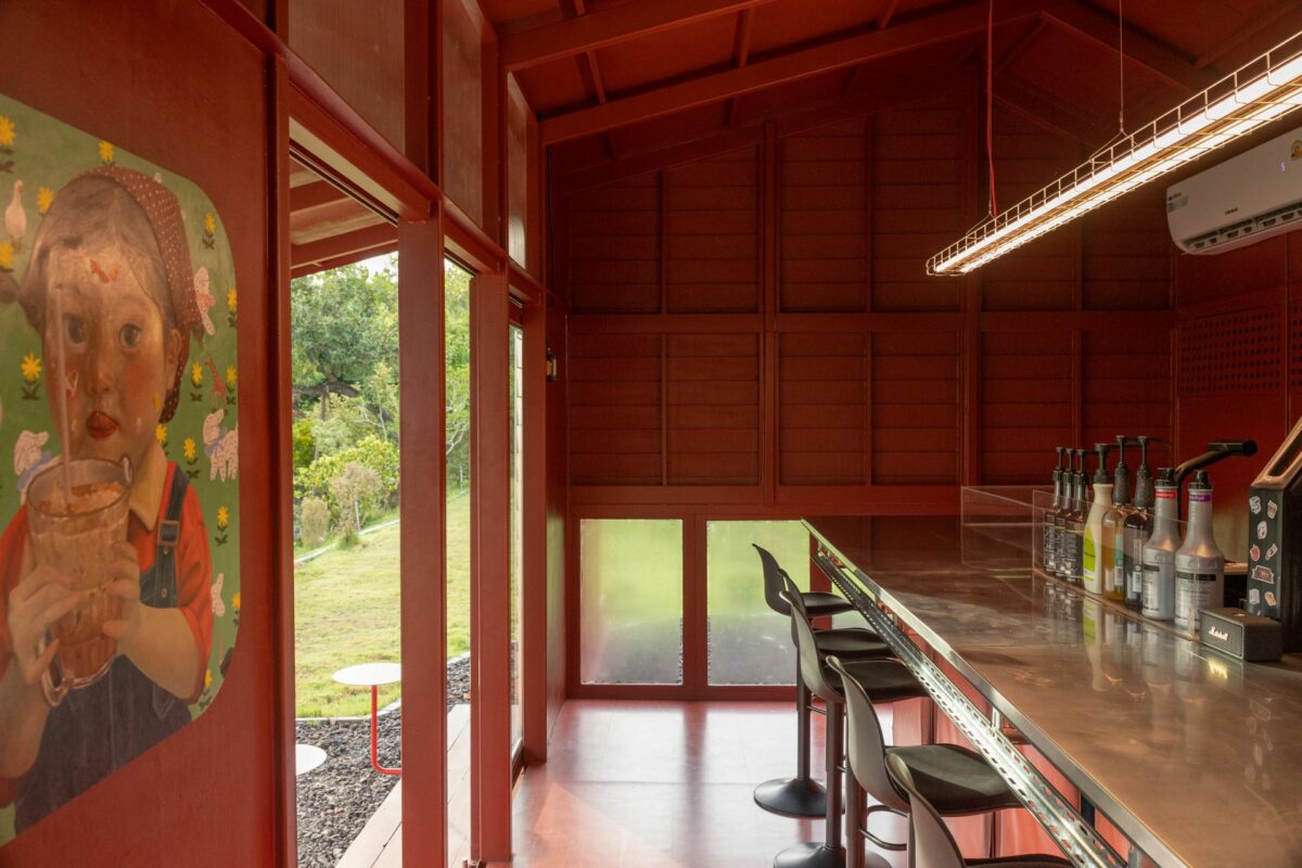ด้วยความตั้งใจของเจ้าของที่อยากให้คาเฟ่สีแดงชาดของพวกเขา เป็นสถานที่ที่อบอุ่นและเป็นกันเอง รูปทรงของอาคารจึงคล้ายบ้านชั้นเดียวรูปทรงเรียบง่ายคุ้นตา มีพื้นที่ใช้งานในลักษณะแคบและยาวทอดตัวขนานไปกับขอบสระในสวน