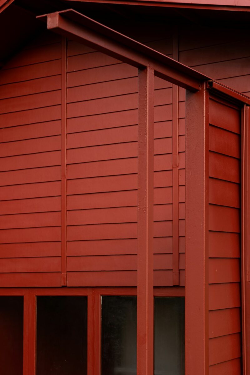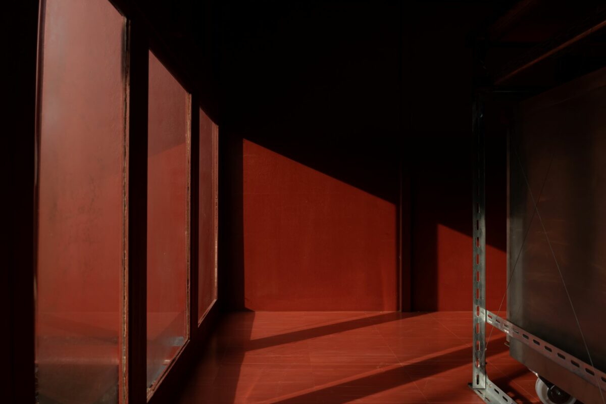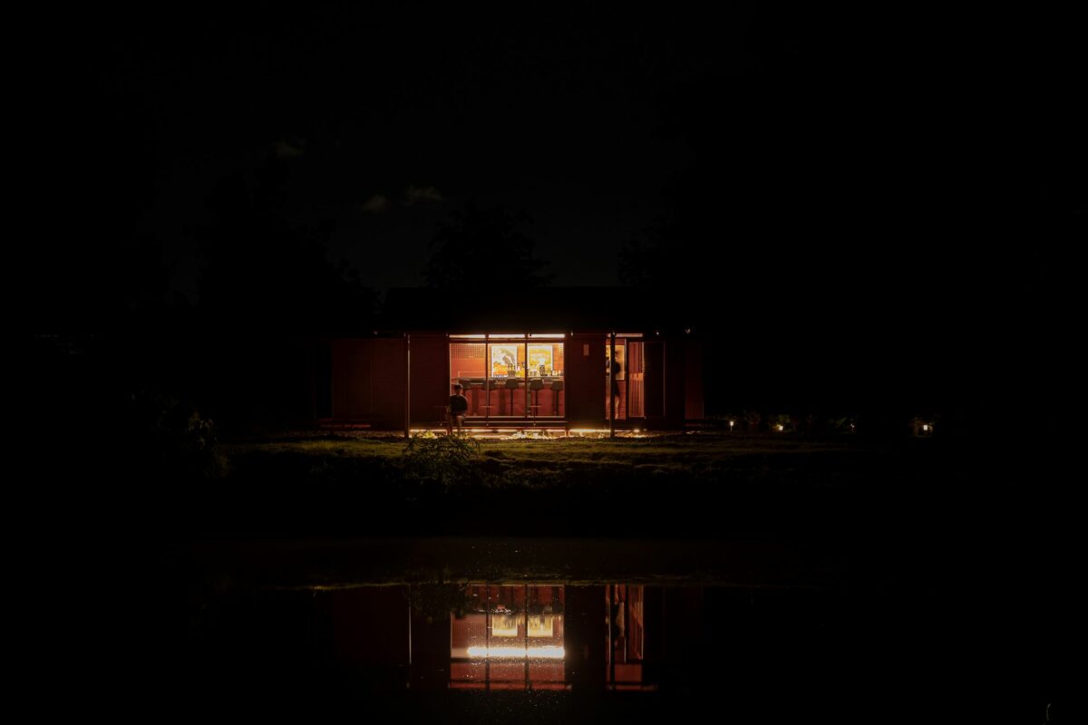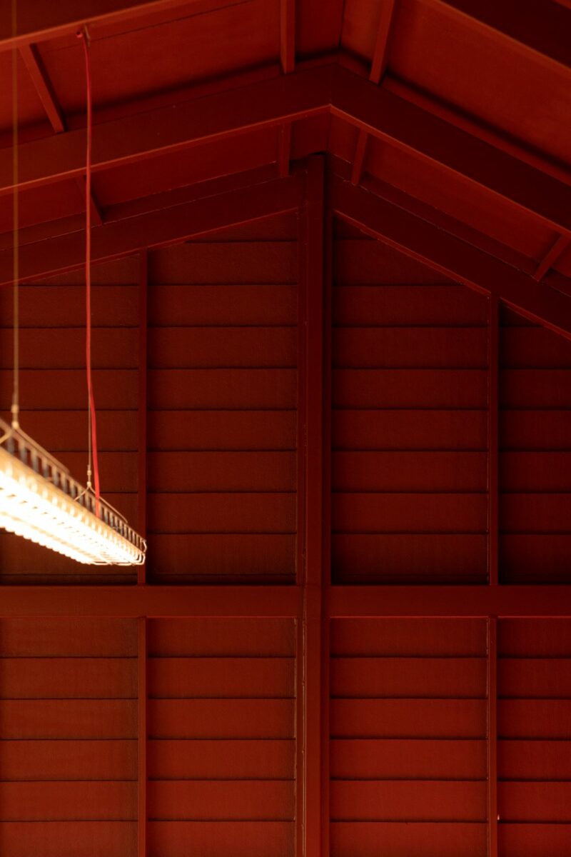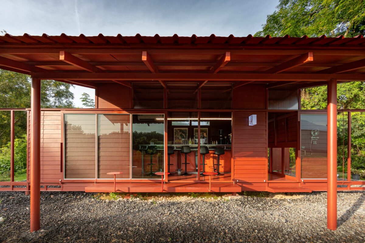 ด้วยความตั้งใจของเจ้าของที่อยากให้คาเฟ่สีแดงชาดของพวกเขา เป็นสถานที่ที่อบอุ่นและเป็นกันเอง รูปทรงของอาคารจึงคล้ายบ้านชั้นเดียวรูปทรงเรียบง่ายคุ้นตา มีพื้นที่ใช้งานในลักษณะแคบและยาวทอดตัวขนานไปกับขอบสระในสวน