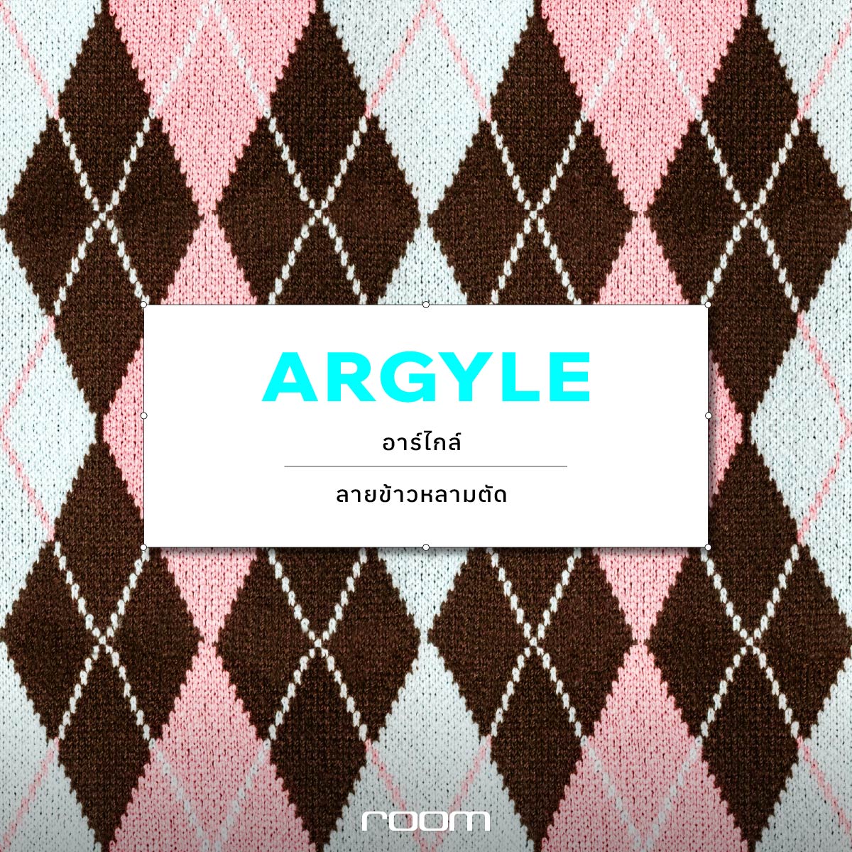 Argyle (อาร์ไกล์) ลายข้าวหลามตัด ที่มีลักษณะเป็นรูปเพชรหรือสี่เหลี่ยมขนมเปียกปูนซ้อนกัน มักมีเส้นตารางทับขัดกันอยู่ในแต่ละช่อง