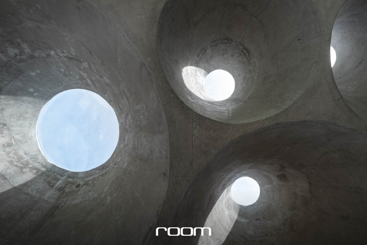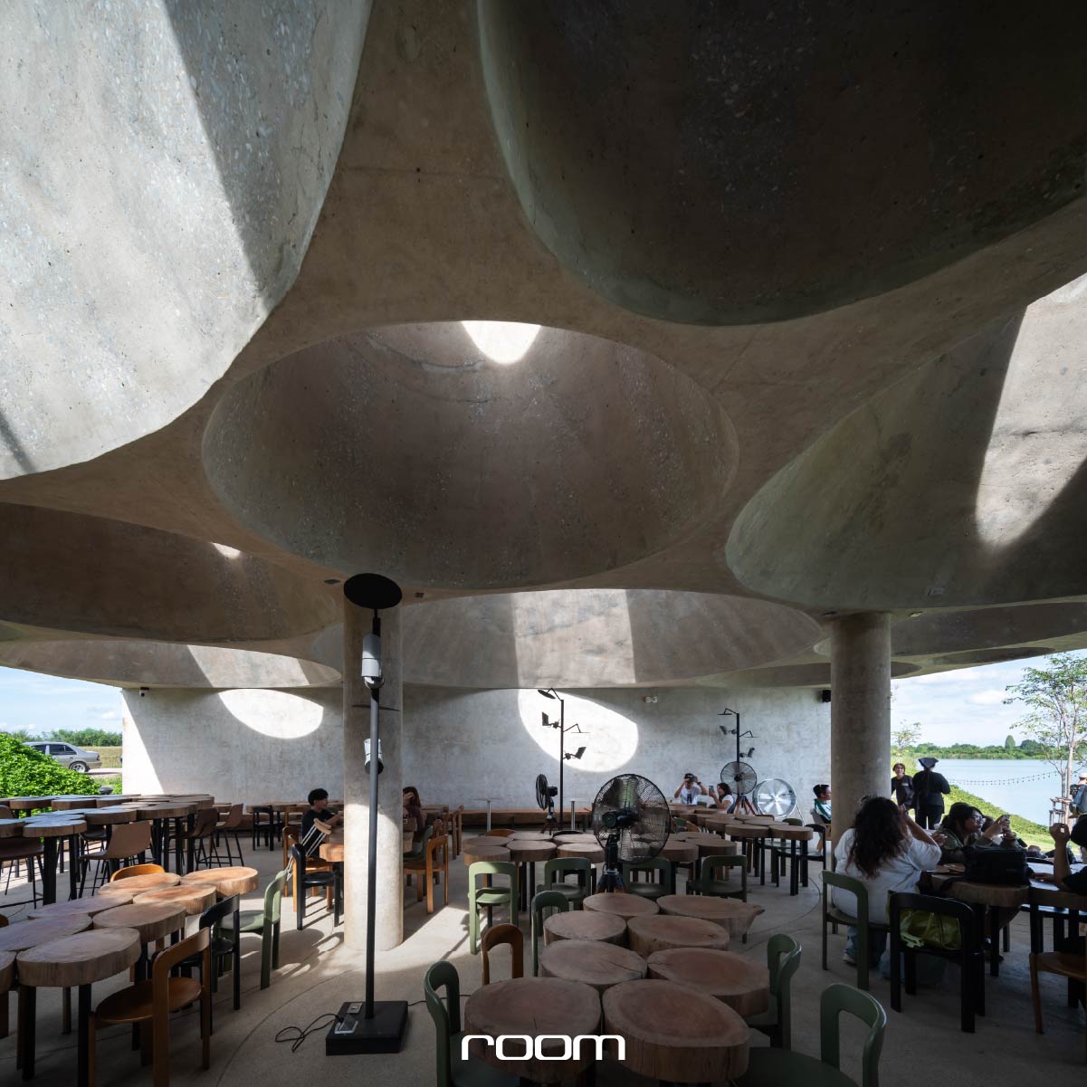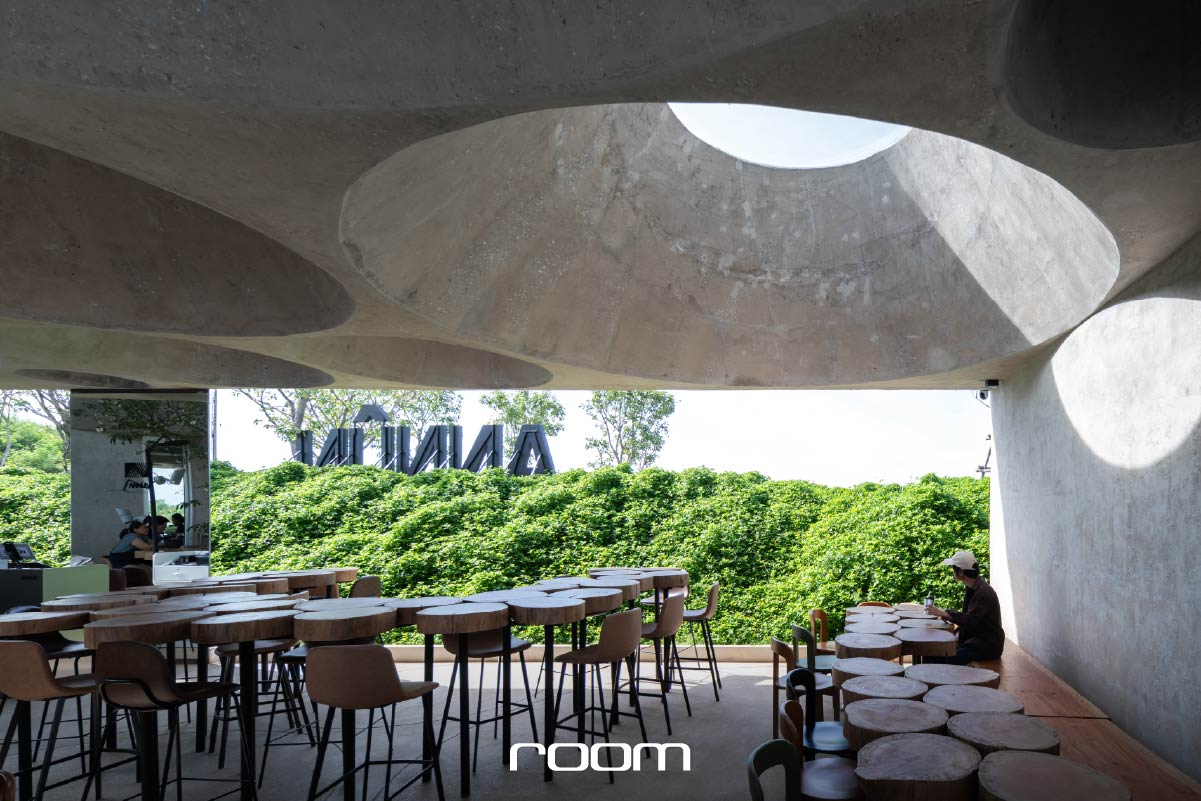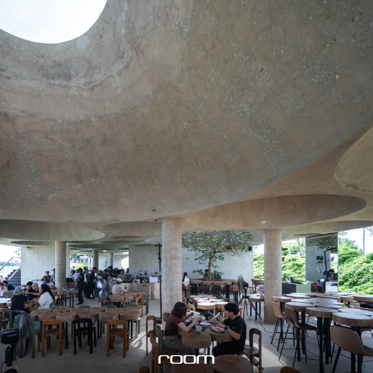 เมื่อการตั้งอยู่ท่ามกลางที่โล่งแจ้งท้าแดดและลมฝน สถาปนิกจึงเลือกวัสดุที่ต้องทนทาน มีอายุยาวนาน จึงเลือกใช้คอนกรีตมาหล่อเป็นโครงสร้างหลักทั้งหลัง ทำให้อาคารมีอายุยืนยาวตราบเท่าอายุของตัววัสดุ โดยมีจุดไฮไลต์ที่สร้างประสบการณ์พิเศษมากที่สุดของร้าน อยู่ที่ฝ้าเพดานช่องแสงทรงกรวย จำนวน 22 ช่อง เปิดเป็นช่องนำแสงธรรมชาติลงมาสู่ร้านในเวลากลางวัน แต่ละช่องขนาดและองศาต่างกัน เพื่อทำมุมรับแสงแดดที่ต่างกัน ซึ่งจะทำให้พื้นที่ภายในได้รับรูปทรงของแสงและเงาที่แตกต่างกันตามแต่ละช่วงเวลา ทำให้เกิดมูฟเมนต์ที่น่าสนใจภายในร้าน