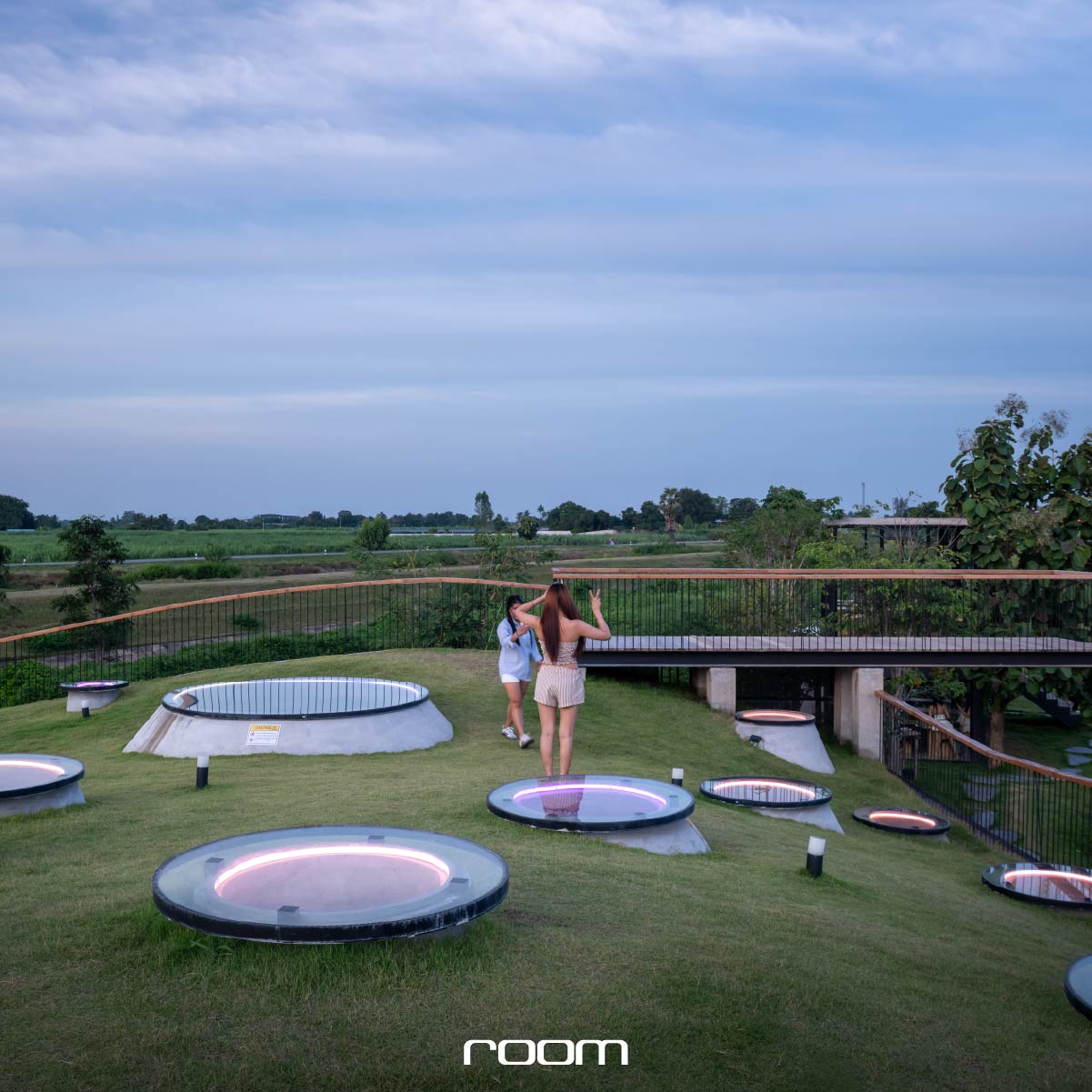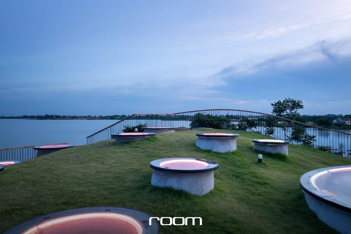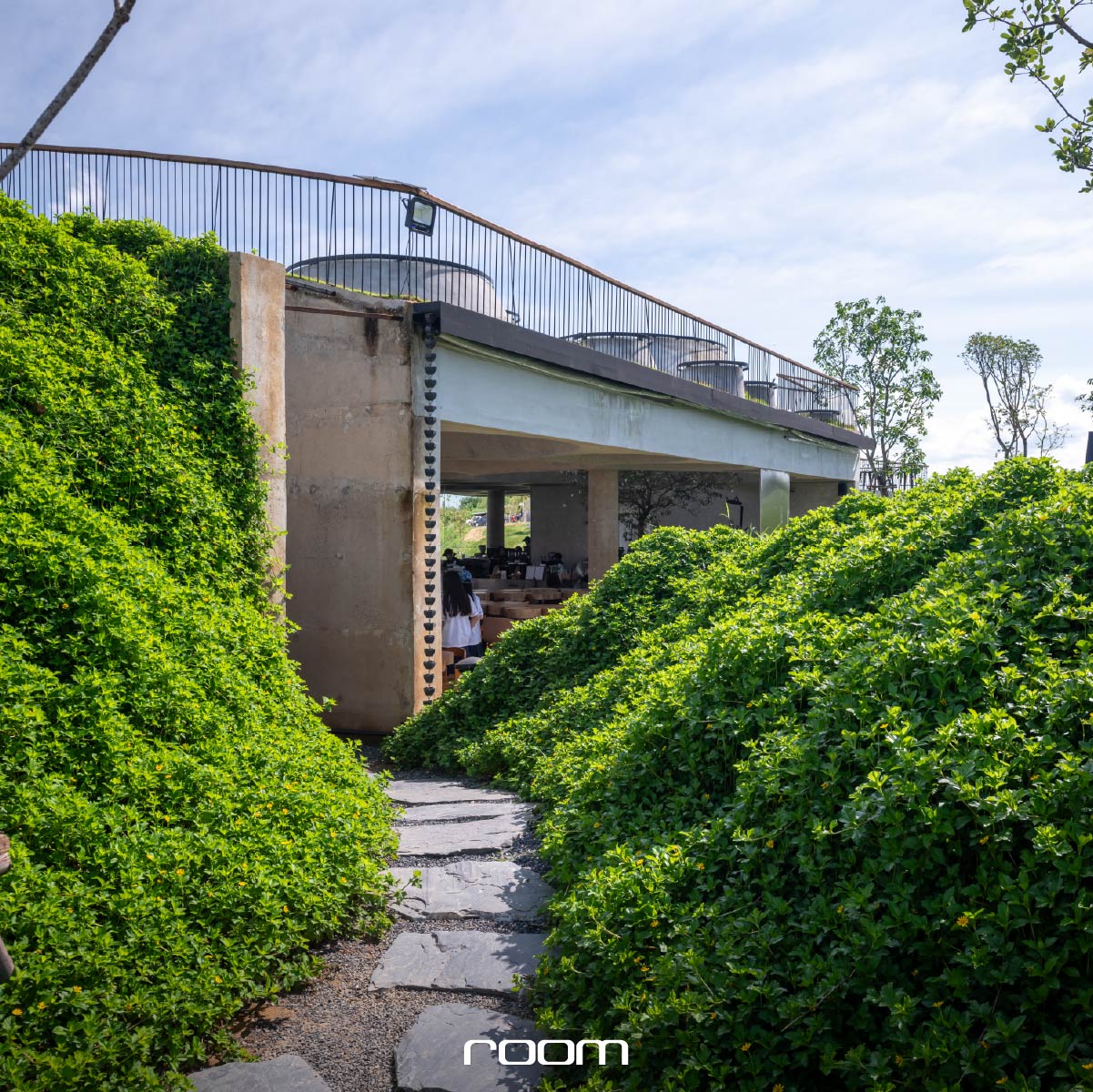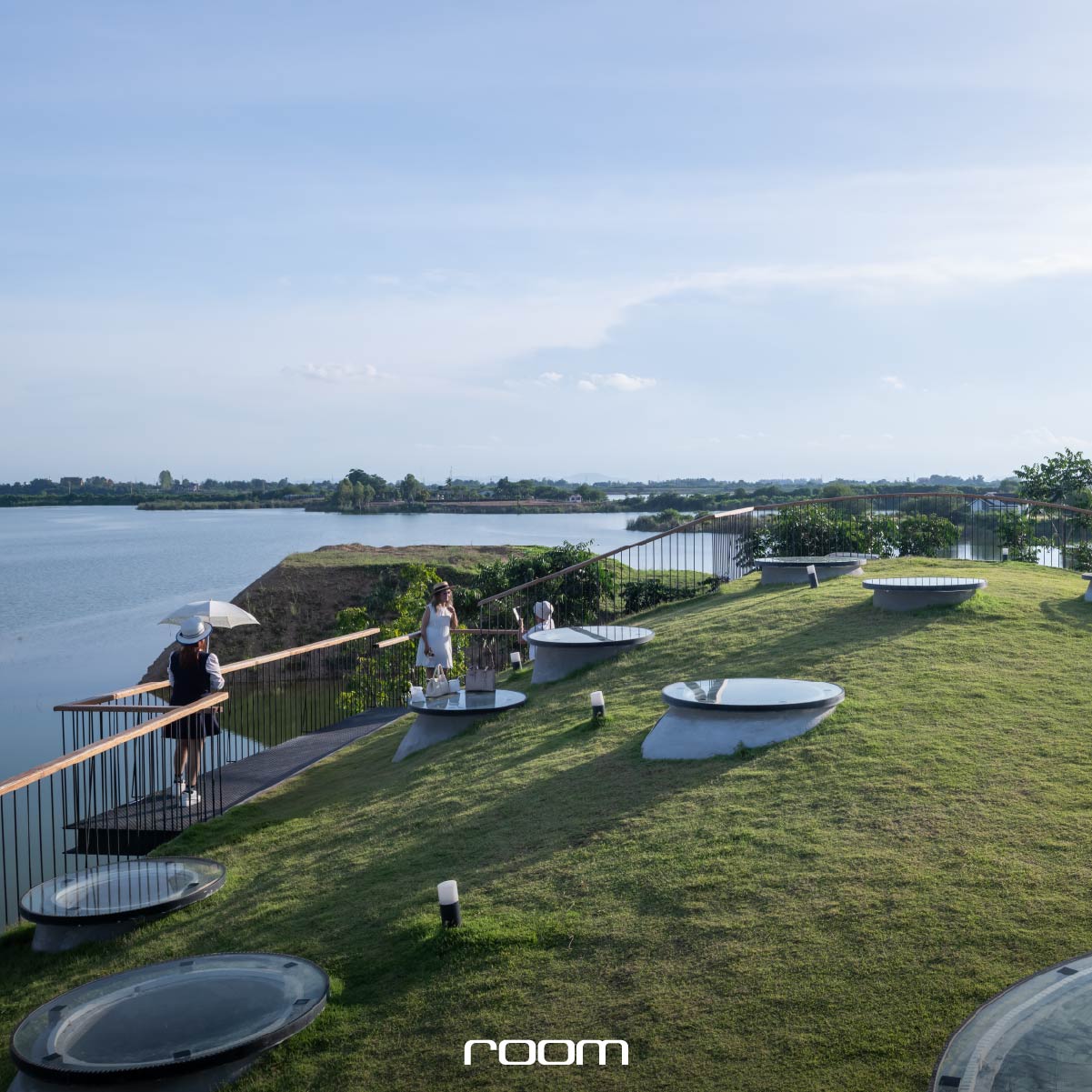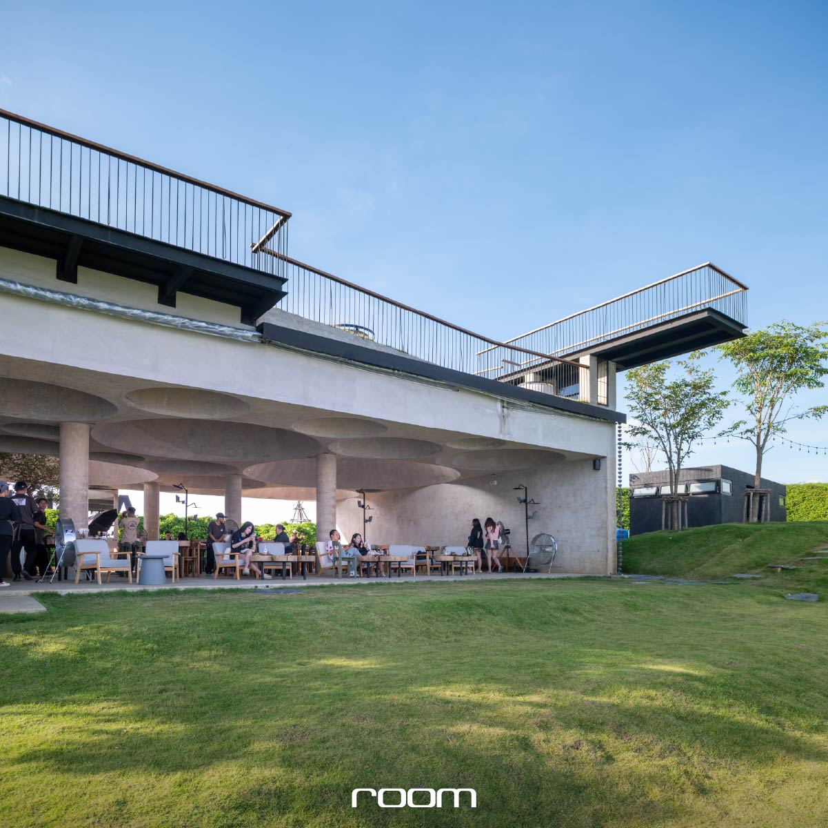 นอกจากภายในแล้ว ด้านบนของอาคารยังมีอีกหนึ่งมุมไฮไลต์ นั่นคือสวนดาดฟ้า เป็นสนามหญ้าที่สามารถเดินขึ้นไปเดินเล่น นั่งพักผ่อน ชมวิวบึงน้ำมุมสูงได้ โดยตัวสนามหญ้านี้ยังทำหน้าที่ช่วยลดความร้อนให้พื้นที่ร้านด้านล่าง และในด้านภาพลักษณ์ภายนอกก็ทำให้อาคารทั้งหลังกลมกลืนกับภูมิประเทศที่เป็นเนินโคกดินล้อมรอบบึงน้ำใหญ่ด้วย