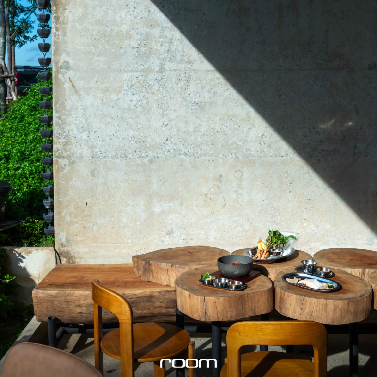 อย่างที่ร้านนี้ได้ใช้แม่แบบแผ่นเหล็กมาขึ้นรูปทรงให้เป็นทรงกรวยที่ช่องแสงจากหลังคา จนได้กลายเป็นอีกหนึ่งมุมพิเศษที่ชวนให้มารับประสบการณ์ด้วยตัวเอง ประกอบกับการเปิดเผยให้เห็นผิวสัมผัสแท้จริงของคอนกรีตโดยไม่ปกปิด หรือปรุงแต่ง ยิ่งแสดงให้เห็นถึงความงามในความไม่สมบูรณ์แบบตามธรรมชาติของตัววัสดุ เมื่อคอนกรีตทรงกรวยที่มีความดิบ ฉาบทาด้วยแสงแดดที่เปลี่ยนไปตามแต่ละช่วงเวลาของวัน ก็สร้างภาพที่น่าจดจำ และเชื้อเชิญผู้คนให้เข้ามาอยู่ในสเปซแห่งนี้ และสร้างความแตกต่างให้ประสบการณ์การใช้งานพื้นที่ธุรกิจอย่างร้านอาหารได้เป็นอย่างดี