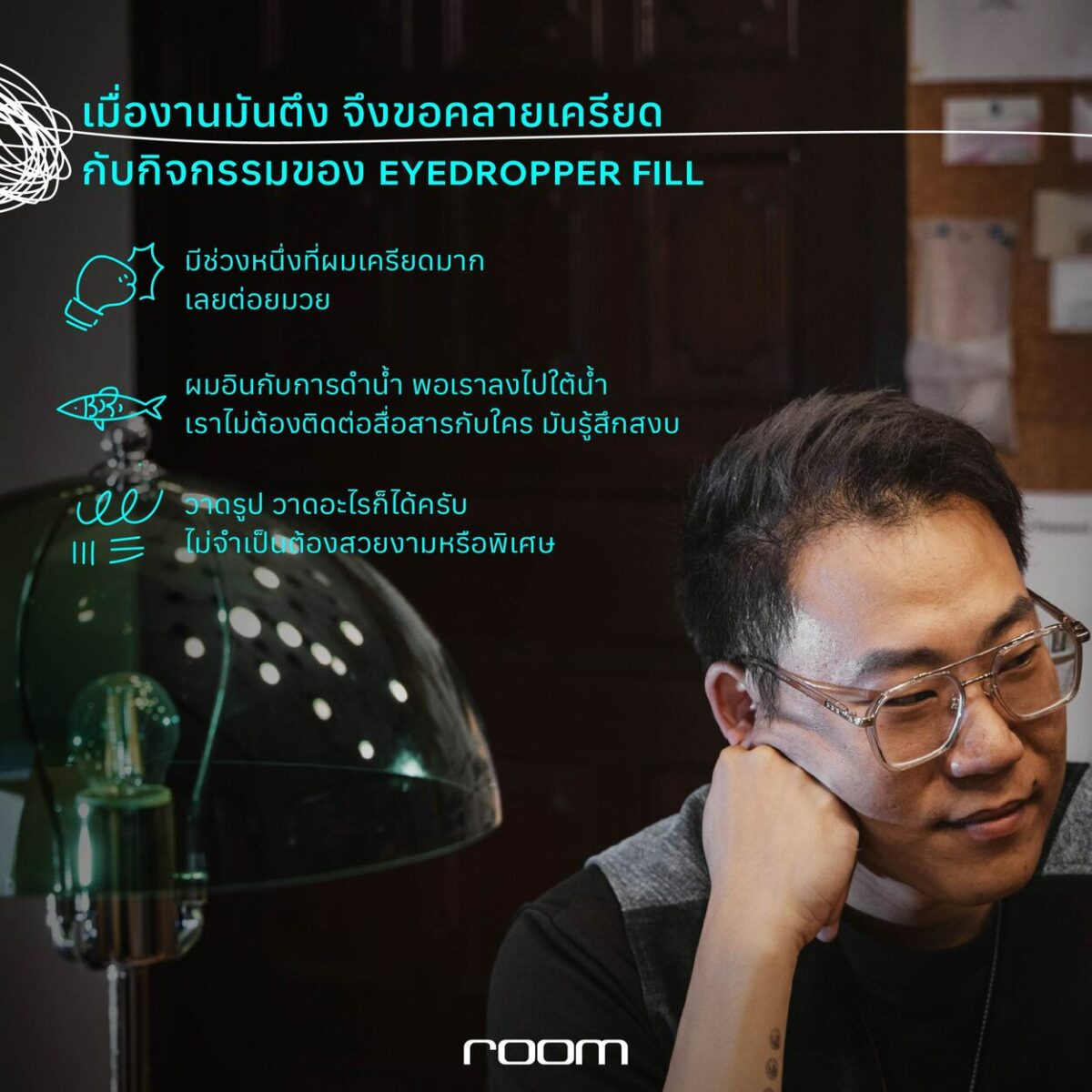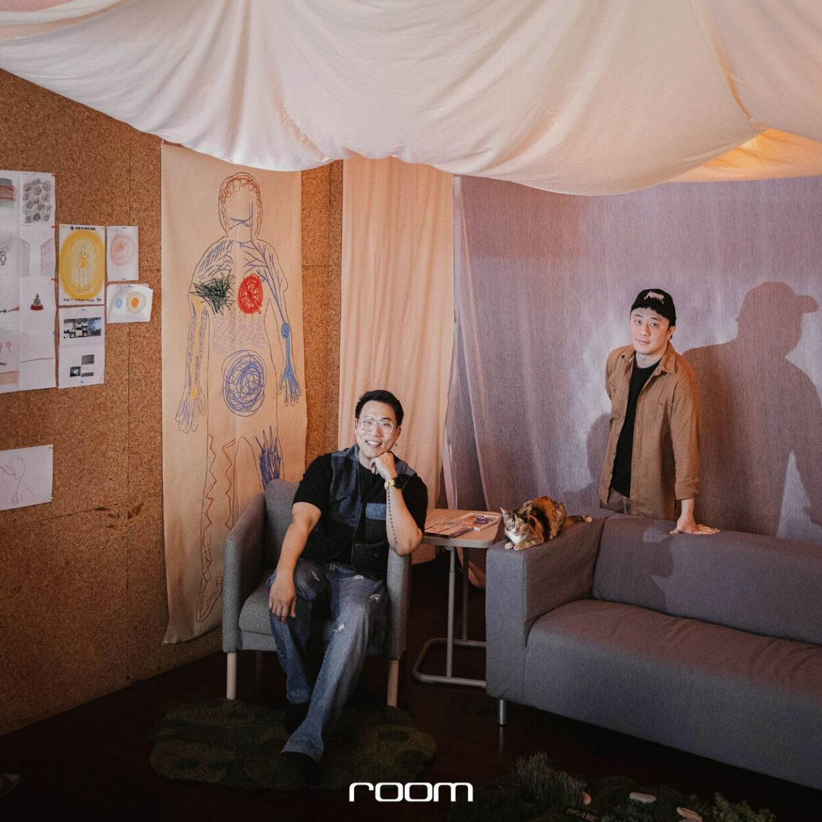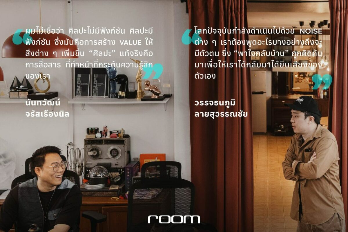 room จะพามาทำความรู้จักสตูดิโอออกแบบเบื้องหลังนิทรรศการเหล่านี้ ผ่านบทสนทนาซึ่งไม่ได้บอกเล่าเพียงความคิดสร้างสรรค์ของพวกเขา แต่หากยังเต็มเปี่ยมด้วยถ้อยคำที่พยายามสื่อสารและเยียวยาหัวใจของผู้คนให้หลบพ้นจากความวุ่นวายในสถานการณ์ของโลกปัจจุบัน