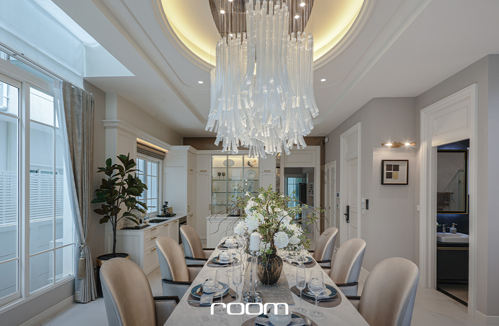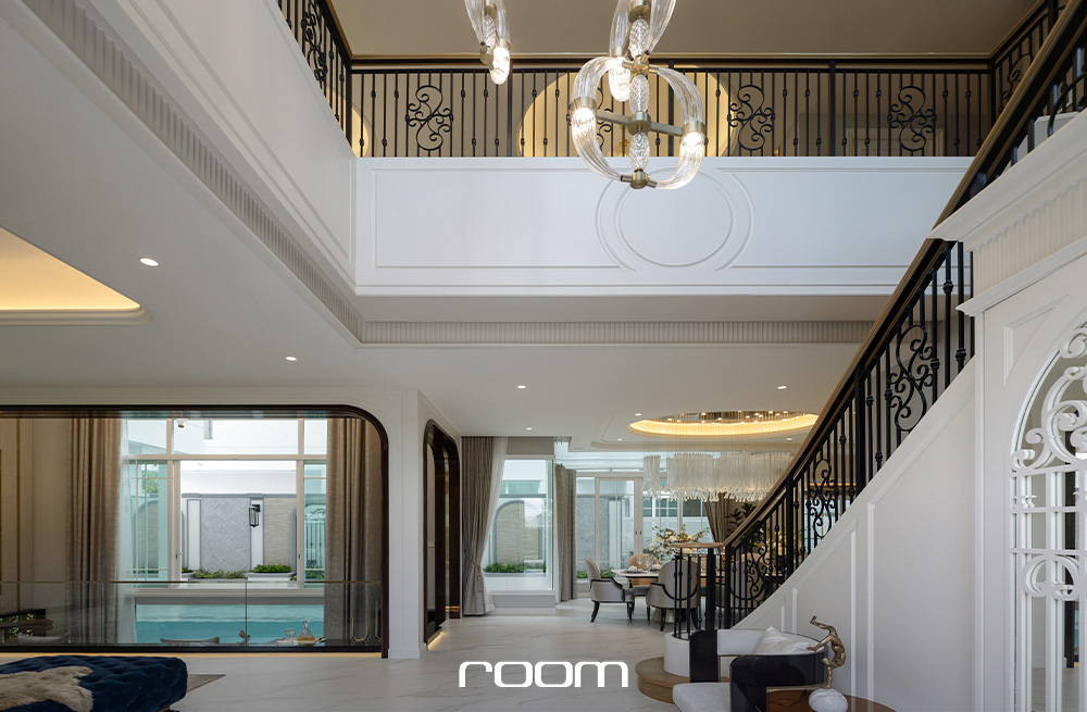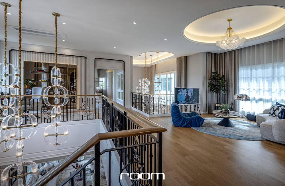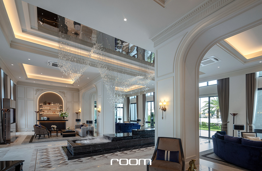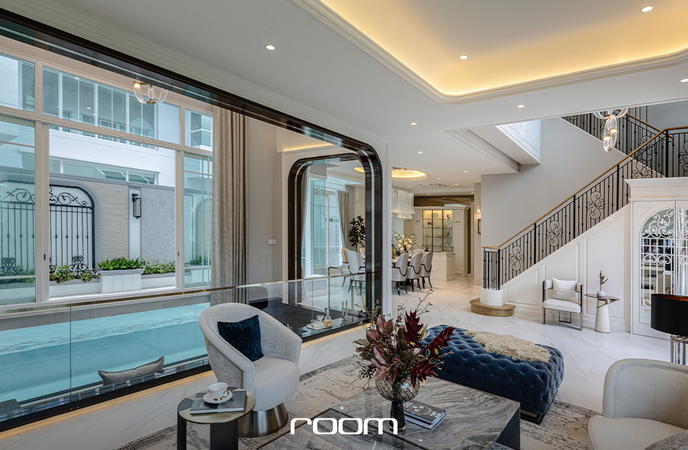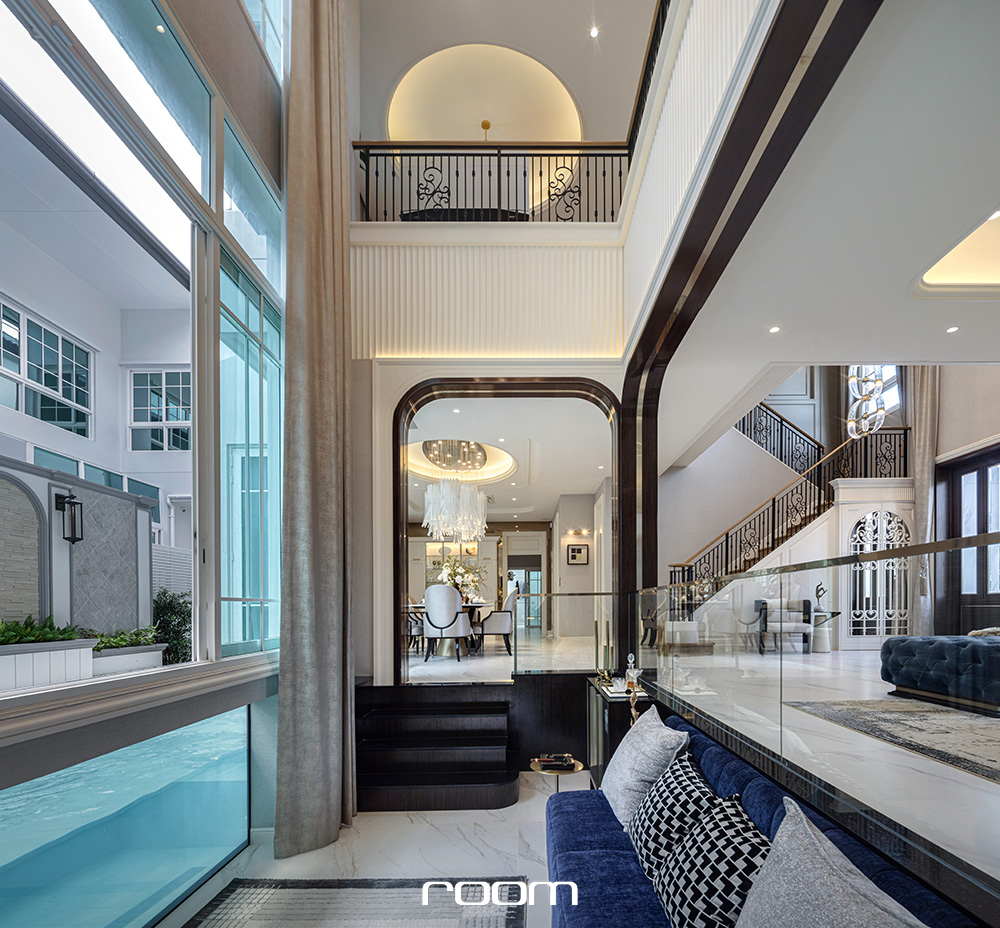 และรูปแบบบ้านที่เราจะพาไปชมกันคือแบบบ้านหลังใหญ่สุด มาพร้อมพื้นที่ใช้สอย 586 ตารางเมตร รองรับที่จอดรถ 4 คัน 5 ห้องนอน 6 ห้องน้ำ เมื่อเข้ามาชั้นหนึ่งจะพบกับโถงนั่งเล่นขนาดใหญ่แบบโอเพ่นแปลน ที่เชื่อมต่อส่วนนั่งเล่น ส่วนรับประทานอาหารแบบโต๊ะยาว และ Sunken นั่งเล่นที่เชื่อมมุมมองไปกับสระว่ายน้ำข้างบ้าน ไว้รองรับการจัดปาร์ตี้ ต้อนรับแขก หรือสังสรรค์ได้ทุกโอกาส โดยด้านในสุดมีห้องอเนกประสงค์รองรับ 2 ห้อง ที่สามารถปรับเปลี่ยนเป็นห้องนอนผู้สูงอายุ ห้องทำงาน หรือห้องทำงานอดิเรกได้ตามแต่ไลฟ์สไตล์