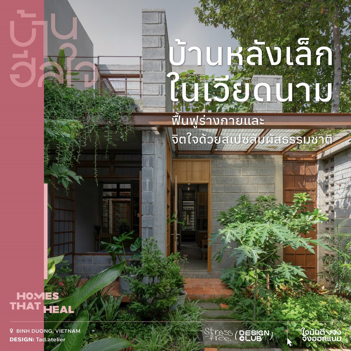 บ้านชั้นเดียว หลังนี้ เป็นความพยายามสร้างพื้นที่สงบภายในเมืองอุตสาหกรรมที่ขยายตัวอย่างรวดเร็วในเวียดนาม มีพื้นที่ใช้สอยเพียง 90 ตารางเมตร แต่เต็มเปี่ยมด้วยแนวคิดที่ส่งเสริมสุขภาวะทั้งกายและใจ โดยเฉพาะการออกแบบพื้นที่รอบรับวิถีชีวิตแบบมังสวิรัติและการปฏิบัติธรรม