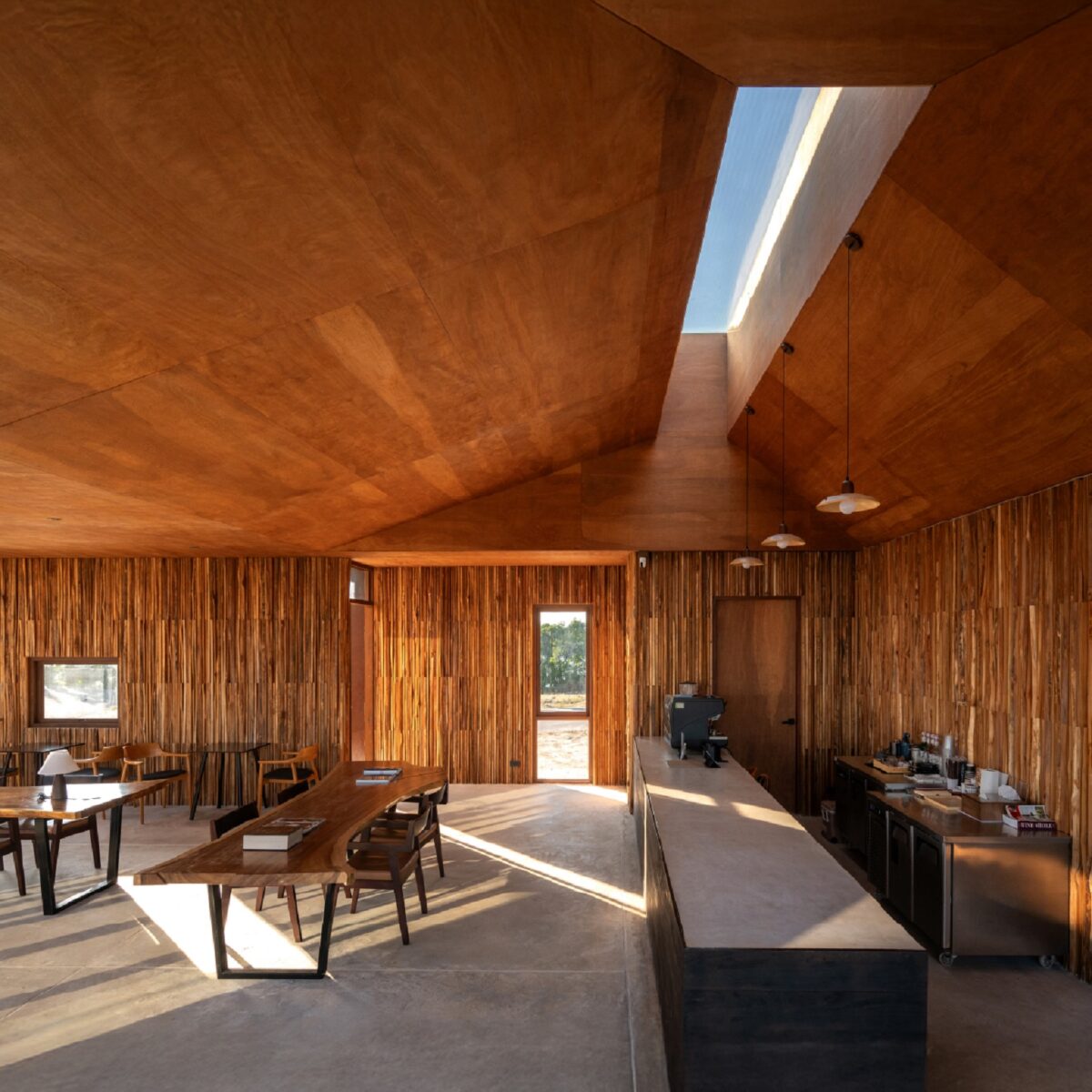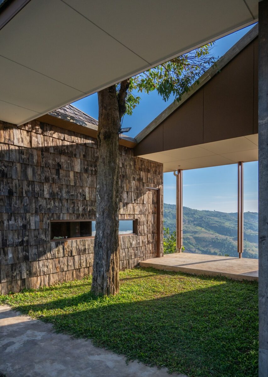 การสร้างความเป็นส่วนหนึ่งกับสภาพแวดล้อมนั้น ยังได้ขยายไปสู่พื้นที่ภายใน ผ่านการออกแบบฝ้าเพดานที่ลาดเอียงสอดรับไปกับมุมของหลังคาเฉียงภายนอก ทำให้เกิดความต่อเนื่องของสเปซ อีกทั้งยังมีช่องเปิดขนาดใหญ่ที่เปิดรับทัศนียภาพของภูเขาเข้าสู่พื้นที่ภายในให้ความรู้สึกเหมือนเป็นกรอบรูปรับภาพธรรมชาติ ส่วนบรรยากาศภายในอาคารก็ตกแต่งด้วยไม้ทั้งผนังและฝ้าเพดาน กรุพื้นด้วยกระเบื้องโทนสีน้ำตาลช่วยสร้างความอบอุ่น ขณะเดียวกันยังมีช่องแสงสกายไลต์บนฝ้าของบริเวณส่วนต้อนรับ ช่วยทำหน้าที่ดึงแสงธรรมชาติเข้าสู่โถงภายใน เกิดจังหวะของแสงและเงาที่เปลี่ยนแปลงไปตลอดทั้งวัน