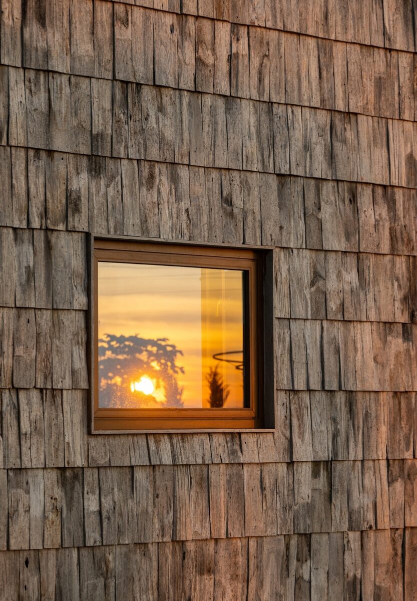 ด้วยบริบทที่รายล้อมด้วยธรรมชาติ วัสดุไม้จึงได้รับการเลือกมาใช้เป็นวัสดุหลักของที่นี่เพื่อสร้างความเป็นส่วนหนึ่ง แต่ความพิเศษคือการเลือกนำเศษไม้เก่า เช่น แผ่นแป้นเกล็ดหลังคาไม้จากเรือนพื้นถิ่น จังหวัดลำพูน ที่ถูกรื้อถอนมาตกแต่งที่ผนังภายนอกอาคาร และนำเศษไม้จากอุตสาหกรรมไม้แปรรูปมาตกแต่งผนังภายในและทำเป็นพื้นไม้ปาเก้ เป็นการนำเศษไม้เก่ามาอัปไซเคิลผ่านการออกแบบจัดเรียงจนเกิดแพตเทิร์นใหม่ที่ชวนน่าดึงดูด อีกทั้งเมื่อแสงแดดมากระทบกับผิวไม้ช่วยสร้างมิติบรรยากาศแบบรัสติก (Rustic) เกิดเป็นความงามที่แฝงอยู่ในความไม่สมบูรณ์แบบของวัสดุ ทำให้ไม้เก่าได้เกิดชีวิตใหม่บนได้อย่างน่าสนใจ
