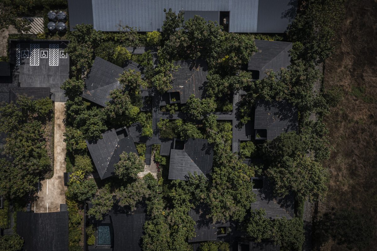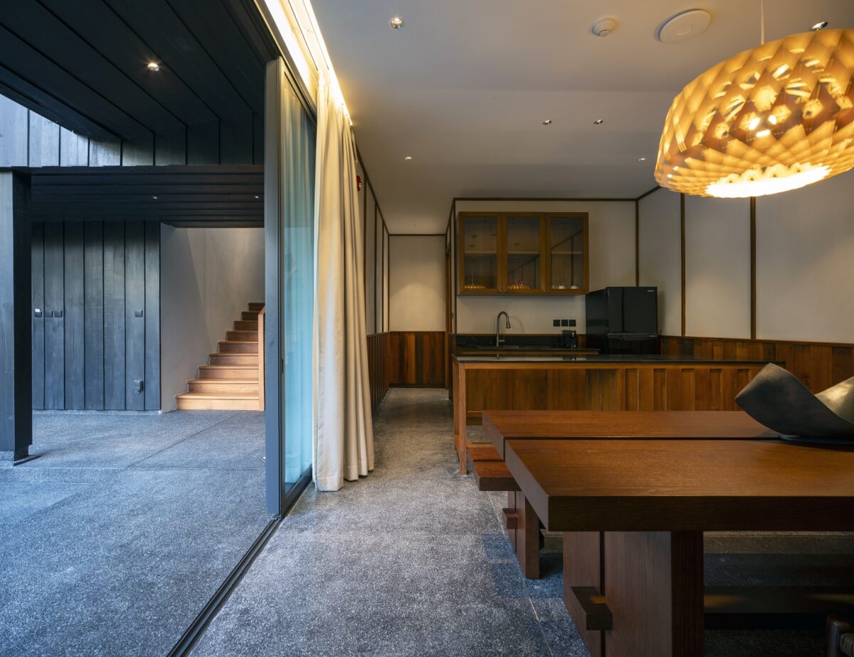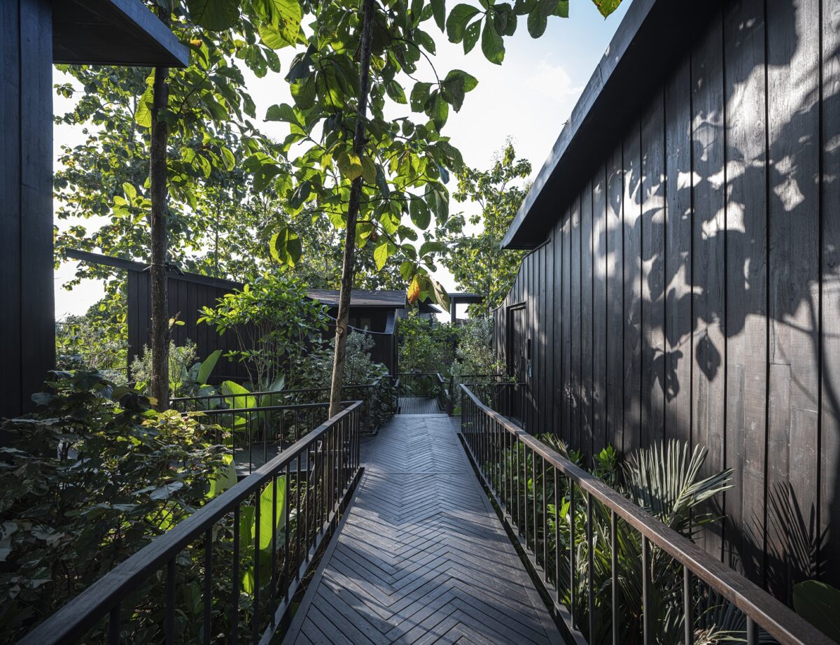 โซนป่าสัก โซนนี้ตัวอาคารจะแทรกตัวไปกับต้นสักเดิม มีหน้าต่างทรงโค้งรีที่เป็นเอกลักษณ์ เพื่อตีกรอบ (Frame) ให้เห็นลำต้นและใบสักในมุมมองที่แปลกตา ระดับสูงจะเห็นระดับยอดลำต้น ซึ่งเป็นอีกระดับที่แปลกตาไป เพราะคนปกติอาจไม่ค่อยได้เห็นต้นสักสูงขนาดนี้ หรือใกล้ขนาดนี้ โดยสถาปนิกได้ออกแบบทางเดินให้แขกได้ชื่นชมกับธรรมชาติ โดยทำเป็นสะพานลึกหายไปจากโซนอื่น ๆ ทำให้แขกค่อย ๆ เดินลัดเลาะไปตามทางเดินไม้ สัมผัสใบไม้ แสงเงา ให้ความรู้สึกสงบ และปลีกวิเวกฟังเสียงธรรมชาติอย่างสนิทสนมยิ่งขึ้น และสุดท้าย คือพูลวิลล่า 1 หลัง สำหรับครอบครัว มีสระว่ายน้ำและพื้นที่สังสรรค์แบบเป็นส่วนตัว