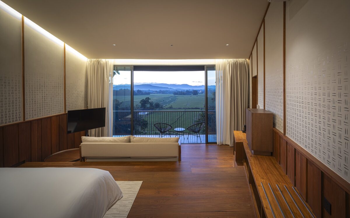 ที่นี่มีห้องพัก 26 ห้อง และ 1 พูลวิลล่า บนพื้นที่กว้างกว่า 10 ไร่ กับตัวอาคารแบบแผ่เต็มพื้นที่ โดยแบ่งตามมุมมองของวิวในทิศทางต่าง ๆ กัน เช่น โซนริมนา กับอาคารที่พักขนาด 2 ชั้น แต่ละชั้นจะสัมผัสวิวทุ่งนาในระดับที่สวยแตกต่างกันออกไป สำหรับชั้นล่างได้ออกแบบให้ยกพื้นเล็กน้อยเพื่อให้มองเห็นทุ่งนาในระดับสายตาใกล้ชิดพื้นดิน ส่วนชั้นบน ออกแบบพื้นเล่นระดับ 3 สเต็ป มีโซน Living เตียงนอน และ ห้องน้ำ พร้อมอ่างจากุซซี่ เพื่อให้ทุกฟังก์ชันมองเห็นวิวนาแบบพานอรามาได้เต็มที่