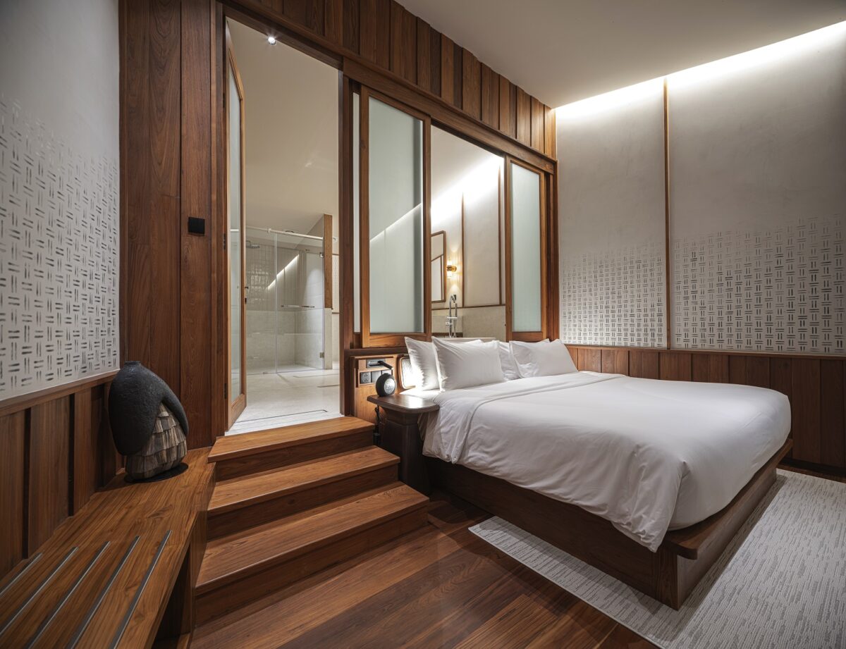 การทำงานของทีมนักออกแบบไม่เพียงสร้างสรรค์พื้นที่ที่ตอบโจทย์ธุรกิจของเจ้าของที่ครอบคลุมทั้งพื้นที่ห้องพัก ห้องอาหาร และห้องสัมมนา ผ่านรูปแบบสถาปัตยกรรมดีไซน์ร่วมสมัยที่เปิดรับวิวธรรมชาติอย่างทุ่งนา ทิวเขา และสวนป่าสัก หากแต่ละเอียดอ่อนยิ่งกว่าด้วยการนำเสนอแง่มุมที่ค่อย ๆ พาทุกคนไปรู้จักเมืองน่าน และวิถีคนล้านนาที่บางอย่างแทบเลือนหายไป