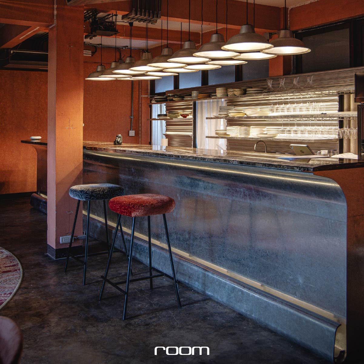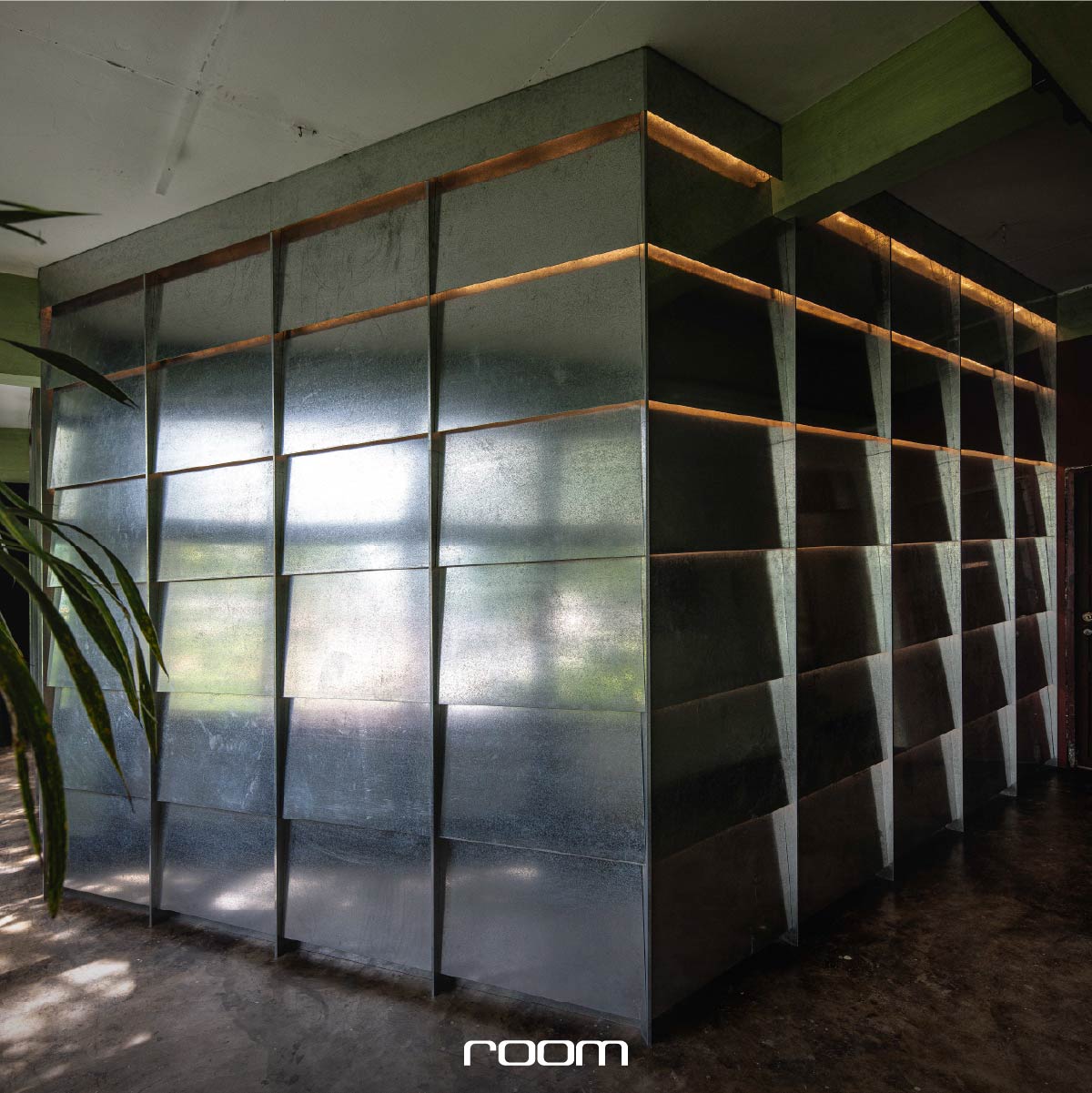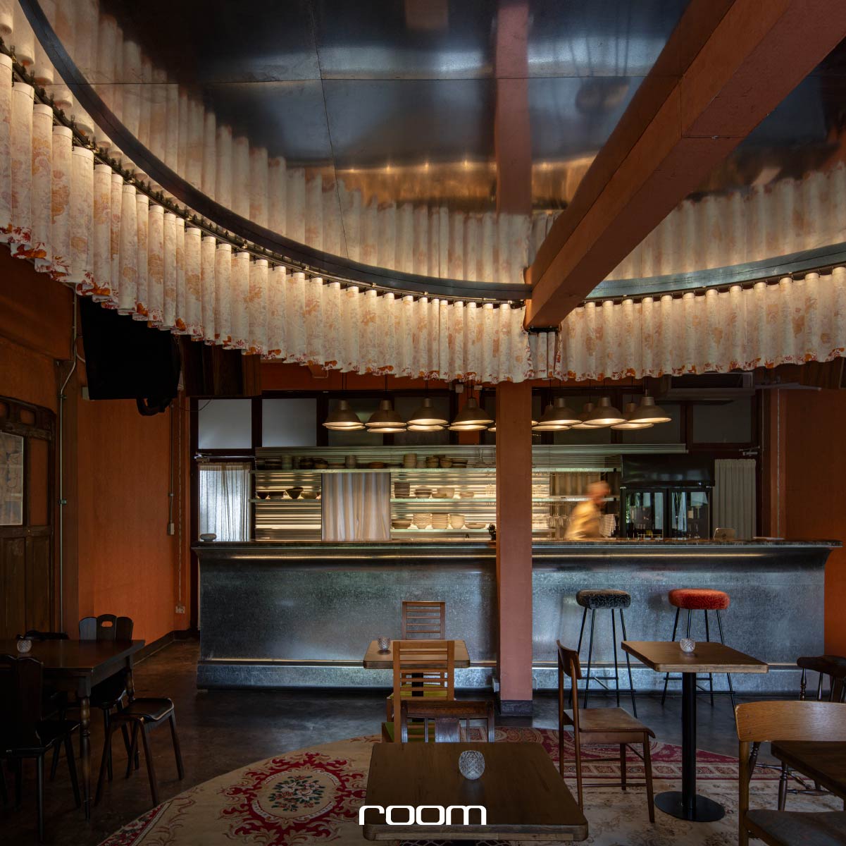 บริเวณบาร์และเพดาน ใช้วัสดุสังกะสีชุบกัลวาไนซ์ที่มีความ ‘ขุ่น’ และ ‘มัว’ เข้ากับบรรยากาศโดยรวมของตัวอาคาร