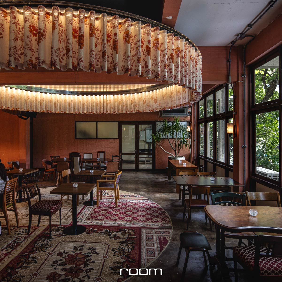 กลางโถงที่นั่งใช้ม่านผ้าลายดอกไม้ล้อไปกับโลโก้ สร้างเป็นมุมไอคอนิกด้วยโคมไฟและพรมวงกลม ช่วยลดทอนความเหลี่ยมของพื้นที่ให้ห้องละมุนขึ้น