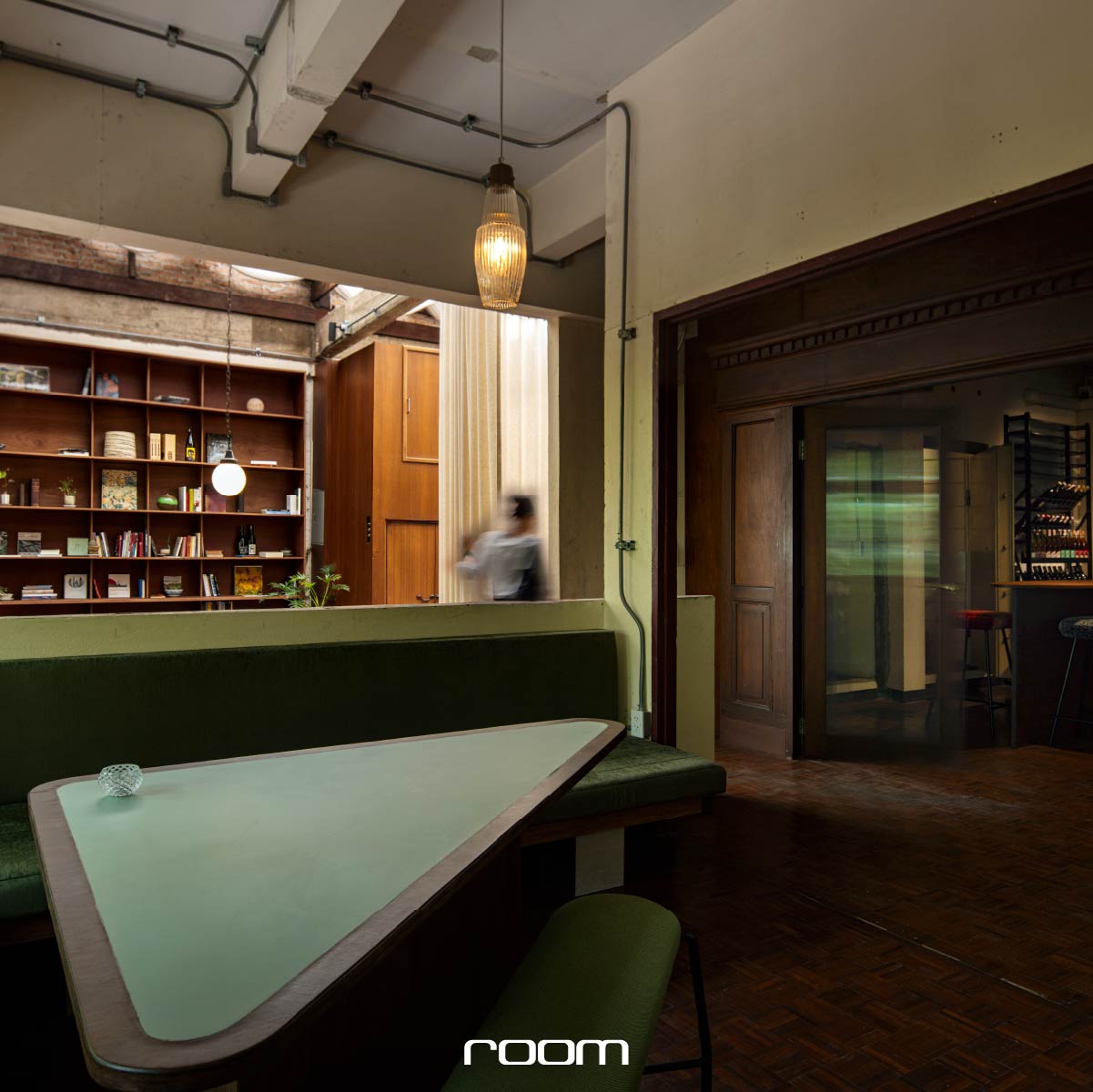พื้นที่อาคาร 3 ชั้น มีฟังก์ชันประกอบโถงโล่งที่ชั้น 1 ทำหน้าที่เปลี่ยนผ่านบรรยากาศจากภายนอกก่อนเข้าสู่อาคาร ในโถงนี้จะพบกับบันไดเก่าส่งผู้มาเยือนให้ขึ้นไปยังห้องสมุดบริเวณชั้น 2 ก่อนจะถัดมาถึงห้องเก็บไวน์ และโถงที่นั่งรับประทานอาหารและบาร์ ที่ได้รับการออกแบบให้สอดคล้องกับผนังอาคารเดิม พร้อมขับให้พื้นที่นี้โดดเด่นเป็นที่จดจำ ด้วยโคมไฟม่านและพรมผืนกลมขนาดใหญ่กลางโถง