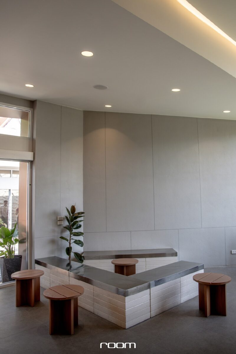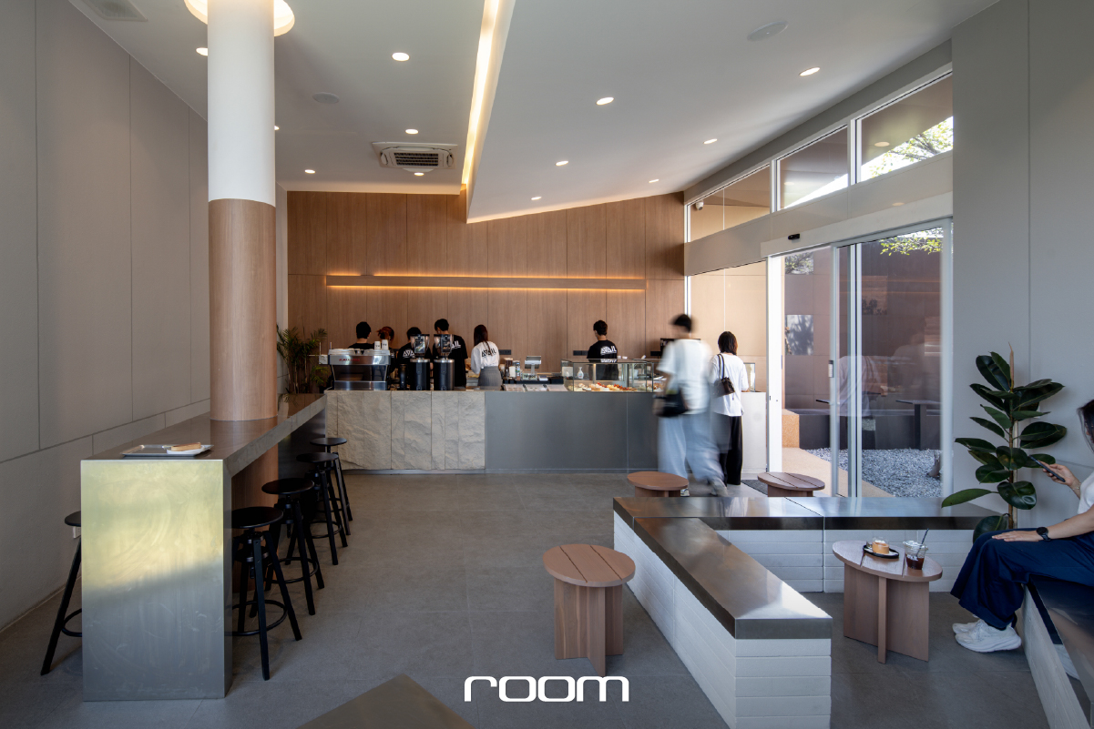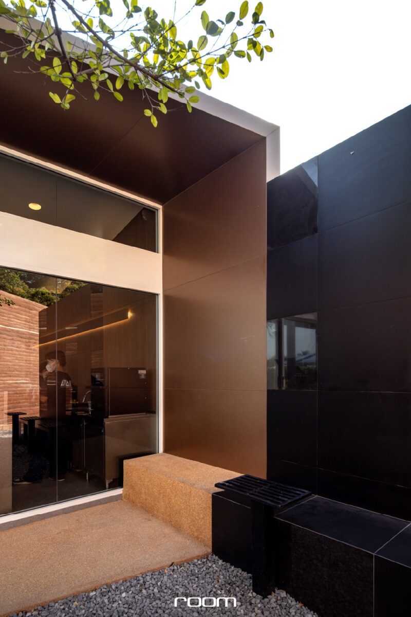 ด้านซ้ายมีอาคารต้อนรับ มีเคาน์เตอร์บาร์สเตนเลสสั่งเครื่องดื่ม รองรับการใช้งานแบบ Grab & Go เหมาะกับลูกค้าที่ต้องการสั่งเครื่องดื่มแล้วเดินทางไปเที่ยวโบราณสถานใกล้เคียงต่อ ส่วนอาคารพักผ่อน แยกออกไปอีกหลังหนึ่ง เหมาะกับลูกค้าที่ต้องการใช้เวลาพักผ่อนนาน ๆ ภายในอาคารดึงแสงและธรรมชาติภายนอกให้เข้ามาในพื้นที่ เน้นเฟอร์นิเจอร์ที่ใช้วัสดุทนทานอย่าง สเตนเลส เคลื่อนย้ายง่าย ยืดหยุ่น รองรับกิจกรรมต่าง ๆ ได้หลากหลาย