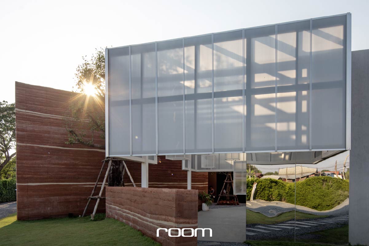 เริ่มจากด้านหน้าออกแบบเป็นกล่องสีขาวโปร่งแสงทำมาจากแผ่นพอลิคาร์บอเนต สะท้อนแนวคิดของยุค “ปัจจุบัน” ตัดกับความหนักแน่นของผนังดินอัด ตัวแทนของ “อดีต” ที่ย้อนไปถึงดิน จุดกำเนิดของก้อนอิฐ และโบราณสถานในอยุธยา มาจากแนวคิดการทำให้พื้นที่ส่วนนี้แสดงถึงการอินเตอร์เซกกันของเวลา เพื่อสร้างความน่าสนใจใหม่ ๆ และยังสามารถใช้รองรับกิจกรรม หรืองานศิลปะได้ในอนาคต