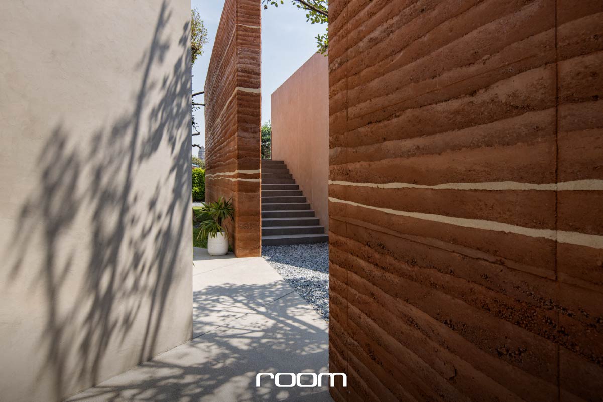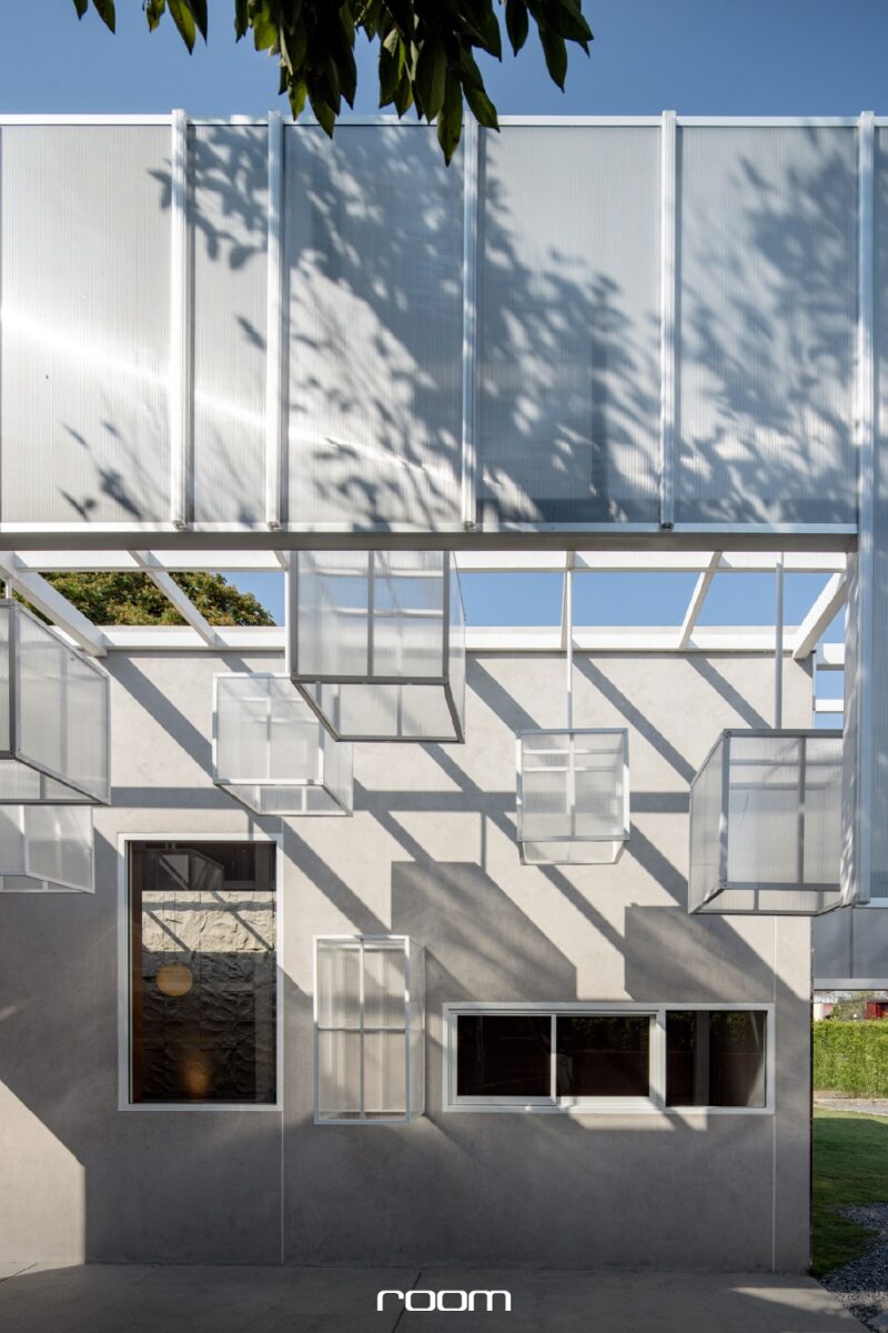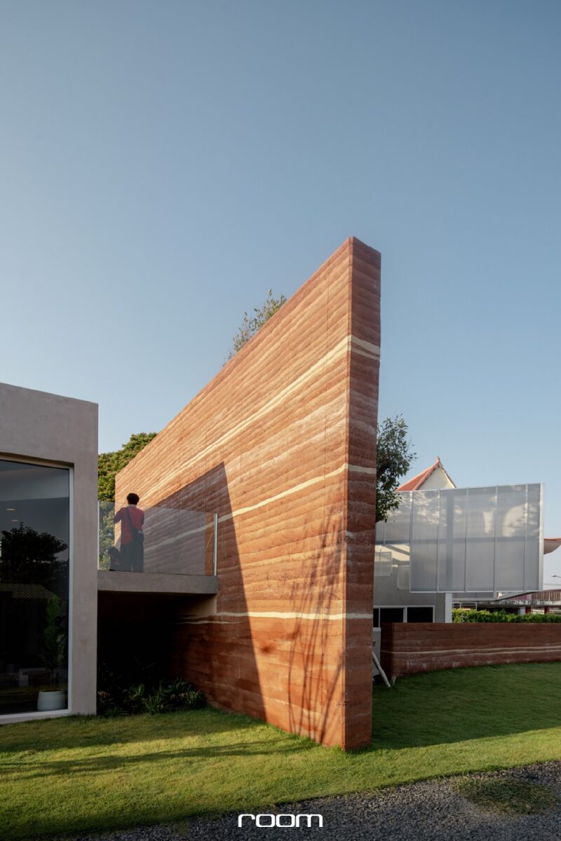 การแบ่งอาคารออกเป็นก้อนดังกล่าว ช่วยให้เกิดมุมมองที่หลากหลาย ไม่ว่าจะยืนอยู่ตรงไหนของอาคารก็จะเห็นอาคารและวัสดุที่แตกต่างกันทั้งกล่องสีขาว และผนังดินอัด