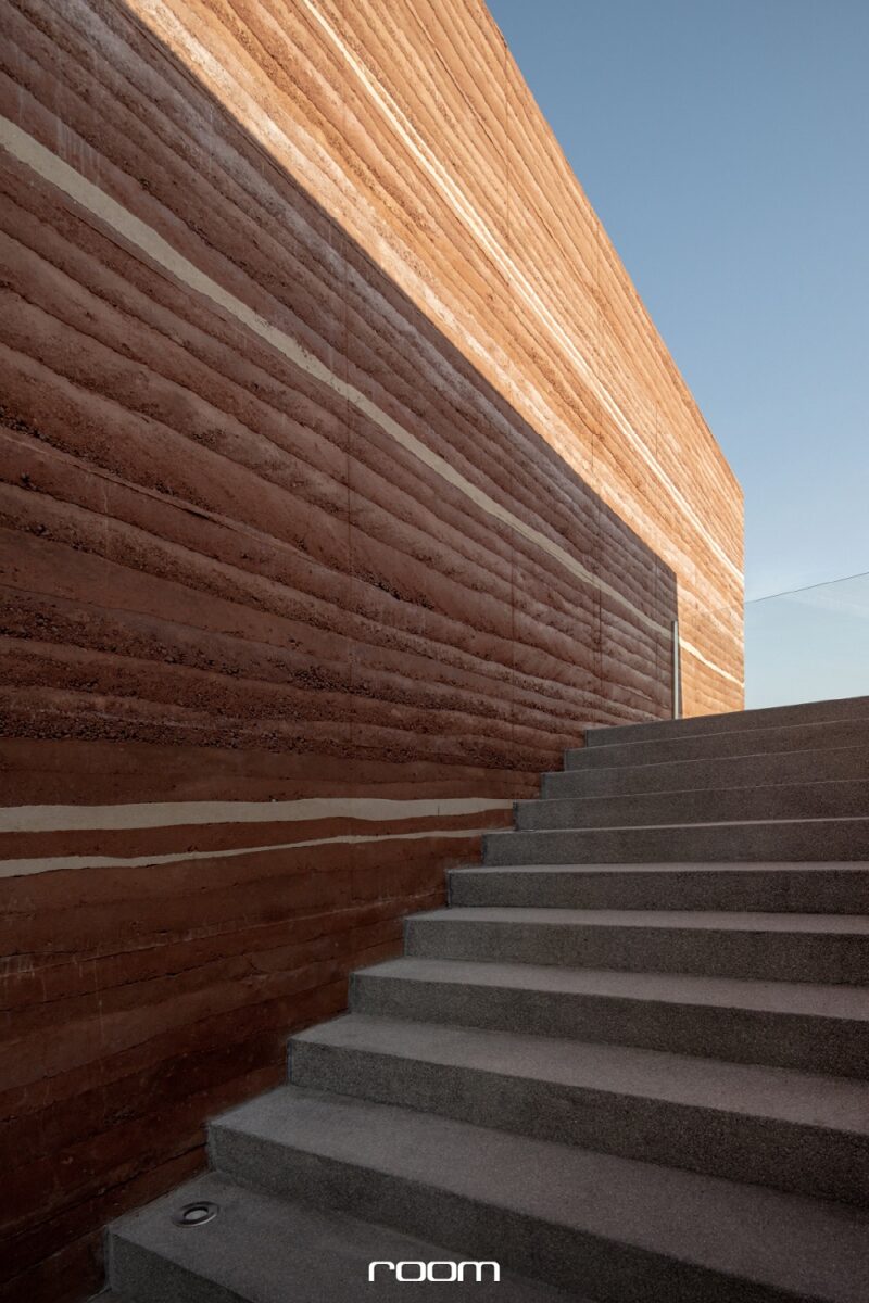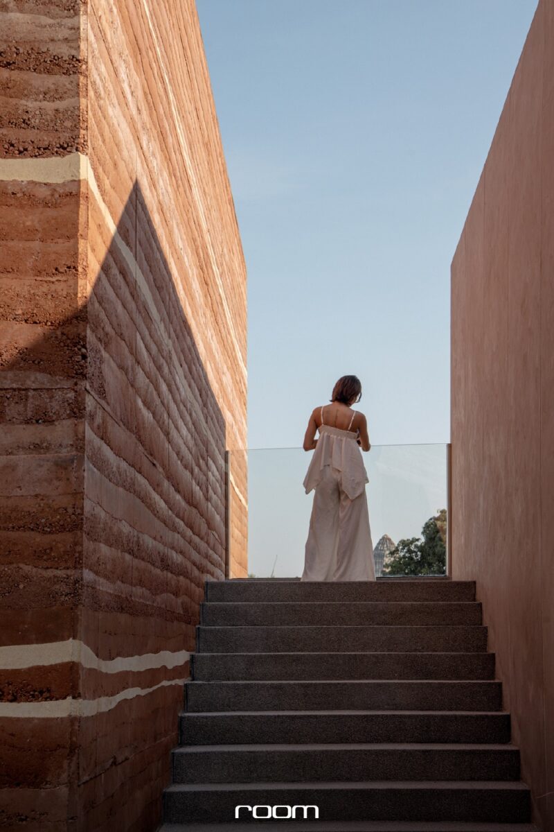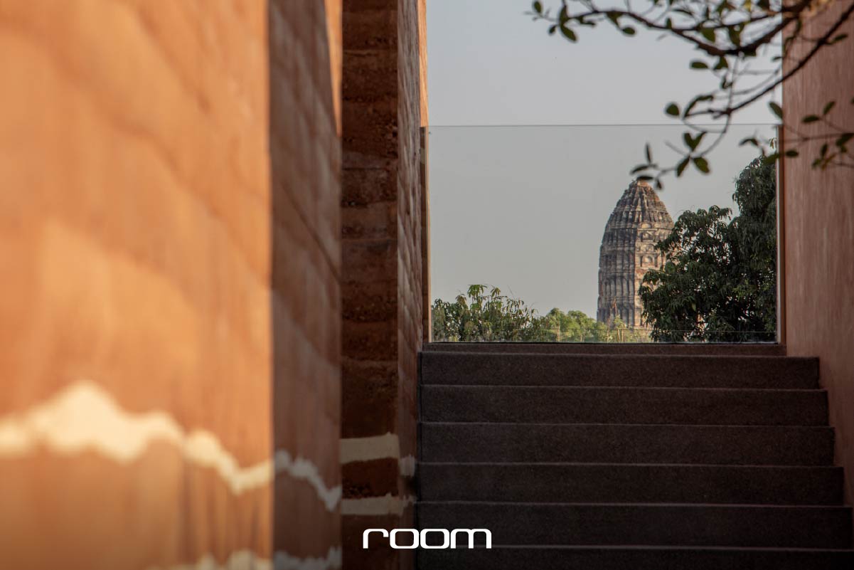 เพิ่มเติมมุมมองไฮไลต์ด้วยการทำบันไดชมวิว โดยทำบันไดไต่ความสูงขึ้นไปตามผนังดินอัดเรื่อย ๆ โดยบิดแกนผนังดินอัดเพื่อสร้างช่องเปิด(Void)พุ่งตรงไปยังยอดพระปรางค์วัดไชยวัฒนารามในระดับสายตาที่เหมาะสม อันเป็นจุดประสงค์หลักในการนำบริบทรอบ ๆ มาเป็นส่วนหนึ่งของสถาปัตยกรรมตามที่เจ้าของร้านต้องการ