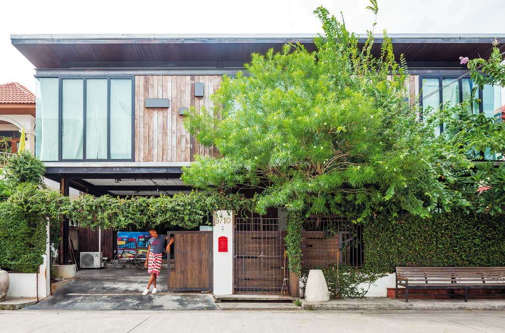 บ้าน 2 ชั้นสไตล์โมเดิร์นทรอปิคัล โดยใช้ไม้ผสมกับรูปทรงกล่องสี่เหลี่ยมและช่องกระจกที่เว้นระยะให้เกิดรูปด้านที่สวยงาม ตัวอาคารทอดยาวขนานไปกับรั้วหน้าบ้าน แทรกไปกับต้นไม้ดูเป็นธรรมชาติ ออกแบบแปลนเป็นรูปตัวซี (C) เว้นตรงกลางเป็นสระว่ายน้ำ ทำหน้าที่เป็นแกนกลางเชื่อมต่อมุมมองของทุกส่วนภายในบ้าน นอกจากนี้ยังทำช่องเปิดและติดกระจกโดยรอบ เพื่อรับแสงสว่างจากภายนอก ทำให้บ้านดูโปร่งและกว้างขึ้น วัสดุก่อสร้าง เช่น ไม้ หรือเฟอร์นิเจอร์และข้าวของที่ใช้ตกแต่งล้วนมีกลิ่นอายของความเก่าแบบไทยๆ