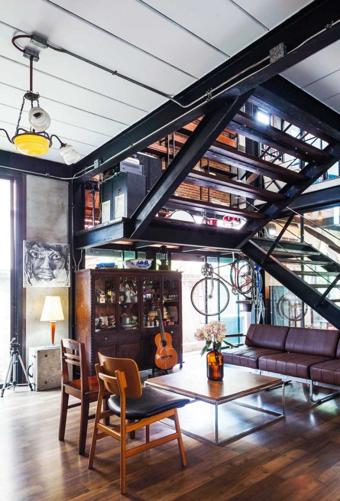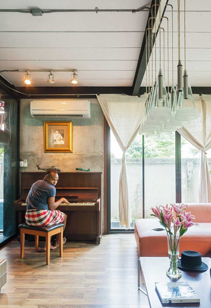 คอนโดมิเนียม ที่ตกแต่งโดยรวมใช้โทนสีขาวดูสว่างเข้ากับประตูกระจกโปร่งใสที่รับแสงธรรมชาติเข้ามาทำให้ห้องดูกว้างขึ้นและไม่ทึบ ตัวฝ้าเพดานและงานระบบเดิมถูกรื้อออกหมด เพื่อเดินระบบใหม่ตามบริเวณใต้แนวคาน ก่อนตีโครงไม้หุ้มต่ำลรอบคานแล้วทาสีตกแต่งให้เกิดเท็กซ์เจอร์ดูคล้ายไม้เก่า ที่สะดุดตาคือผนังข้างประตูเล็กๆที่ก่ออิฐเรียงกันสวยงามพร้อมแขวนจักรยานและสิ่งของต่างๆ รายล้อมด้วยบรรดาของสะสม ตั้งแต่หมวก กระเป๋าหวาย ตุ๊กตาตัวเล็กกระจุกกระจิก รวมถึงมุมเปียโนและเครื่องดนตรีชนิดต่างๆด้วยคุณลุลามักใช้นั่งเล่นแต่งเพลงในบางเวลา