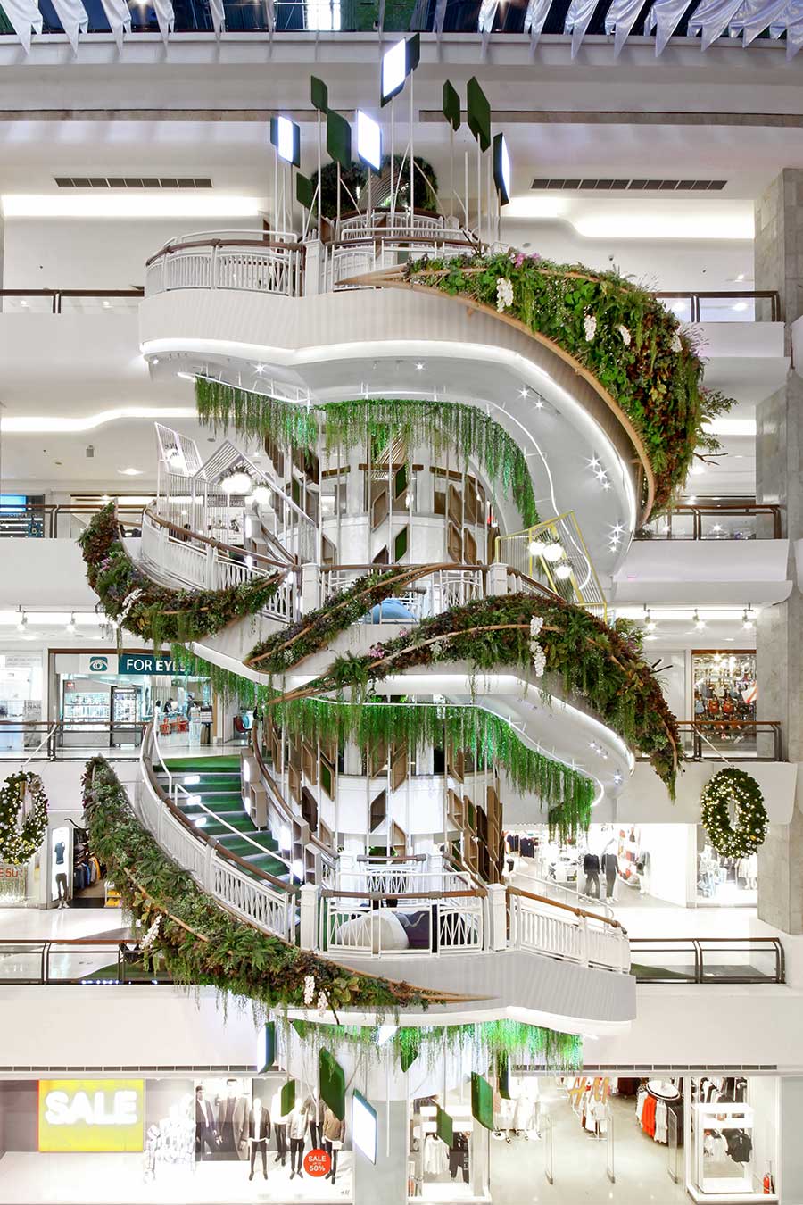 และนี่เป็นผลงานที่ช่วยชุบชีวิตบันไดวนเก่าในห้างสรรพสินค้า ที่ปัจจุบันจะถูกรื้อถอนออกไปมากแล้ว ให้ยังคงอยู่เพื่อสร้างชีวิตให้แก่ผู้ใช้งาน “Tree of Life” ของ ศูนย์การค้าเซ็นทรัลพลาซา บางนา ผลงานที่สร้างสรรค์มาจากจินตนาการ ด้วยแรงบันดาลใจจากธรรมชาติ นำมาสรรค์สร้างด้วยการผสานความล้ำสมัยของเทคโนโลยี และความละเอียดอ่อนของงานฝีมือ เพื่อสร้างพื้นที่แห่งการสร้างสรรค์ และสร้างความรู้สึกดีๆต่อกันให้กับผู้คนในทุกช่วงวัย