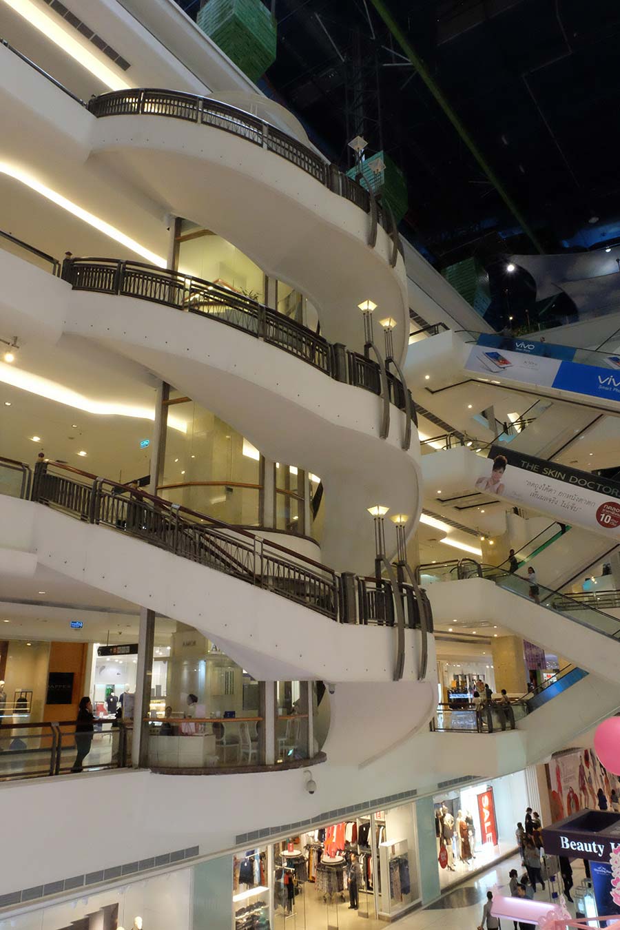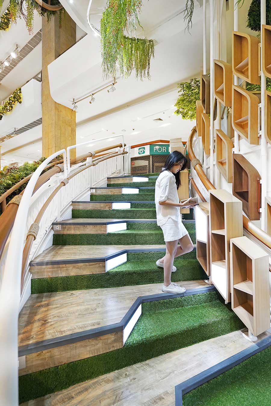 ในยุคสัก 20 – 30 ปีก่อน ห้างสรรพสินค้ามักจะใช้ “บันไดวน” ในการเชื่อมต่อพื้นที่ในแต่ละชั้นในแนวตั้ง อีกทั้งยังเป็นสัญลักษณ์แสดงถึงความหรูหรา เสริมสร้างภาพลักษณ์ที่ดีให้กับห้างสรรพสินค้านั้นๆ แต่เมื่อเวลาผ่านไปเทคโนโลยีก้าวหน้ามากขึ้น มีทั้งบันไดเลื่อนและลิฟต์ รวมถึงพฤติกรรมการใช้รถยนต์มาห้าง ทำให้การใช้บันไดลักษณะนี้กลายเป็น “พื้นที่ที่ถูกลืม” เช่นเดียวกับที่ศูนย์การค้า เซ็นทรัลพลาซา บางนา