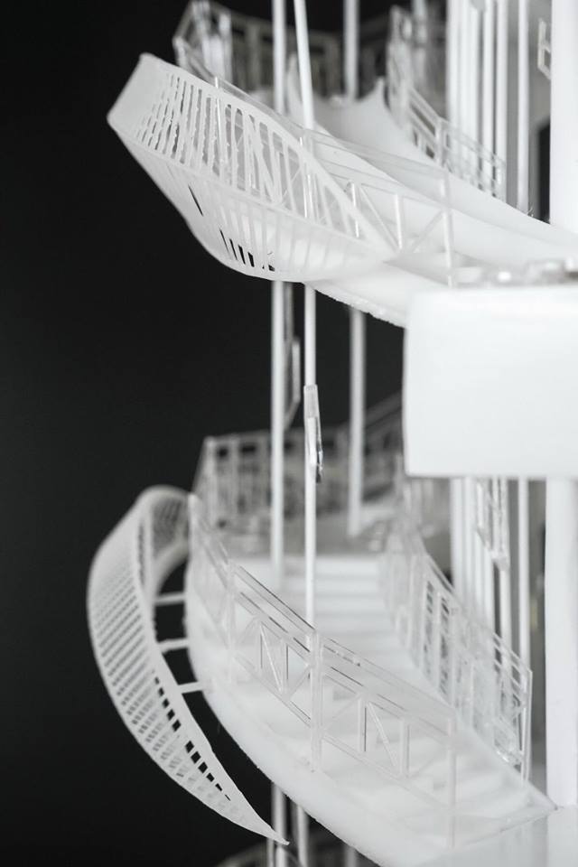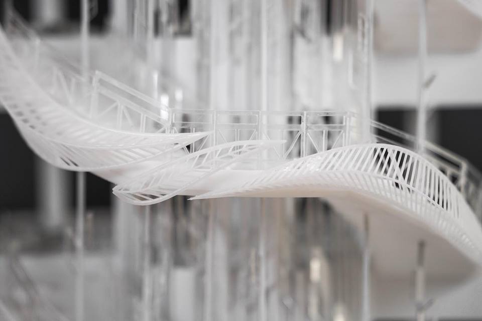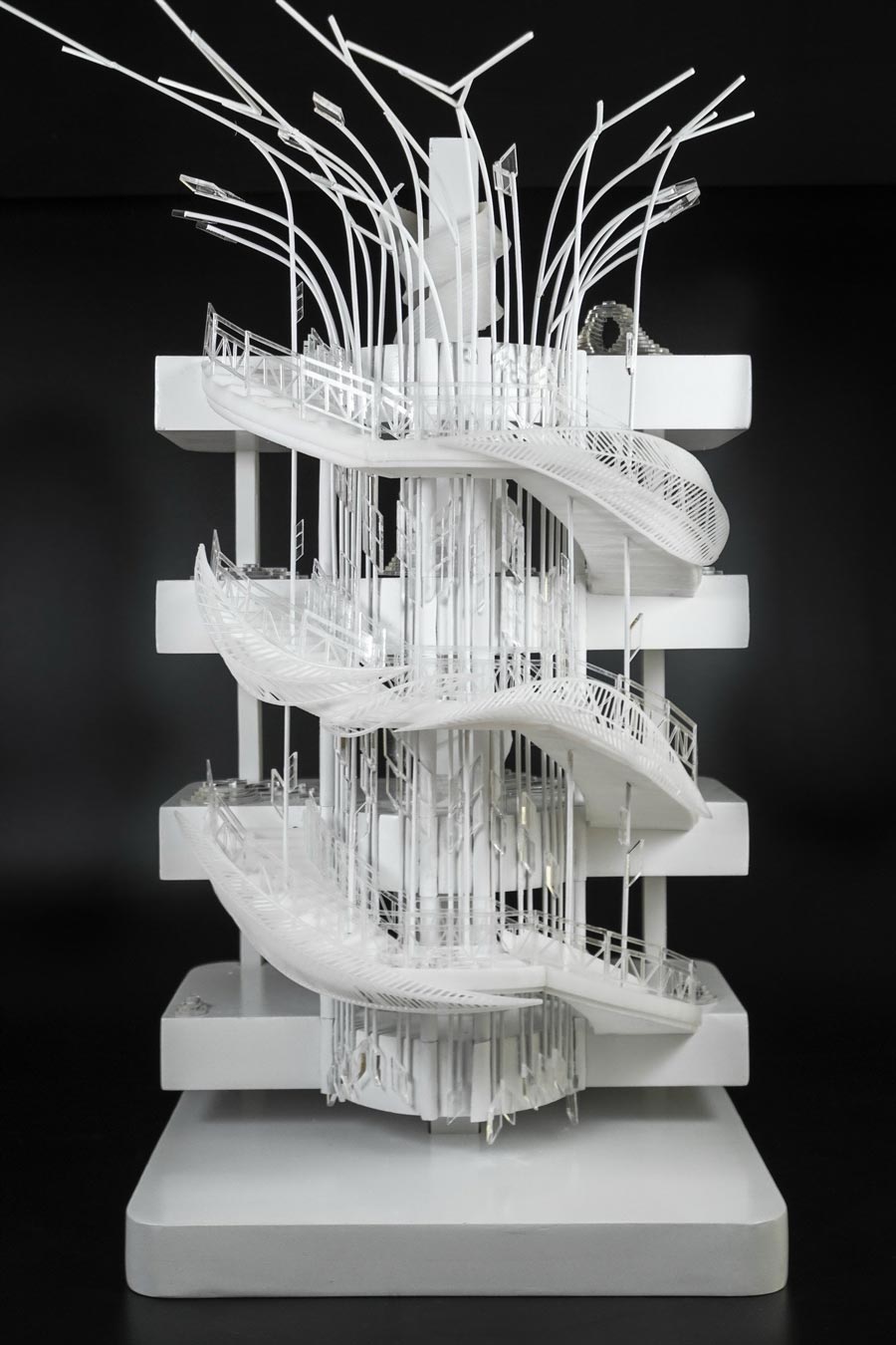 จากนั้นจึงเข้าสู่การพัฒนา Form ที่ใช้วิธีการ “3D Printing” ในการคลี่คลาย Form อิสระเลียนแบบธรรมชาติ (Organic Form) ให้สามารถสร้างได้จริงตามภาพในจินตนาการ ซึ่งได้มีการทดลองค้นหารูปทรง การแยกชิ้นส่วน และเทคนิคการติดตั้งที่เหมาะสม ผ่านการปรับแบบร่างใน Computer Modeling ก่อนมาใช้ 3D Printing และ Mock up model ด้วยช่างฝีมือ ซึ่งเป็นการผสานทั้งความก้าวหน้าของเทคโนโลยีเข้ากับการผลิตแบบงานฝีมือ ทั้งการขึ้นชิ้นงาน และติดตั้งบนพื้นที่ที่มีลักษณะโค้งรูปแบบเฉพาะ โดยชิ้นงานส่วนใหญ่มีรูปแบบต่างกัน ติดตั้งต่างมุม ต่างองศากันเพื่อให้ได้ลักษณะที่คล้ายกับธรรมชาติให้มากที่สุด พร้อมทั้งแต่งเติมด้วยต้นไม้ประดิษฐ์ แซมอยู่ทั่วไปในลำเกลียวเหล็กบิดโค้ง และโครงสร้างใบไม้เหล็ก โดยช่างฝีมือ เพื่อลดทอนความแข็งกระด้างของโครงสร้าง