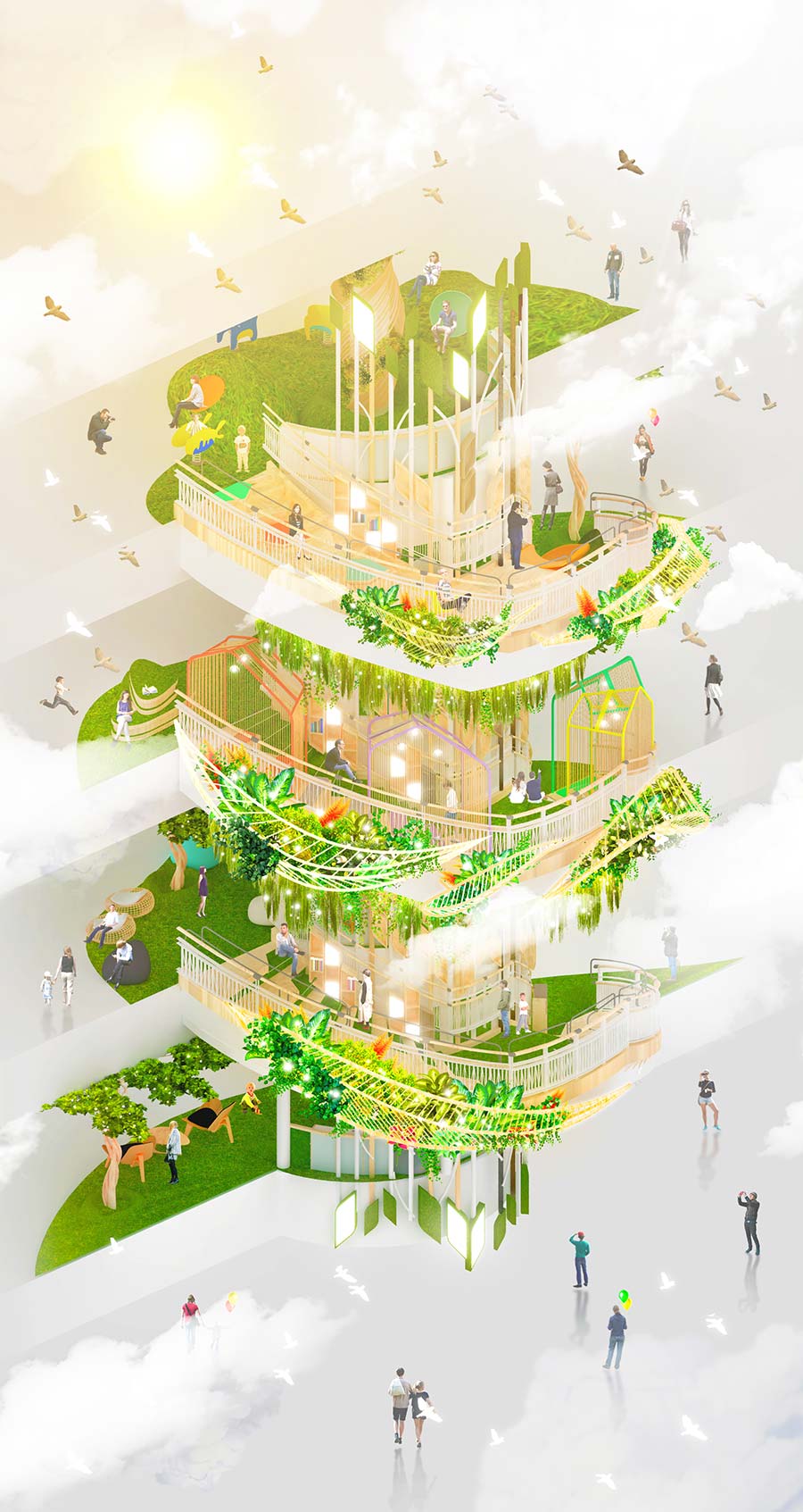 จากโจทย์ที่ได้รับในการเพิ่มมูลค่า และ Traffic ให้กับพื้นที่บันใดวนเก่าที่ไม่ค่อยได้ใช้งาน ทั้งที่ตำแหน่งที่ตั้งที่อยู่ใจกลางศูนย์การค้าโดยได้เชื่อมพื้นที่ในแต่ละชั้นตั้งแต่ชั้น 2 ถึงชั้น 5 เข้าด้วยกัน บันไดวนจึงต้องเป็นโครงสร้างโค้งสวยงาม สามารถมองเห็นได้ในหลายมุมมอง หลังจากได้ระดมความคิดว่าในแต่ละช่วงวัยนั้นต้องการอะไร ต้องการพื้นที่ และกิจกรรมแบบไหน จึงทำให้เกิดแนวคิด “Tree of Life” ต้นไม้แห่งชีวิต ที่เสริมสร้างให้ทุกเพศและทุกช่วงวัย มีช่วงเวลาที่ดีที่สุด และทำให้เกิดภาพ Conceptual ด้วยวิธี “Digital Paint” ที่สามารถอธิบายภาพรวมของการออกแบบชิ้นนี้ได้ดีที่สุด