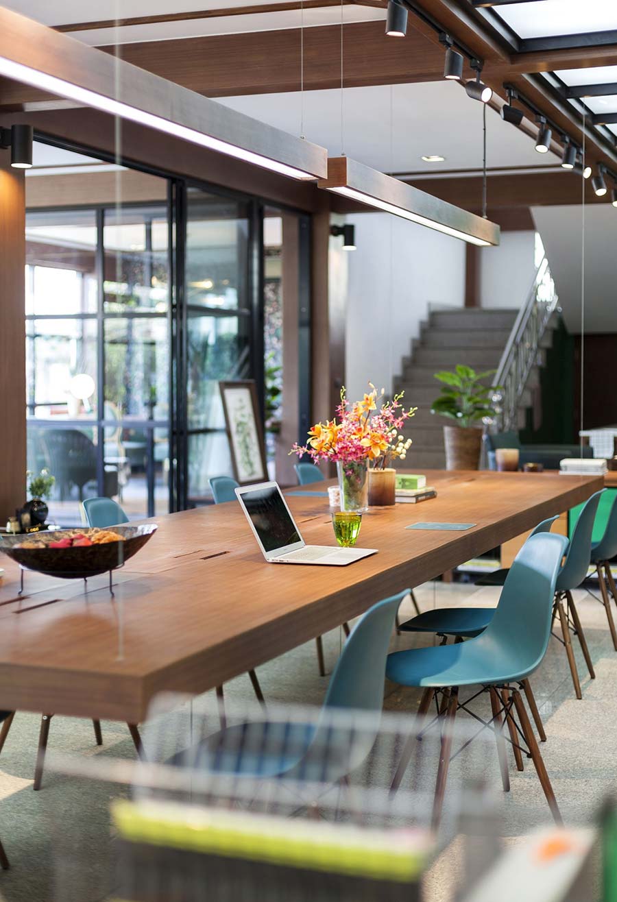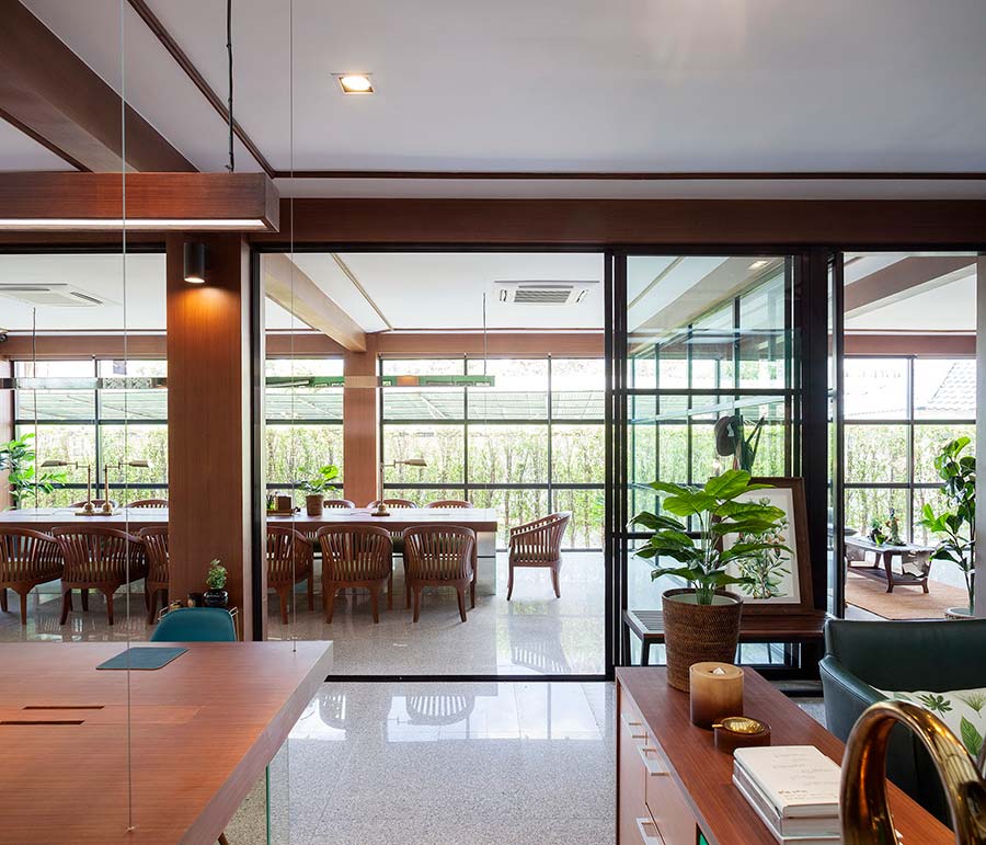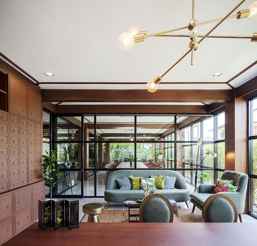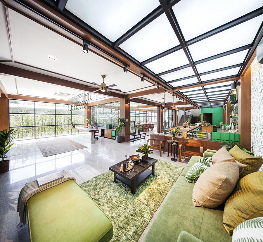 ในส่วนของงานรีโนเวตนั้น เนื่องจากอาคารเดิมเป็นโรงงานเก่า ผู้ออกแบบจึงออกแบบโดยนำกลิ่นอายของบ้านในท้องถิ่นของอำเภอสามพราน มาเป็นบริบทของพื้นที่สำนักงาน ซึ่งทางผู้ออกแบบนิยามสไตล์นี้ว่า ‘โมเดิร์นสามพราน’ และด้วยพื้นที่ที่มีเพียง 250 ตร.ม. จึงต้องออกแบบให้สำนักงานรู้สึกโปร่งโล่ง และไม่ให้บรรยากาสศรู้สึกเหมือนเป็นสำนักงาน แต่ให้รู้สึกให้เหมือนบ้านมากที่สุด โดยดึงลักษณะพิเศษของบ้าน โรงแรม คาเฟ่ ไปจนถึงสปา ซึ่งเป็นสถานที่พักผ่อนแบบไทยๆ มาใช้ในการออกแบบ เพื่อให้ผู้ใช้พื้นที่รู้สึกผ่อนคลายมากที่สุด อีกทั้งยังจัดวางเฟอร์นิเจอร์ให้แต่ละคนสามารถมองเห็นกันละกันได้ แต่ในขณะเดียวกันก็เป็นพาทิชั่น ที่สามารถกั้นพื้นที่สำหรับจัดเป็นพื้นที่ใช้งานอเนกประสงค์ของผู้ใช้งานในอนาคต