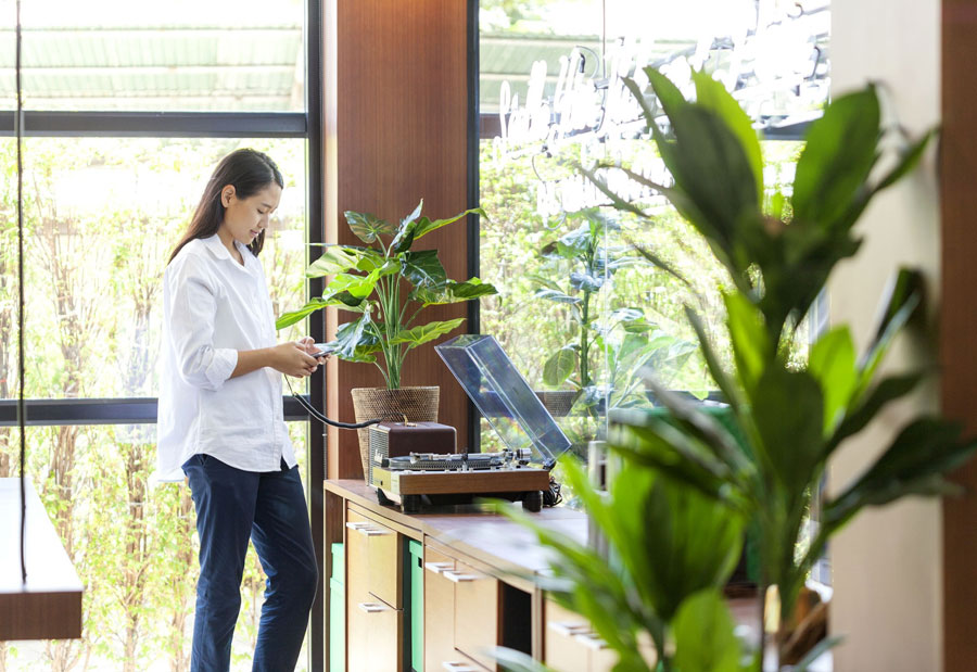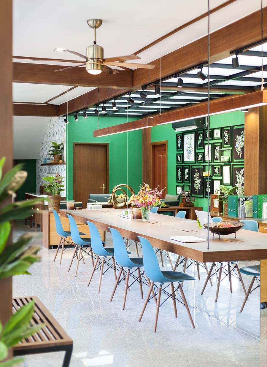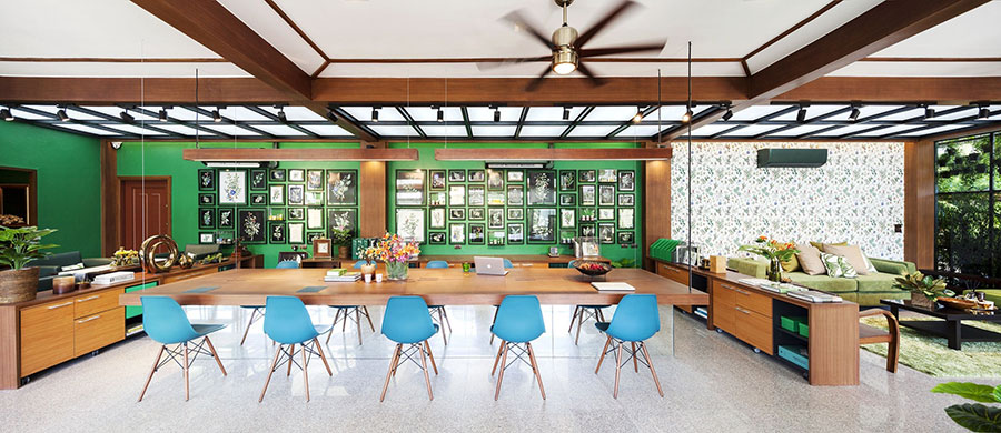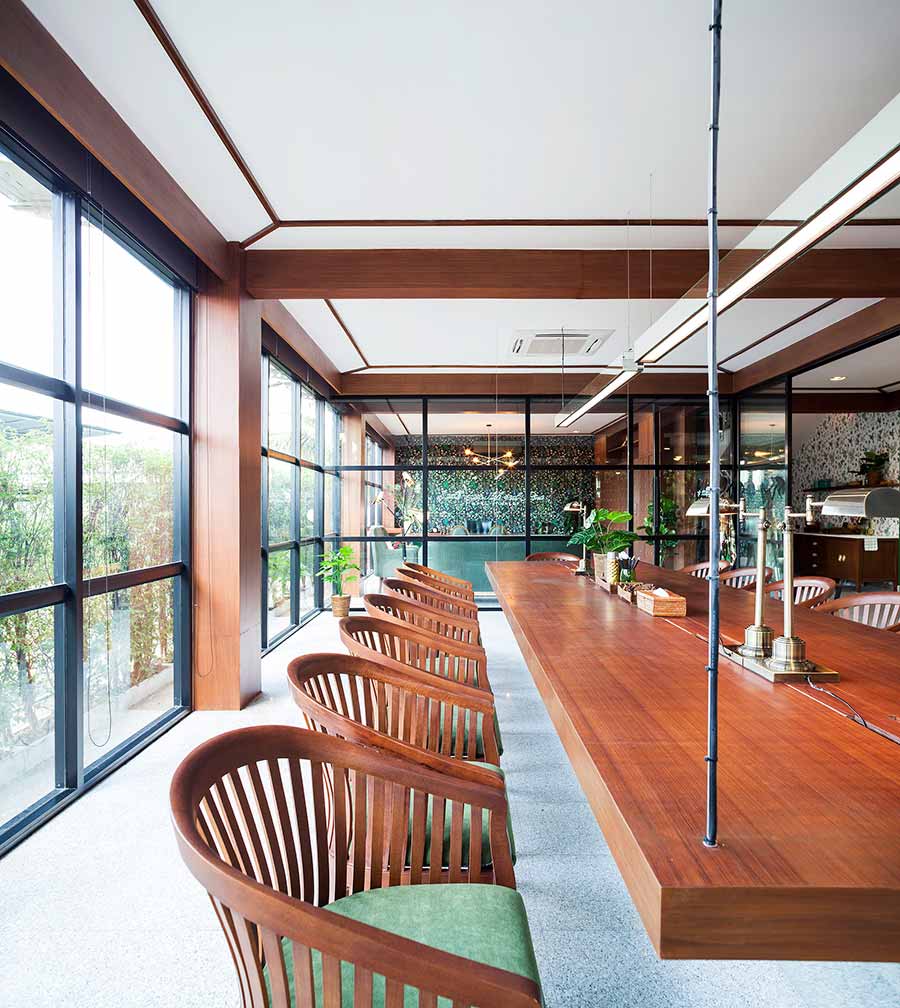 ในส่วนของงานรีโนเวตนั้น เนื่องจากอาคารเดิมเป็นโรงงานเก่า ผู้ออกแบบจึงออกแบบโดยนำกลิ่นอายของบ้านในท้องถิ่นของอำเภอสามพราน มาเป็นบริบทของพื้นที่สำนักงาน ซึ่งทางผู้ออกแบบนิยามสไตล์นี้ว่า ‘โมเดิร์นสามพราน’ และด้วยพื้นที่ที่มีเพียง 250 ตร.ม. จึงต้องออกแบบให้สำนักงานรู้สึกโปร่งโล่ง และไม่ให้บรรยากาสศรู้สึกเหมือนเป็นสำนักงาน แต่ให้รู้สึกให้เหมือนบ้านมากที่สุด โดยดึงลักษณะพิเศษของบ้าน โรงแรม คาเฟ่ ไปจนถึงสปา ซึ่งเป็นสถานที่พักผ่อนแบบไทยๆ มาใช้ในการออกแบบ เพื่อให้ผู้ใช้พื้นที่รู้สึกผ่อนคลายมากที่สุด อีกทั้งยังจัดวางเฟอร์นิเจอร์ให้แต่ละคนสามารถมองเห็นกันละกันได้ แต่ในขณะเดียวกันก็เป็นพาทิชั่น ที่สามารถกั้นพื้นที่สำหรับจัดเป็นพื้นที่ใช้งานอเนกประสงค์ของผู้ใช้งานในอนาคต