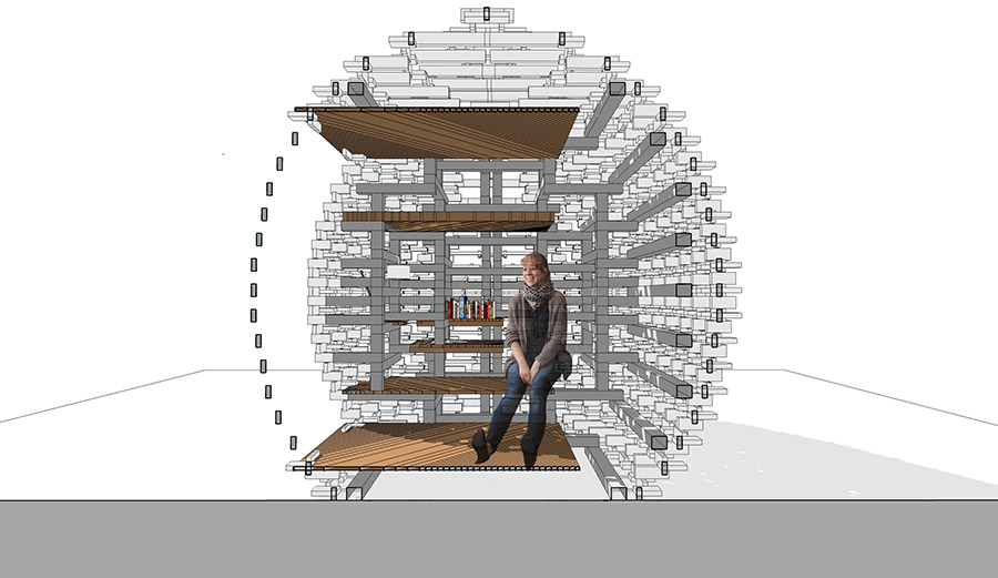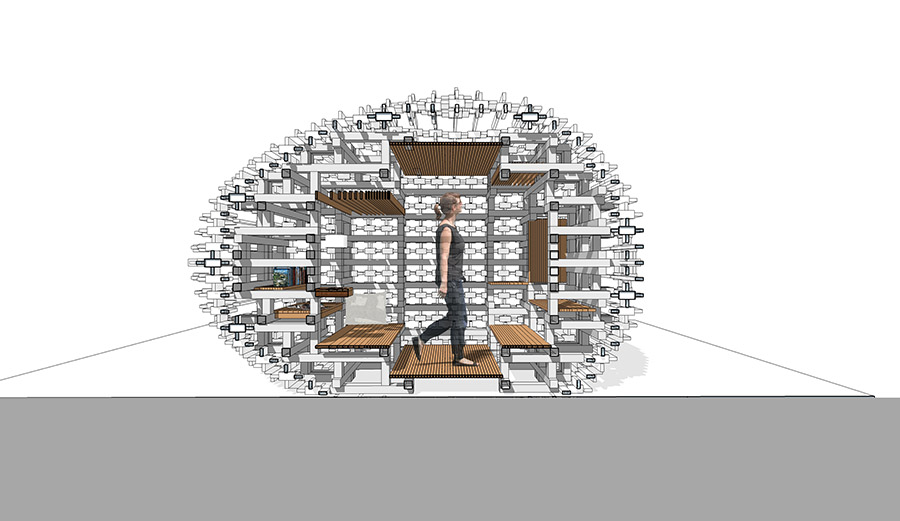 อีกหนึ่งผลงานของคุณจีรเวช หงสกุล คือศาลาอเนกประสงค์รูปทรงไข่ ผลิตจากไม้สังเคราะห์ที่พัฒนาขึ้นมาใหม่เพื่อตอบโจทย์งานดีไซน์ที่ล้ำสมัยยิ่งขึ้น โดยเลือกสะท้อนแนวคิดผ่านรูปทรงไข่ที่นับเป็นรูปทรงต้นแบบที่ประกอบขึ้นรูปได้ยากที่สุด แบ่งพื้นที่ออกแบบเป็น 2 ส่วนคือ ส่วนที่เป็นเปลือกภายนอกศาลา (Shell) และส่วนที่เปรียบเป็นไข่แดง (Yolk) ฟังก์ชั่นการใช้งานปรับเปลี่ยนไปตามผู้ใช้พื้นที่ ซึ่งรูปทรงรูปไข่นี้จะช่วยดึงดูดความสนใจของผู้ใช้งานจากรูปลักษณ์ภายนอกเข้าสู่ความต้องการใช้งานพื้นที่ภายใน