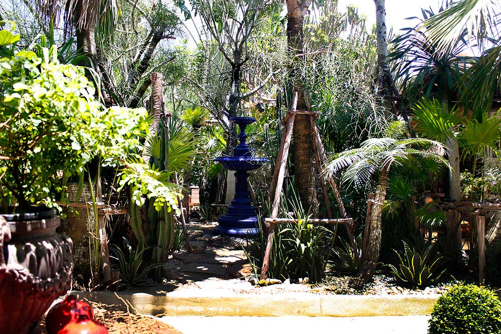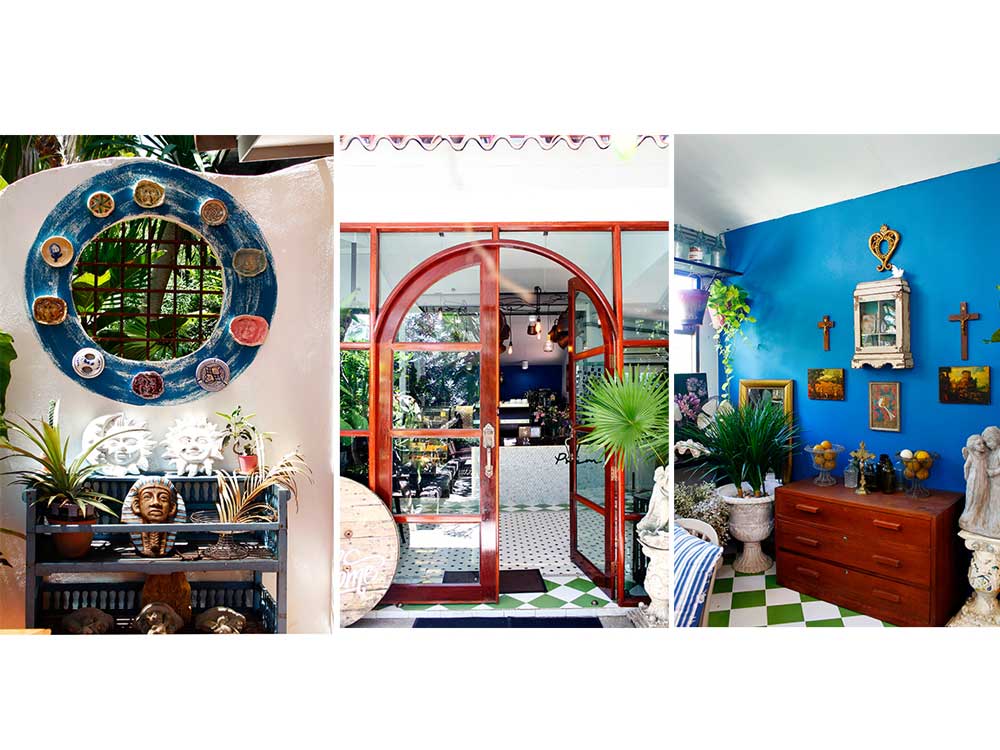 กลิ่นอายความเป็นสวนเม็กซิกันเริ่มทักทายเราตั้งแต่กำแพงรั้วทรงโค้งที่ประดับด้วยแคคตัสหลากหลายสายพันธุ์ ก่อนเข้าสู่มุมสวนด้านหน้าที่ปลูกต้นไม้อย่างปาล์มสูงกว่า 4 เมตร และแคคตัสที่บางต้นสูงถึง 2 เมตรเลยก็มี สร้างบรรยากาศเขียวครึ้มที่ช่วยพรางอาคารคาเฟ่เอาไว้ นอกจากนี้ยังเติมสีสันสดใสด้วยการจัดวางกระถางเอิร์นสีชมพูสด กระถางน้ำพุ ซากรถโฟล์คขึ้นสนิม สัญญาณไฟจราจร และซุ้มไม้ที่ประกอบขึ้นจากเศษไม้เหลือใช้ พร้อมมีทางเดินเชื่อมเข้าสู่คาเฟ่