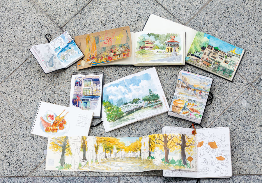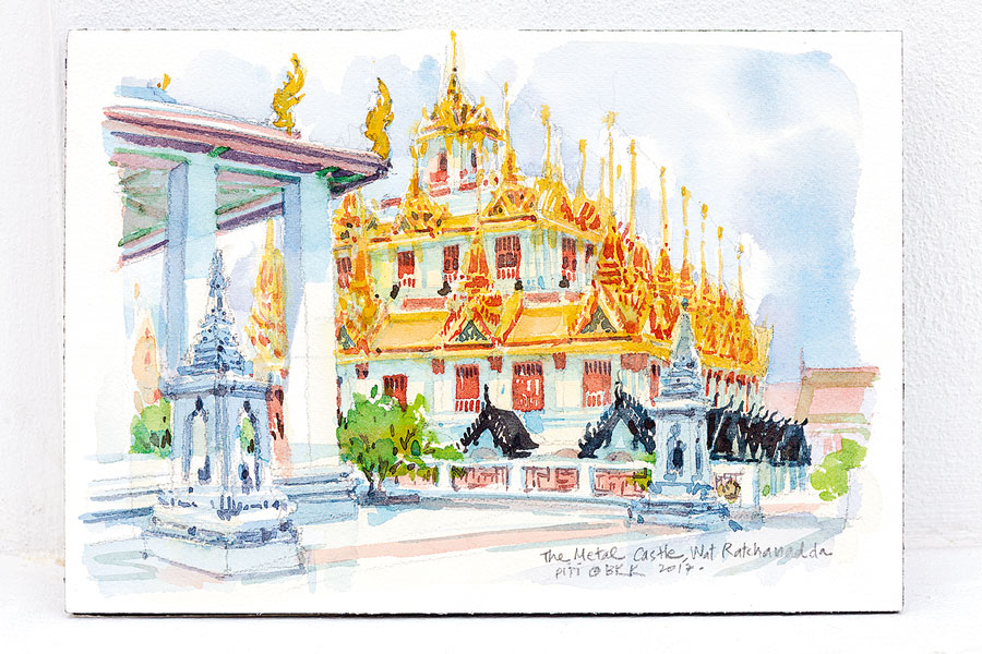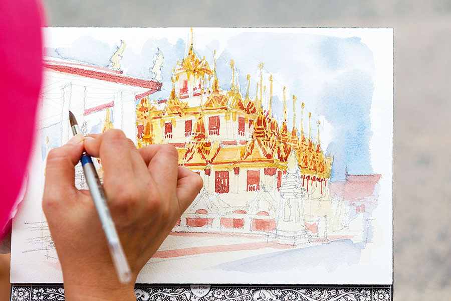 แม้จะมีฝีมือด้านศิลปะอยู่แล้ว แต่ความยากกลับอยู่ตรงที่ต้องก้าวข้ามทฤษฎีและสัดส่วนที่แม่นยำหรือถูกผิดในเชิงสถาปัตยกรรมไป เพื่อปล่อยให้อารมณ์ความรู้สึกนำพาลายเส้นแล้วแต้มด้วยสีน้ำอ่อนๆ ถ่ายทอดความประทับใจที่มีต่ออาคารสถานที่ ผู้คน แสงเงาที่พาดผ่าน เสียงจอแจในชุมชน กลิ่นอาหารหอมๆ กระทั่งน้องหมาน้องแมวที่เดินผ่านอย่างสบายอารมณ์ นี่ละเสน่ห์ของการวาดแบบไร้กฎเกณฑ์