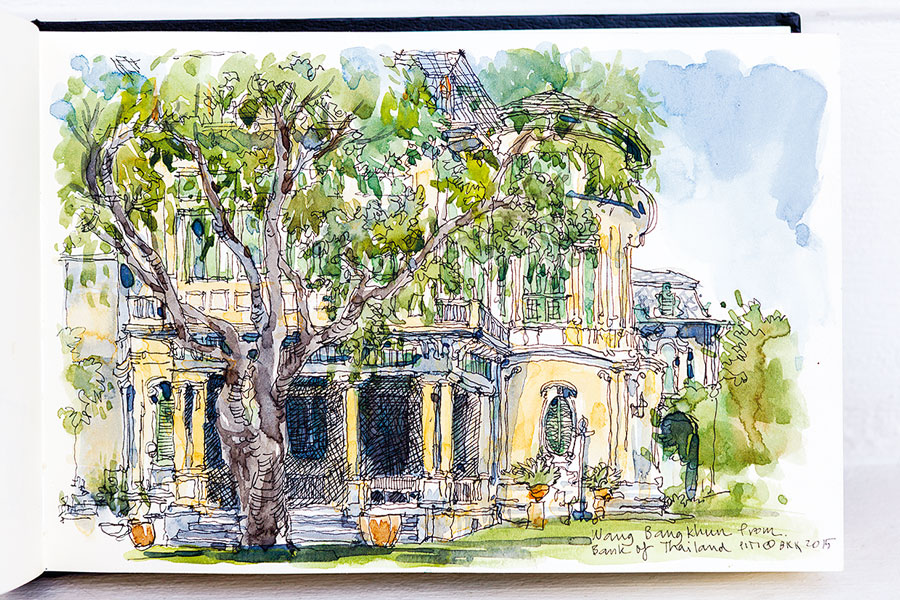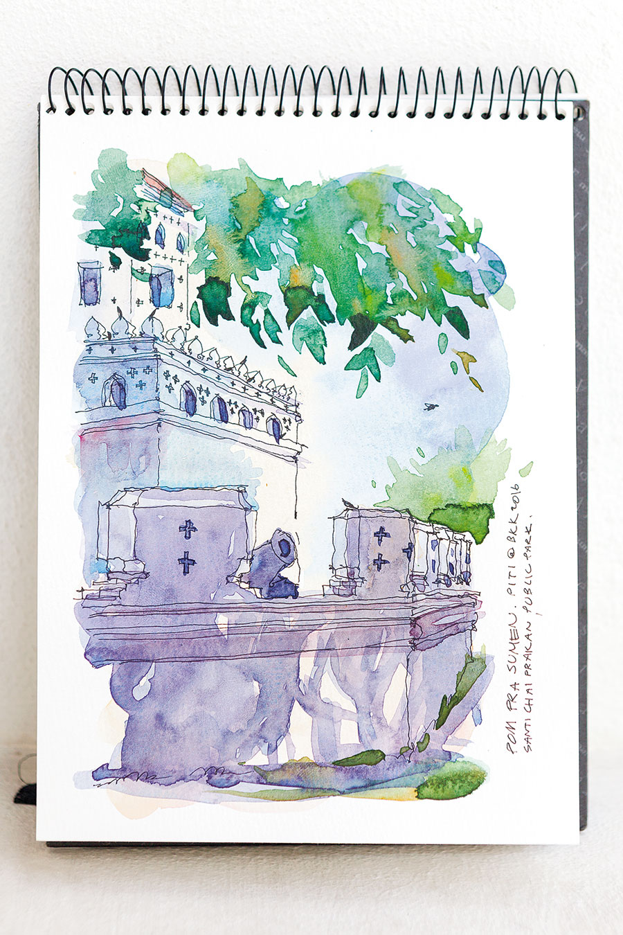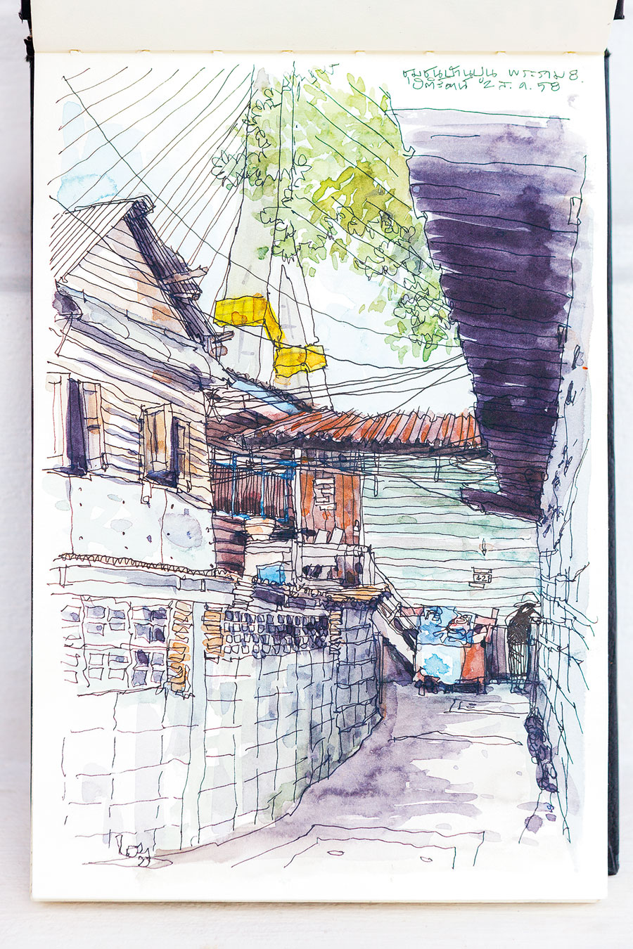 “จริงๆ ตอนเรียนสถาปัตย์ปีแรกต้องเรียนเรื่องความเข้าใจของเส้นสายเพื่อเป็นพื้นฐานการออกแบบอยู่แล้ว แต่หลังจากนั้นก็ไม่ได้วาดรูปด้วยความสนุกอีกเลย จนมีรุ่นพี่มาชวนเข้ากลุ่มในเฟซบุ๊ก เพื่อนัดกันไปวาดรูปตามสถานที่ต่างๆ ที่สนใจเพราะเขาไม่มีวัตถุประสงค์อื่นเลยนอกจากความสุขในการวาด ก็เลยออกไปซื้ออุปกรณ์ง่ายๆ แบบมือสมัครเล่น จากวันนั้นที่ออกไปวาดจนถึงวันนี้ก็ 7 ปีแล้วค่ะ แถมตอนนี้ยังกลายเป็นแอดมินให้เพจ Bangkok Sketcher ไปด้วย”