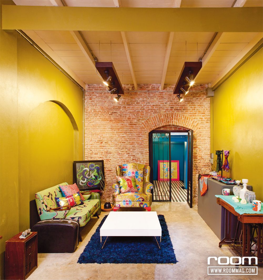 เดินเข้ามาภายในบ้านมีการเล่นสีสันฉูดฉาดหลากหลายดูทันสมัย เห็นได้จากมุมรับแขกในชั้นหนึ่งที่ทาผนังสีเหลืองอมเขียวล้อไปกับชุดโซฟาลวดลายต่าง ๆ ที่เป็นผลงานของคุณเอิ้นเอง ส่วนของตกแต่งก็มีทั้งของเก่าและใหม่ผสมผสานกันไป อย่างกระเป๋าเดินทางใบเก่าของคุณปู่ ลำโพงไม้ของคุณพ่อ หรือจะเป็นจักรเย็บผ้าโบราณของคุณยาย ซึ่งนำมาใช้เป็นโต๊ะวางเซรามิกสมัยใหม่ได้อย่างลงตัว ส่วนเรื่องของโครงสร้างถ้ามองดูดี ๆ จะเห็นได้ว่าโครงสร้างทุกอย่างยังคงเดิม ทั้งผนังที่เจาะช่องโค้งแบบซุ้มประตูตามวัฒนธรรมของตะวันตกที่แพร่หลายในอดีต และการทำผนังให้หนากว่าปกติราว 50 – 60 เซนติเมตร เพื่อใช้รับน้ำหนักแทนระบบเสาคาน ซึ่งเป็นเทคนิคและค่านิยมทางสถาปัตยกรรมในสมัยนั้น รวมถึงการโชว์ฝ้าเพดานไม้ที่ปูเป็นพื้นชั้นบน เรียกว่าไม่มีการทุบโครงสร้างเดิมออกเลย เพราะเป็นบ้านเก่ามีข้อห้ามและกฎข้อบังคับเยอะแยะ การปรับเปลี่ยนจึงค่อนข้างลำบาก แต่คุณเอิ้นก็โชคดีที่มี คุณจุฬาทิพย์ อินทราไสย พี่สาวคนสนิทมารับหน้าที่เป็นสถาปนิกคอยให้คำปรึกษา ช่วยดูเรื่องโครงสร้างต่าง ๆ ให้บ้านหลังนี้ยังคงมีกลิ่นอายของตึกแถวสมัยเก่าที่ดูคลาสสิก