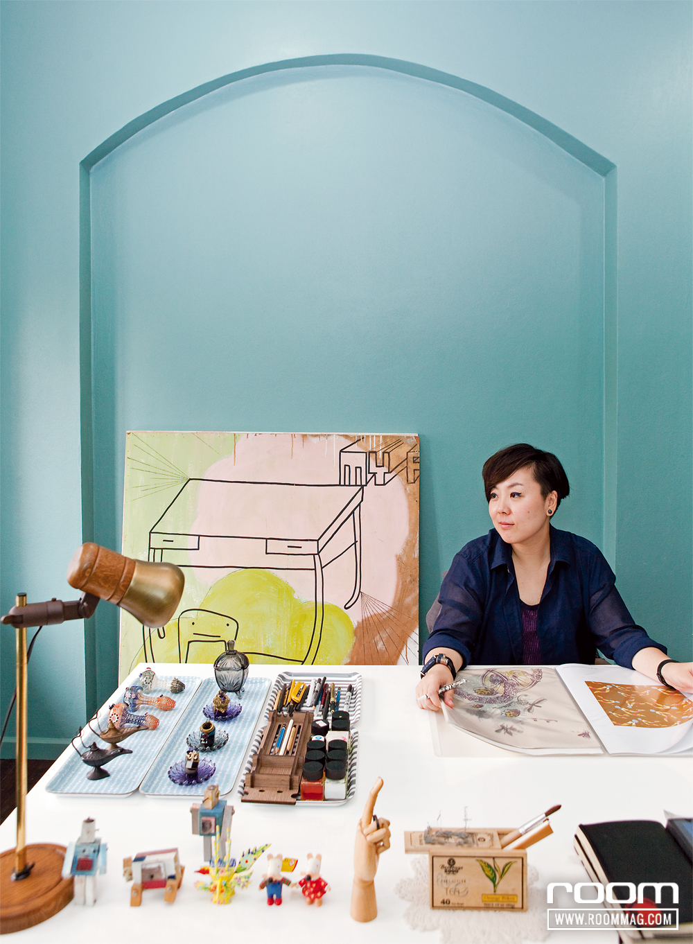 ส่วนชั้นสองทำเป็นมุมห้องทำงานขนาดย่อม คุณเอิ้นมักใช้เวลามานั่งทำงานอยู่ในห้องนี้เป็นส่วนใหญ่ ภายในประกอบด้วยโต๊ะสีขาวตั้งอยู่กลางห้อง สามารถใช้ทำงานได้ทุกมุมรอบโต๊ะ และมีชั้นวางหนังสือและของสะสม รวมถึงงานศิลปะที่ได้มาจากเพื่อน ๆ โดยนำมาวางตกแต่งไว้ทั่วทั้งห้อง ช่วยเติมความอบอุ่นให้บ้านได้ดี บรรยากาศห้องทำงานดูสบายตาด้วยโทนสีฟ้าอ่อน ฝ้าเพดานเป็นแผ่นฝ้าไฟเบอร์ซีเมนต์สีขาว ฝังไฟดาวน์ไลท์ที่ได้มาจากร้านขายของเก่า ติดกระจายเป็นจุด ๆ ทั่วเพดาน ส่วนหน้าต่างบานไม้เก่าที่ติดกับถนนหน้าบ้านก็ทำหน้าที่เปิดรับสายลมและแสงสว่างให้ชั้นสองดูปลอดโปร่ง นอกจากนี้ยังสามารถมองเห็นภาพผู้คนที่เคลื่อนไหวไปตามจังหวะลีลาชีวิต อบอวลด้วยกลิ่นอายและบรรยากาศที่มีเสน่ห์ซึ่งหาจากที่ใดไม่ได้ นอกจากถิ่นฐานย่านเก่านาม ‘เยาวราช’ แห่งนี้…