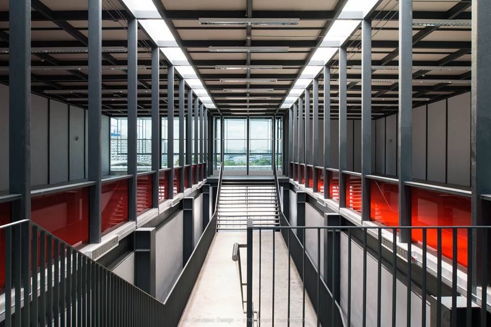 ดังนั้นเราจึงเห็นแผงเปลือกอาคารขนาดใหญ่โอบล้อมอาคารเรียน และซ่อนอาคาร 5 ชั้นไว้ภายใน โดยชั้นแรกออกแบบให้เป็นพื้นที่อเนกประสงค์ พื้นที่นั่งเล่นพักผ่อน และร้านอาหาร ส่วนชั้น 2 – 4 เป็นส่วนของห้องเรียน และชั้นสุดท้ายเป็นส่วนของสตูดิโอที่ออกแบบให้ยืดหยุ่นและมีความสูงกว่าปกติเพื่อรองรับกิจกรรมที่หลากหลาย ปรับเปลี่ยนได้ตามการใช้งาน