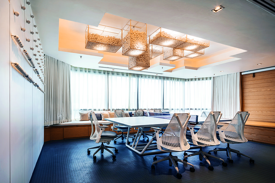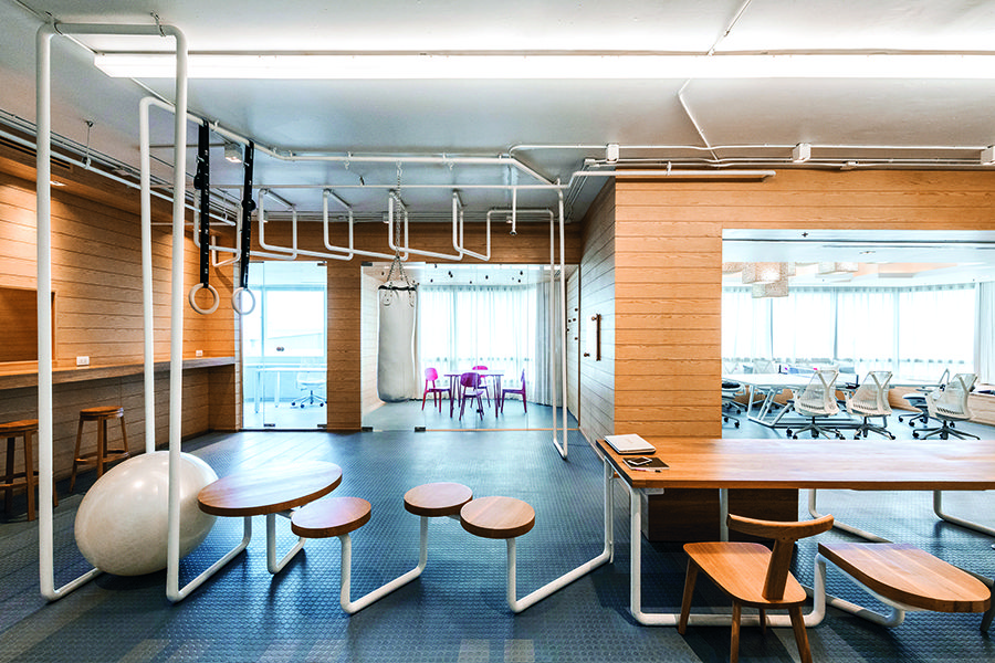 เริ่มตั้งแต่การวางตำแหน่งโต๊ะทำงานส่วนกลาง สำหรับรองรับจำนวนพนักงานบางส่วนจากทั้งหมด 60 ชีวิตที่ว่างเว้นจากการไปปฏิบัติหน้าที่ดูแลงานระบบไอทีให้กับบริษัทลูกค้า ให้สามารถหมุนเวียนกันมาเลือกที่นั่งทำงาน พร้อมกับแล็ปท็อปส่วนตัวได้อย่างอิสระ ซึ่งในส่วนนี้มีการดีไซน์ท่อเหล็กสีขาวให้เกิดการไหลเวียนต่อเนื่องเป็นเส้นสายเดียวกัน โดยเป็นทั้งมือจับประตูทางเข้าโครงสร้างโต๊ะ และเก้าอี้ที่มีฟังก์ชันเสริมเป็น Box Jump และ Spinning Chair สำหรับการทำกายบริหารท่าง่ายไปจนถึง Monkey Bars สำหรับห้อยโหน และ Gymnastic Rings สำหรับคนชอบโลดโผนท่ายาก เป็นต้น